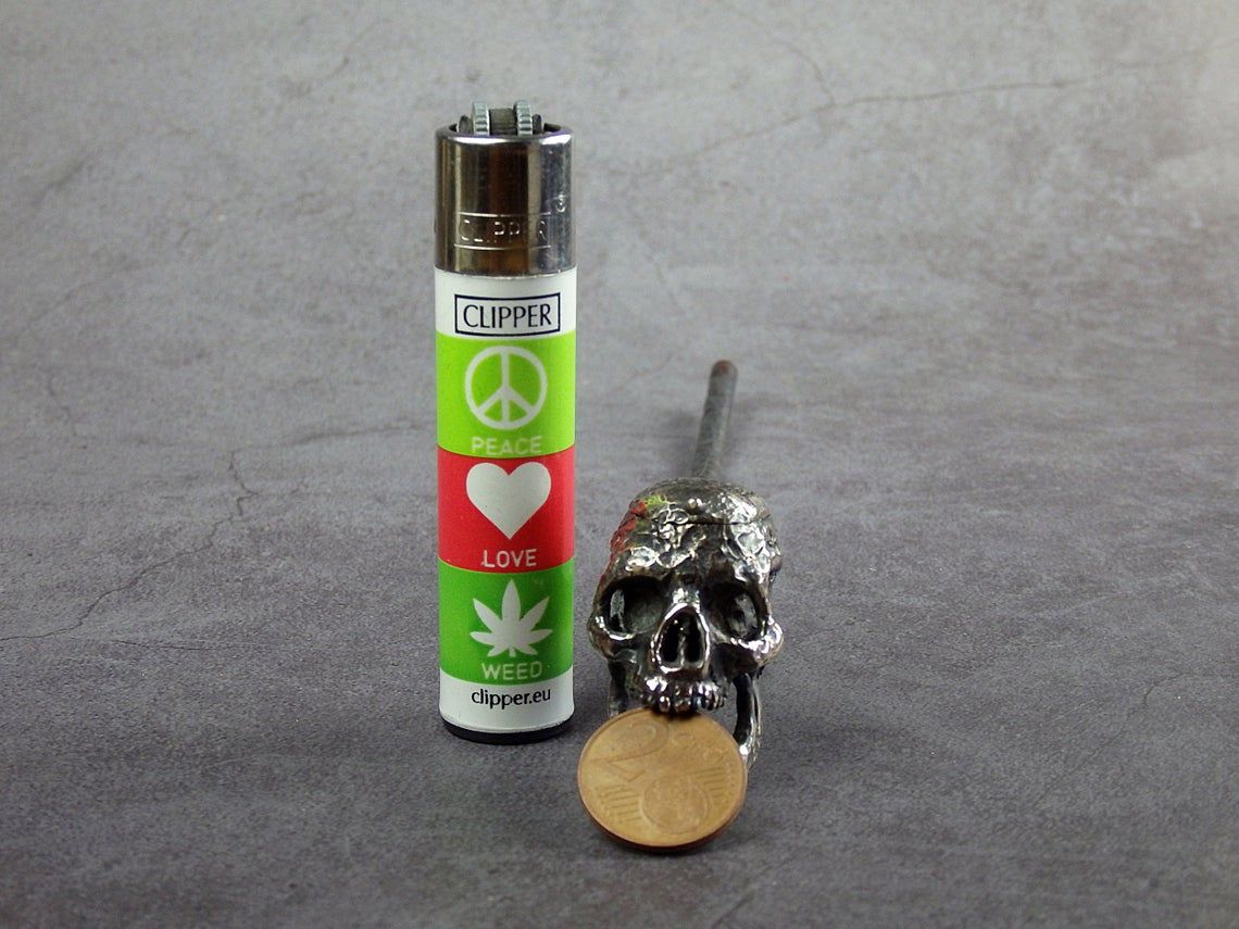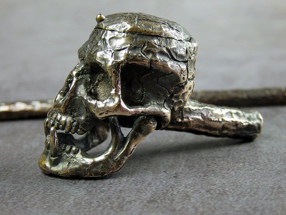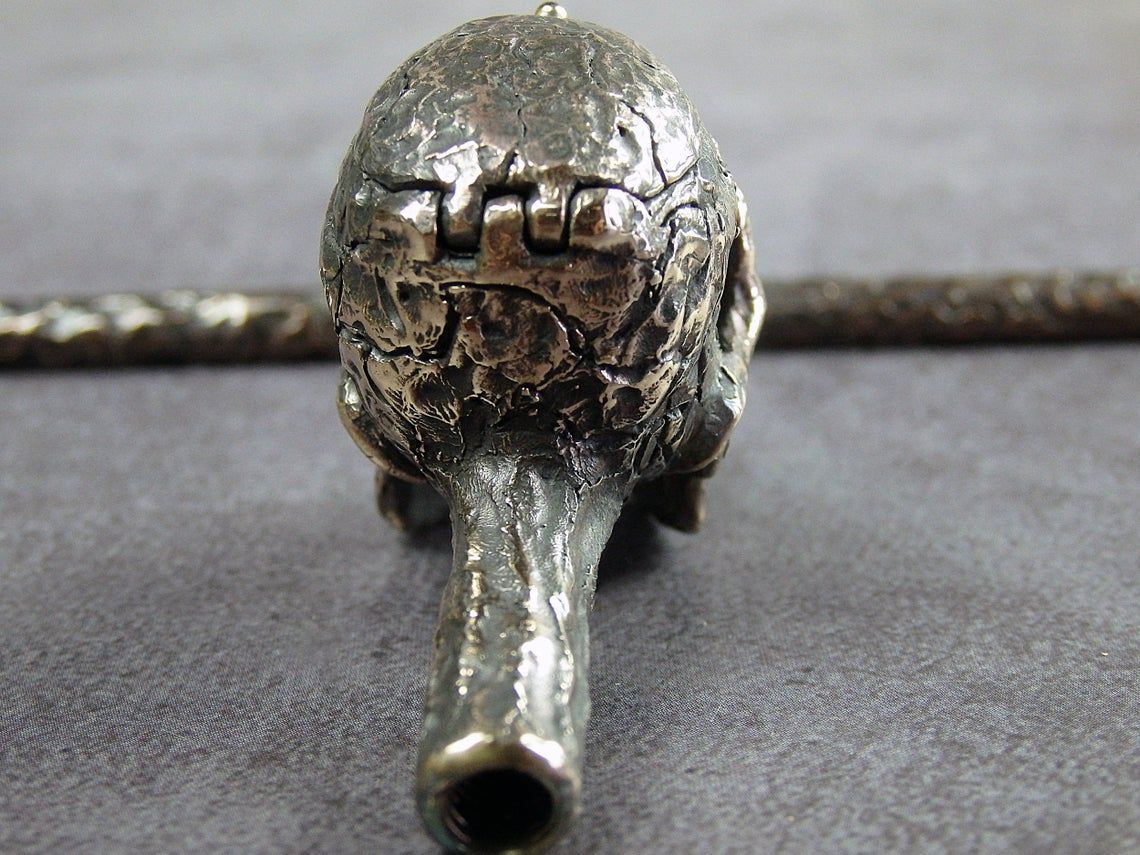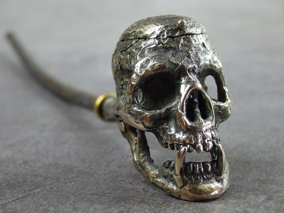 Bronze smoking pipe with a bowl in the shape of fanged skull. The skull has an opening lid and a movable lower jaw, so this is not only a smoking accessory, but also a wonderful souvenir. The mouthpiece is made of copper, it is screwed on, can have a length (from 3 to 30 cm) and a shape at the request of the buyer. The pipe is working, not decorative, the model is tested by the master.
