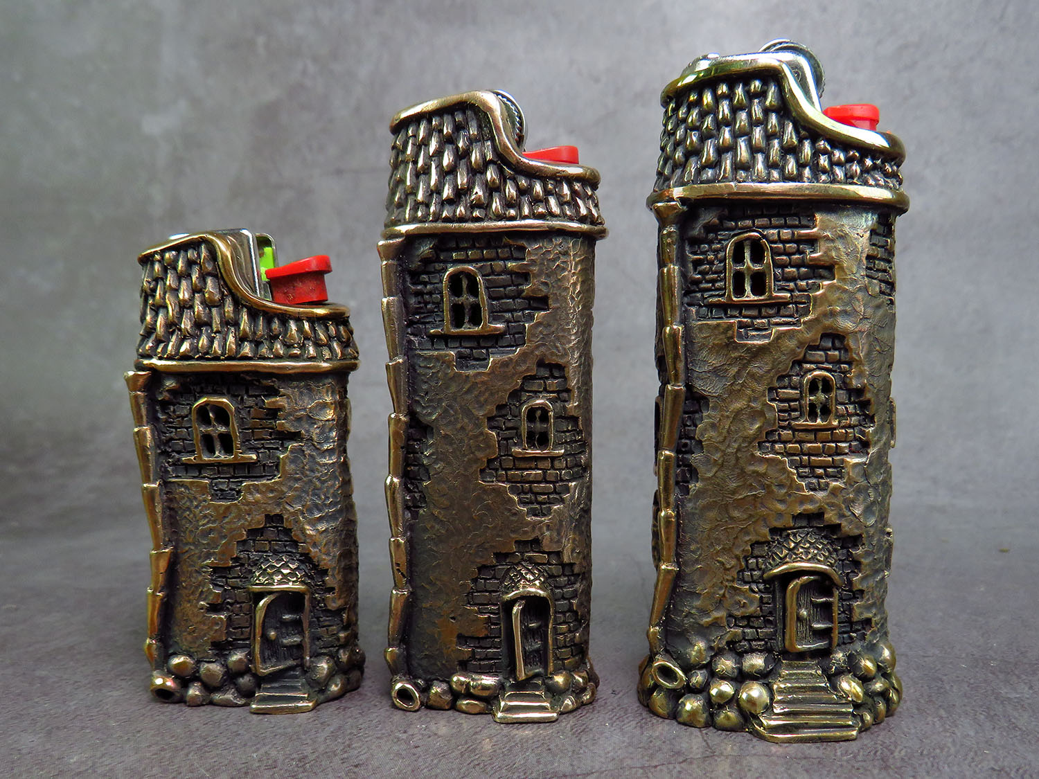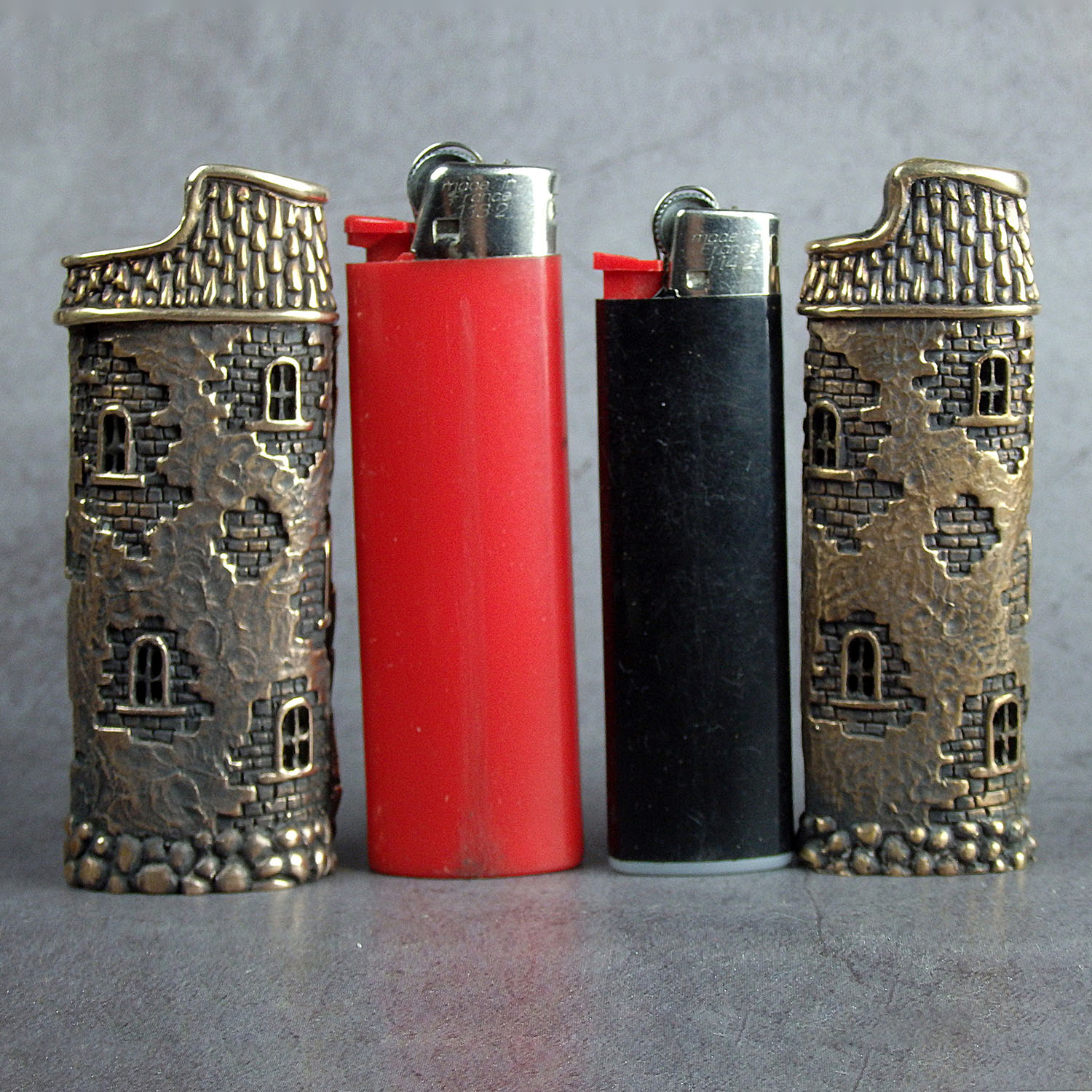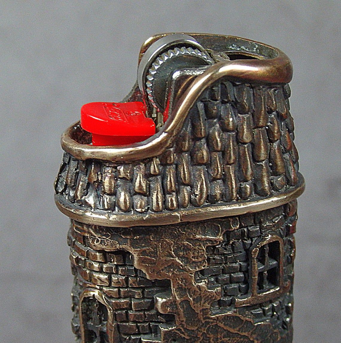 Bronze cover for a disposable lighter (J3 and similar) in the form of a medieval tower.