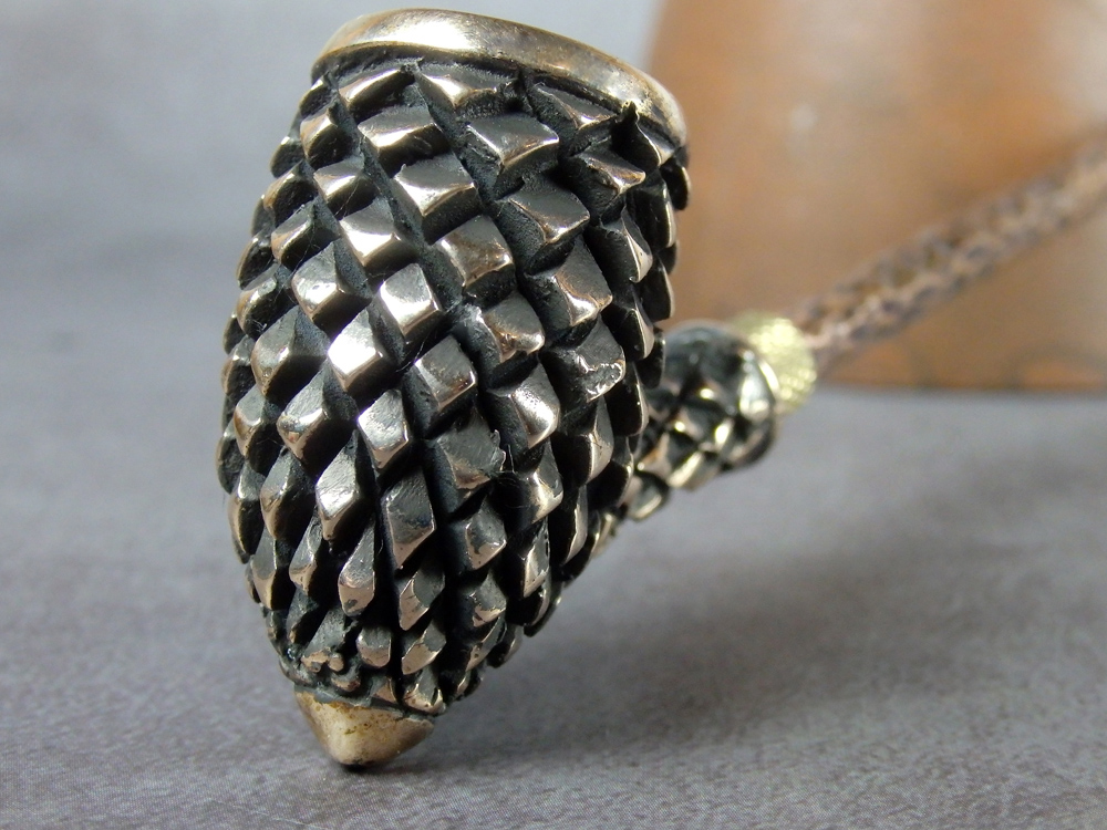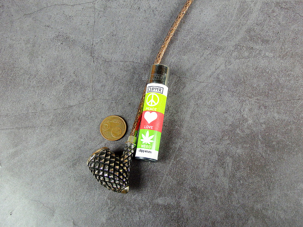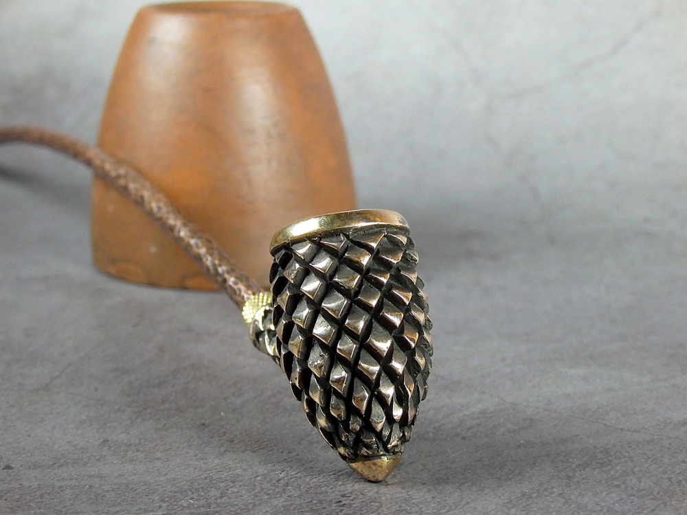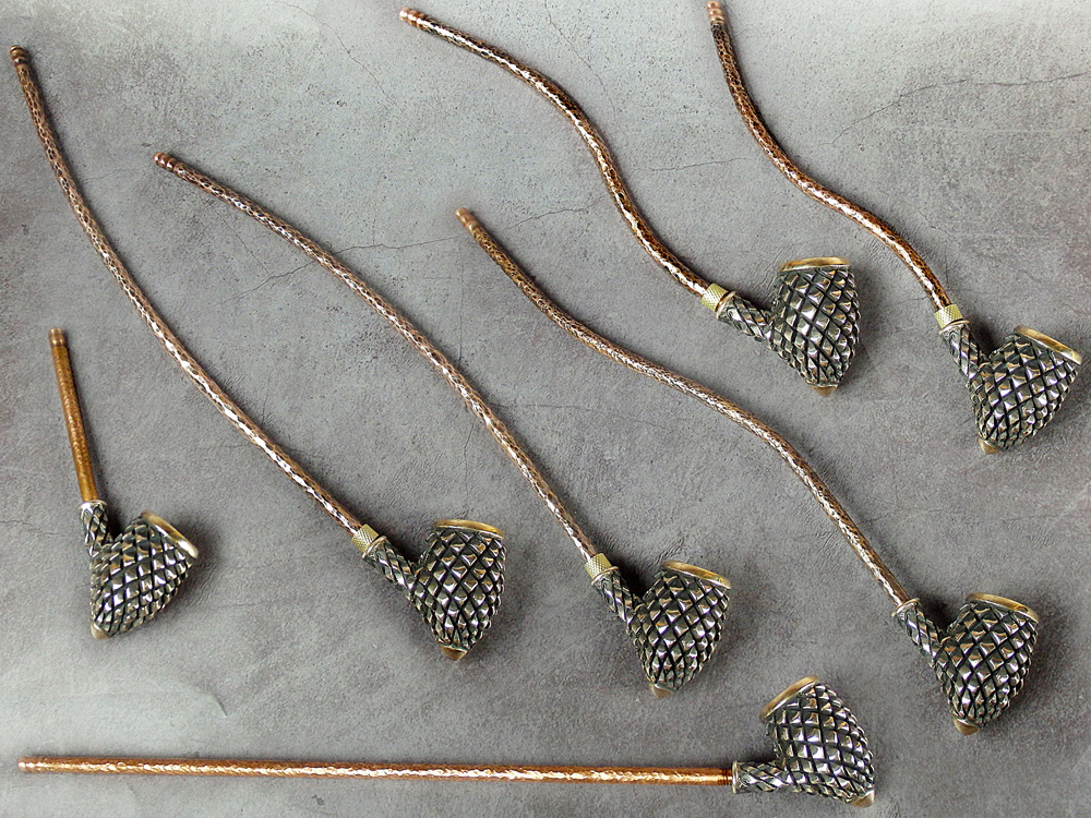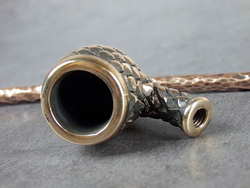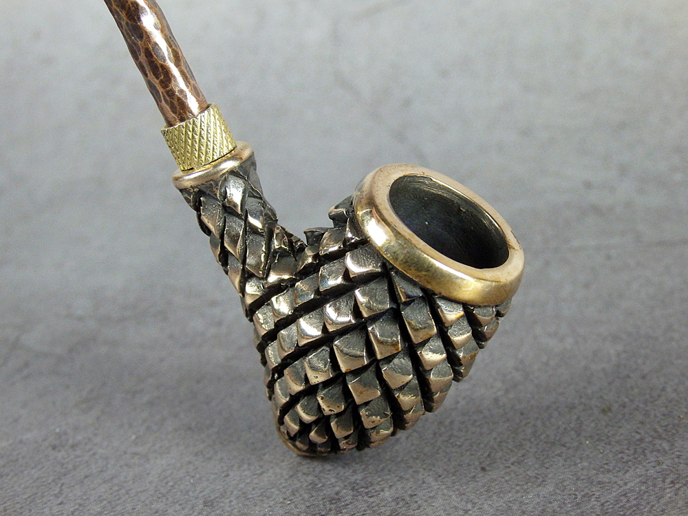 Churchwarden bronze pipe bowl in the shape of fir cone. The mouthpiece is made of copper, it is screwed on, can have a length (from 5 to 30 cm) and a shape at the request of the buyer. The pipe is working, not decorative, the model is tested by the master.