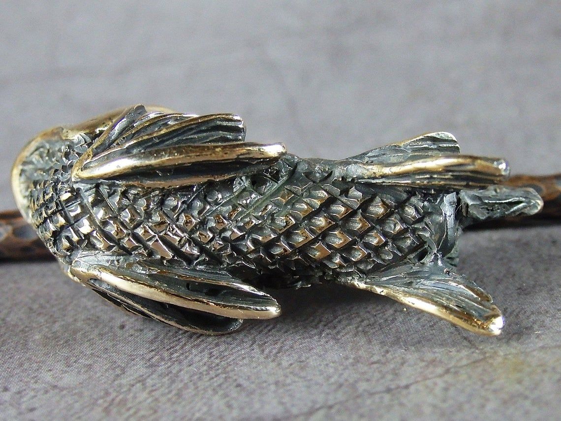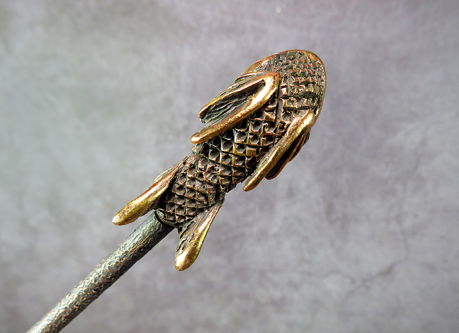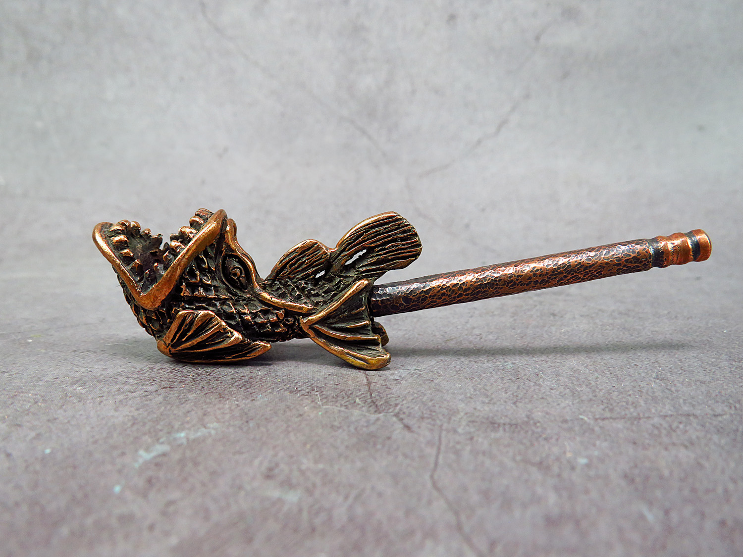 Bronze smoking pipe with a bowl in the shape of open mouth fish. The mouthpiece is made of copper, it is screwed on, can have a length (from 3 to 30 cm) and a shape at the request of the buyer. The pipe is working, not decorative, the model is tested by the master.