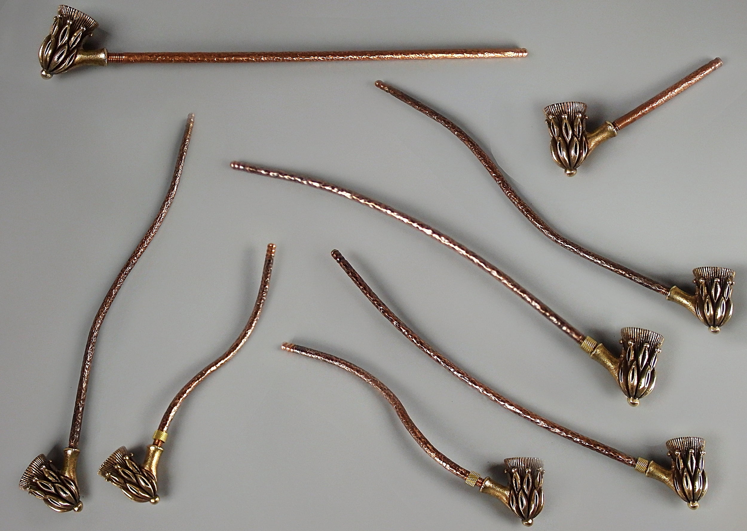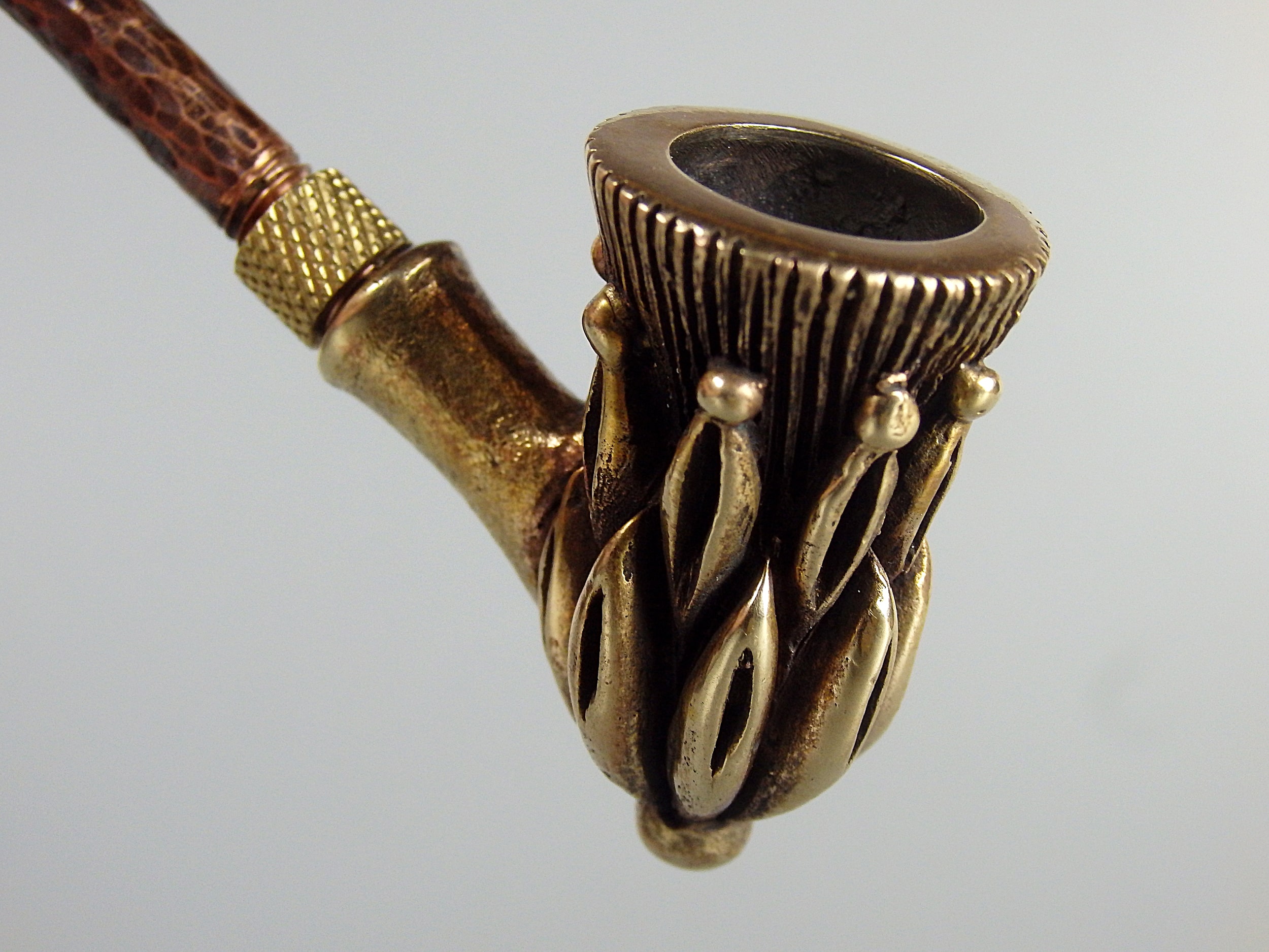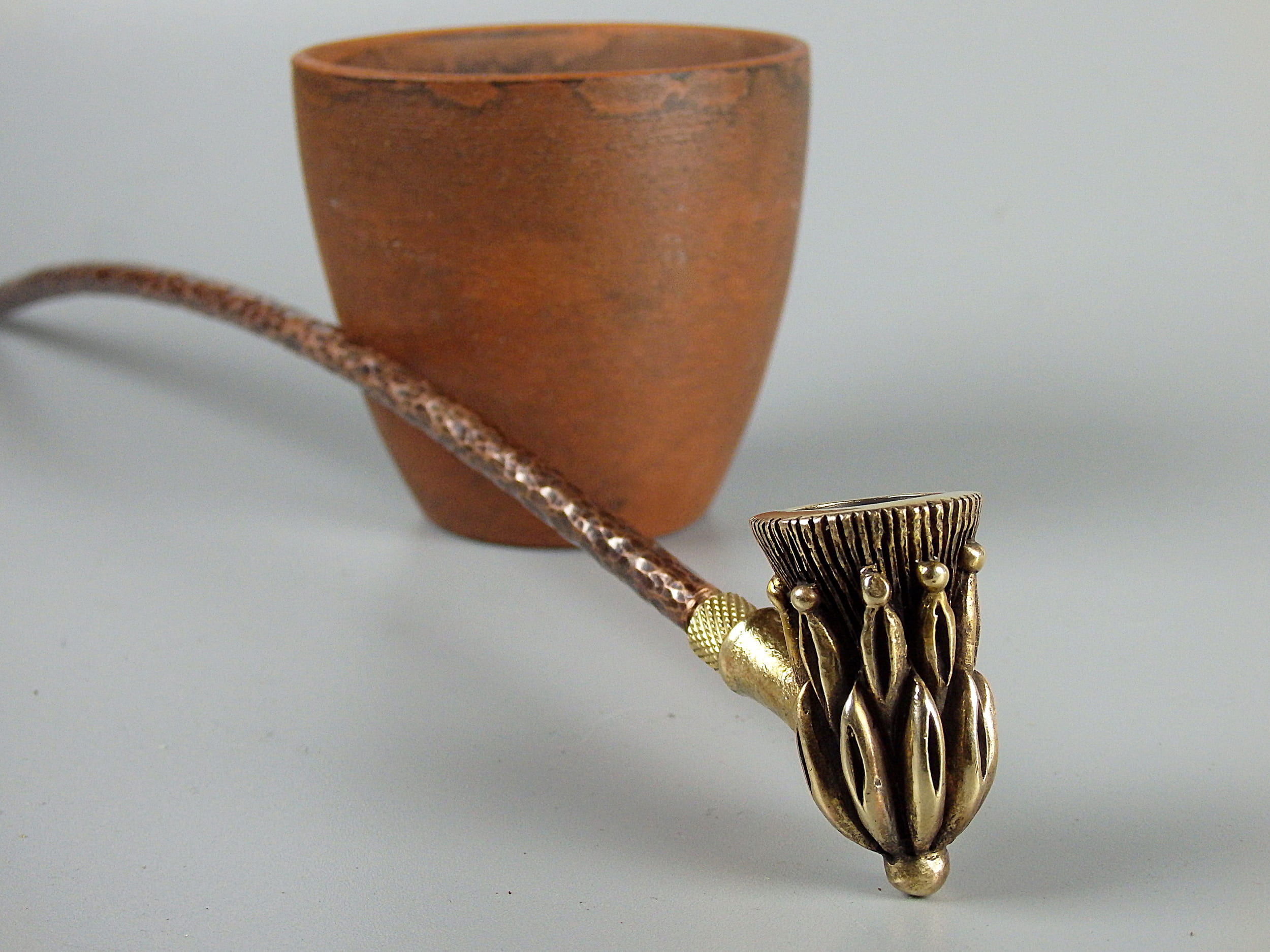 Freehand churchwarden bronze pipe in the shape of an exotic flower. The mouthpiece is made of copper, it is screwed on, can have a length (from 5 to 30 cm) and a shape at the request of the buyer. The pipe is working, not decorative, the model is tested by the master.