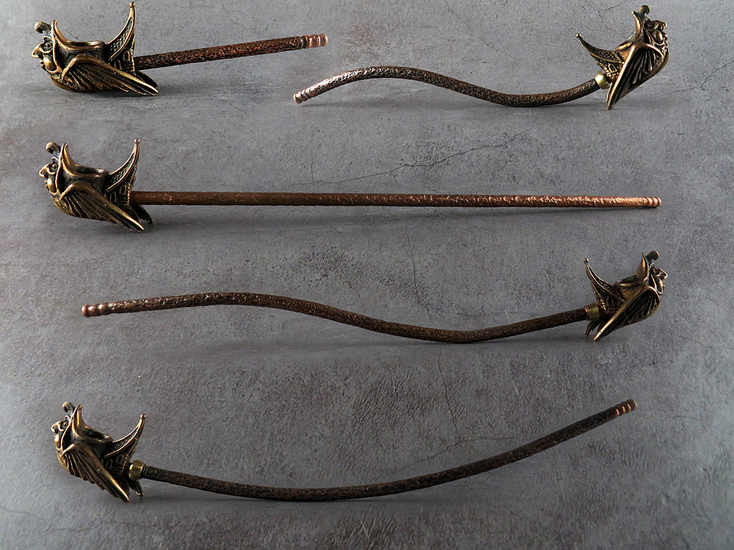 The mouthpiece is made of copper, it is screwed on, can have a length (from 5 to 30 cm) and a shape at the request of the buyer. The pipe is working, not decorative, the model is tested by the master.