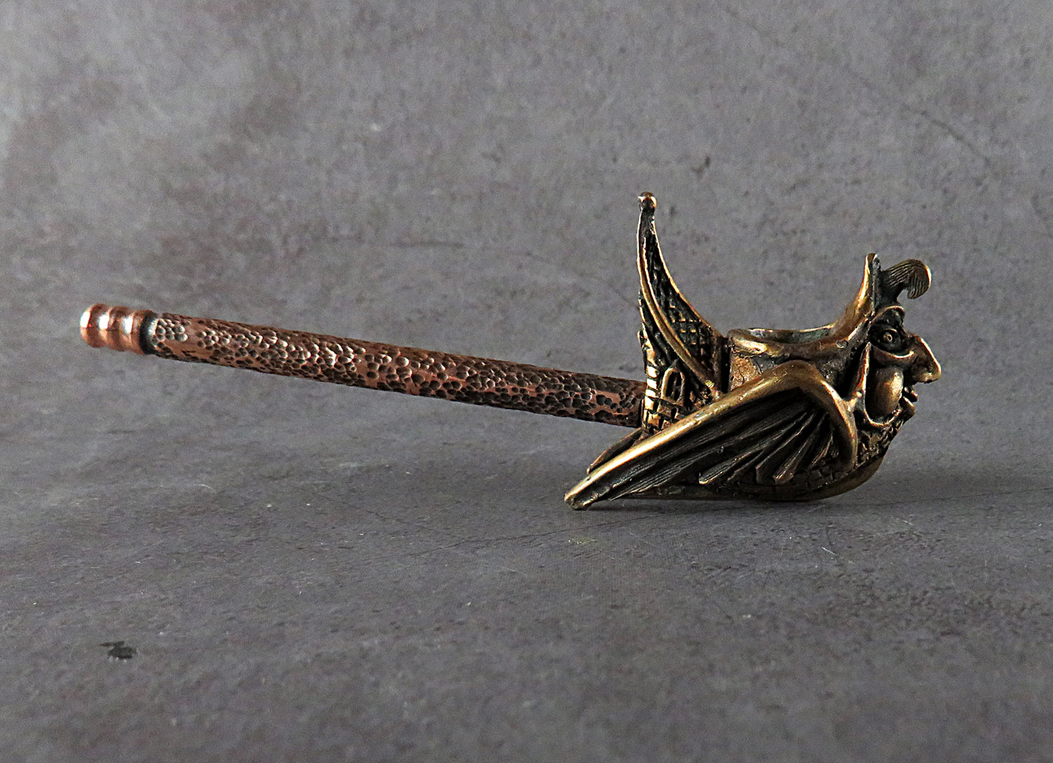 Creative bronze pipe in the form of a small fairy-tale flying ship. The mouthpiece is made of copper, it is screwed on, can have a length (from 3 to 30 cm) and a shape at the request of the buyer.