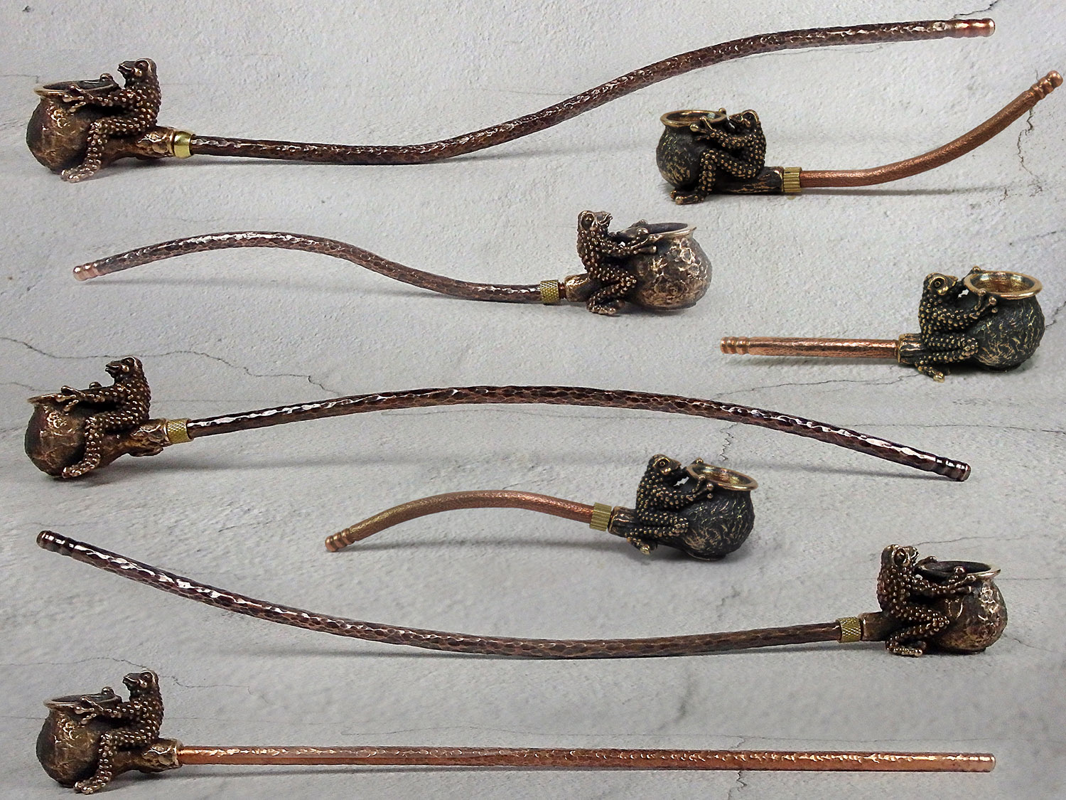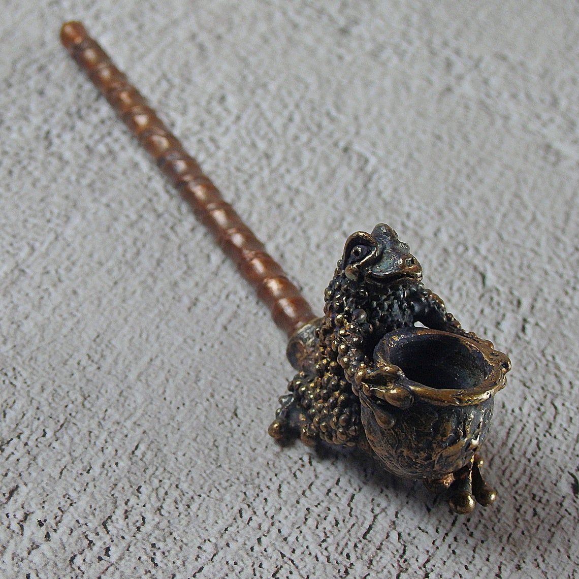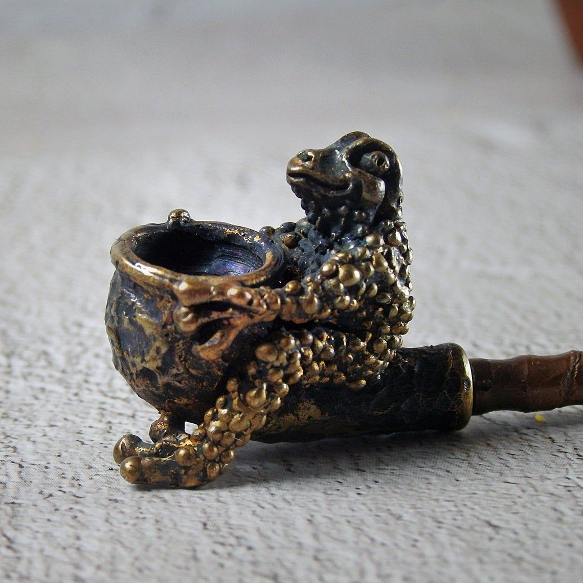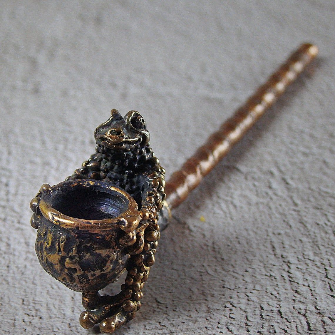 Small bronze smoking pipe with bowl in the shape of a frog that hugs a pipe. The mouthpiece is made of copper, it is screwed on, can have a length (from 3 to 30 cm) and a shape at the request of the buyer. The pipe is working, not decorative, the model is tested by the master.
