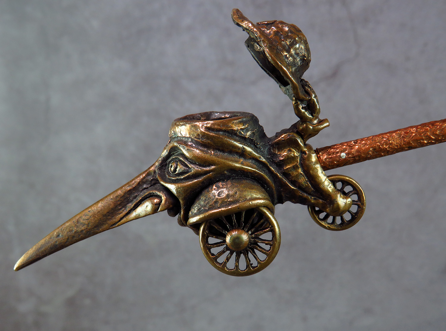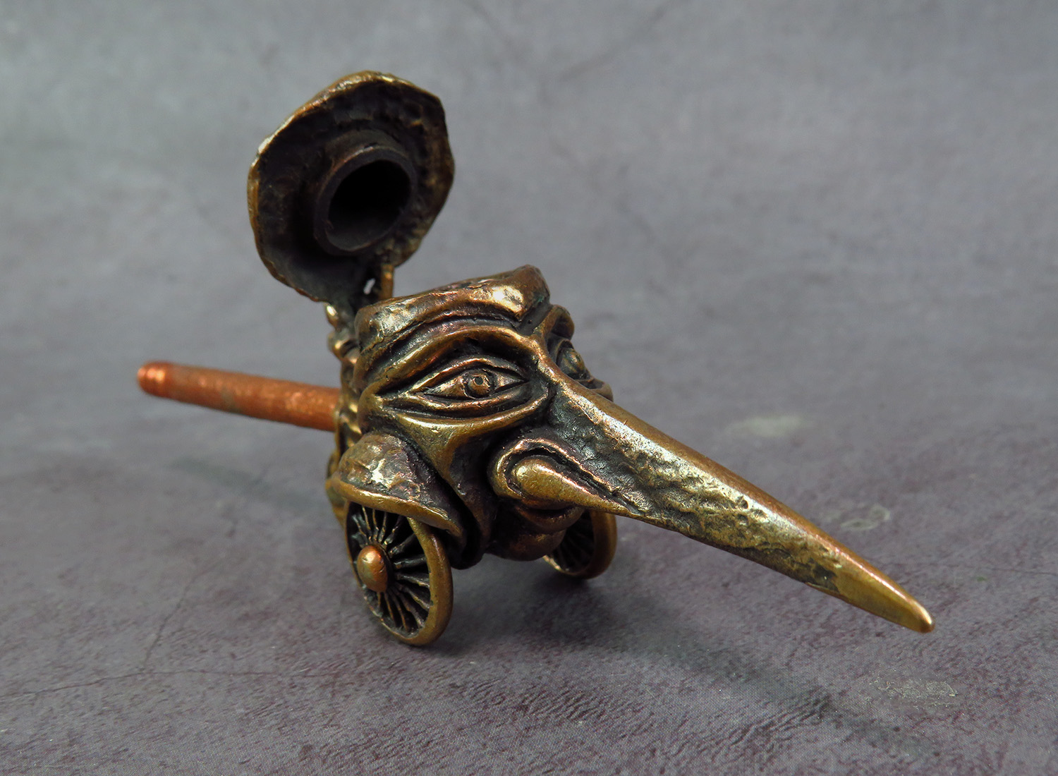 Big bronze smoking pipe with a bowl in the shape of a long-nosed head on wheels. This is a big pipe for the company and participants can roll it around the table, passing each other like a peace pipe. This is not only a smoking accessory, but also a wonderful souvenir. The mouthpiece is made of copper, it is screwed on, can have a length (from 3 to 30 cm) and a shape at the request of the buyer. The pipe is working, not decorative, the model is tested by the master.