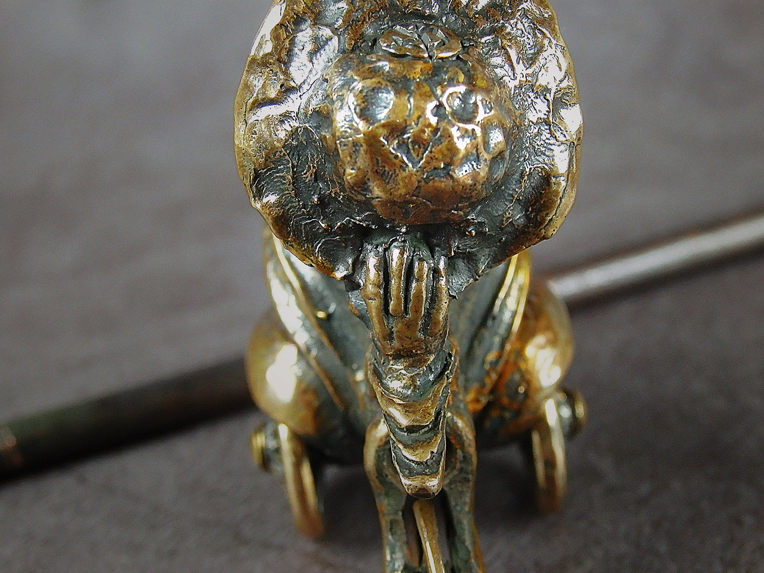 To make this item, a wax model was cut out by hand. Then, using the lost wax method, bronze parts were cast.