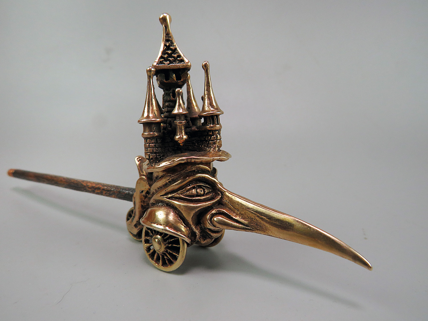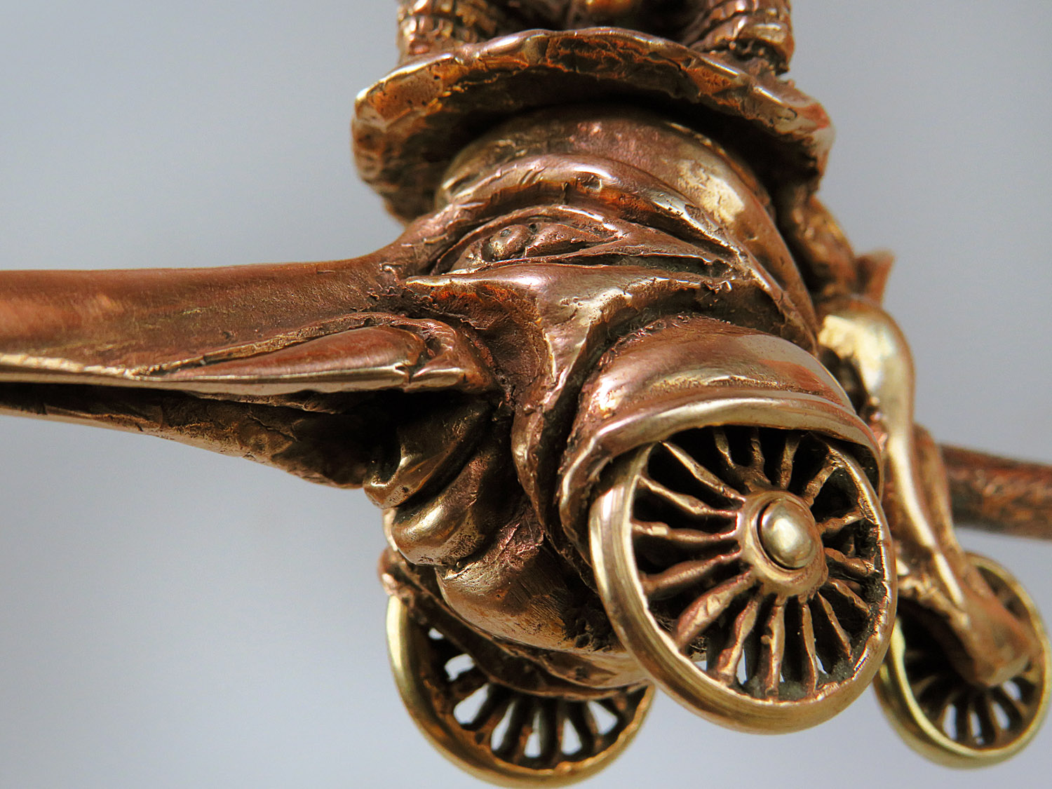 To make this item, a wax model was cut out by hand. Then, using the lost wax method, bronze parts were cast.