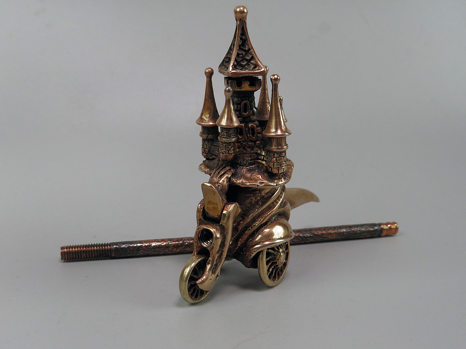 Big mobile smoking pipe with a bowl in the shape of big-nosed head with towers on the hat. This is a large pipe on wheels, designed specifically for the company, and participants can roll it around the table, passing each other like a world pipe. This is not only a smoking accessory, but also a wonderful souvenir. The mouthpiece is made of copper, it is screwed on, can have a length (from 3 to 30 cm) and a shape at the request of the buyer. The pipe is working, not decorative, the model is tested by the master.