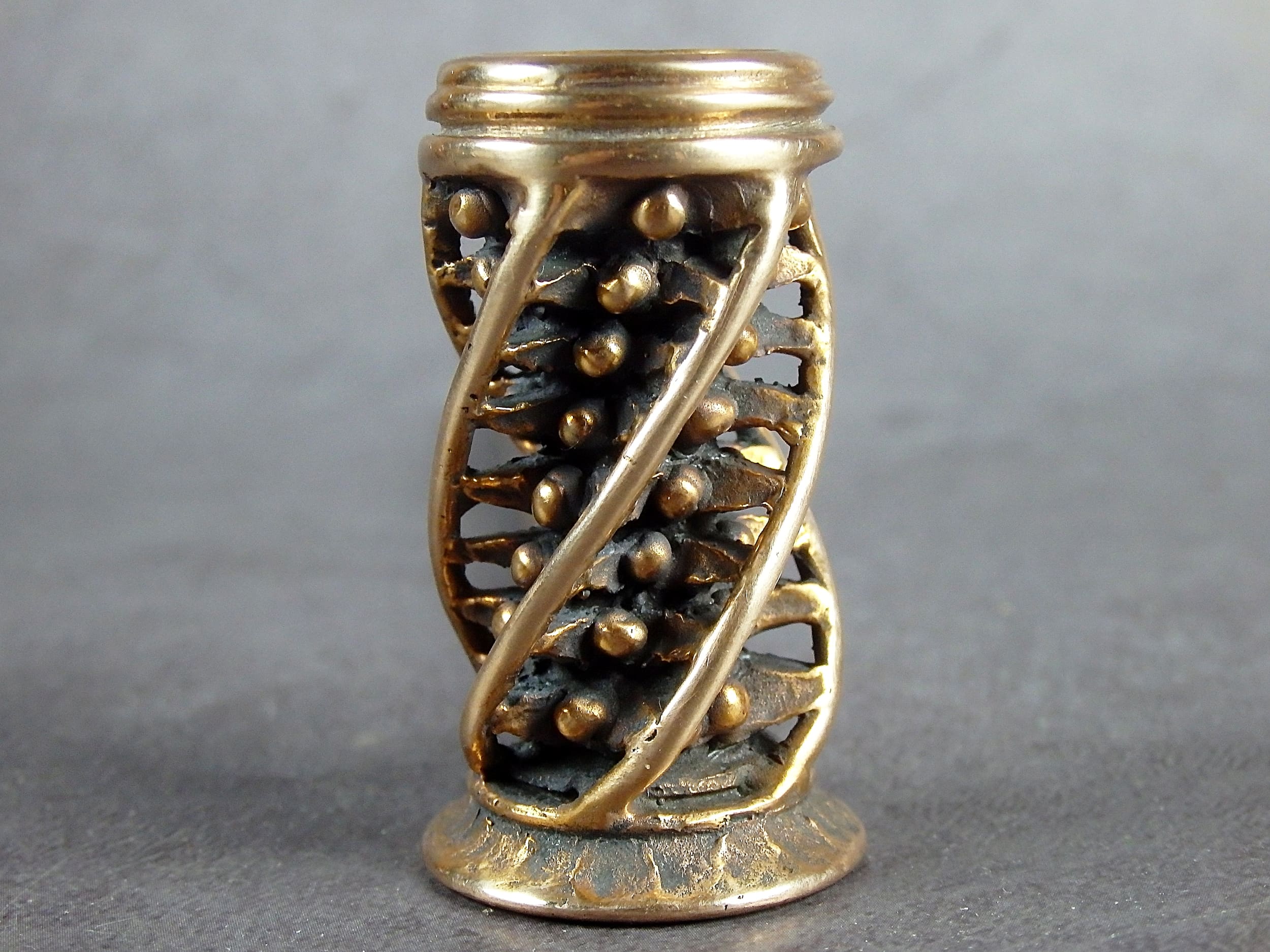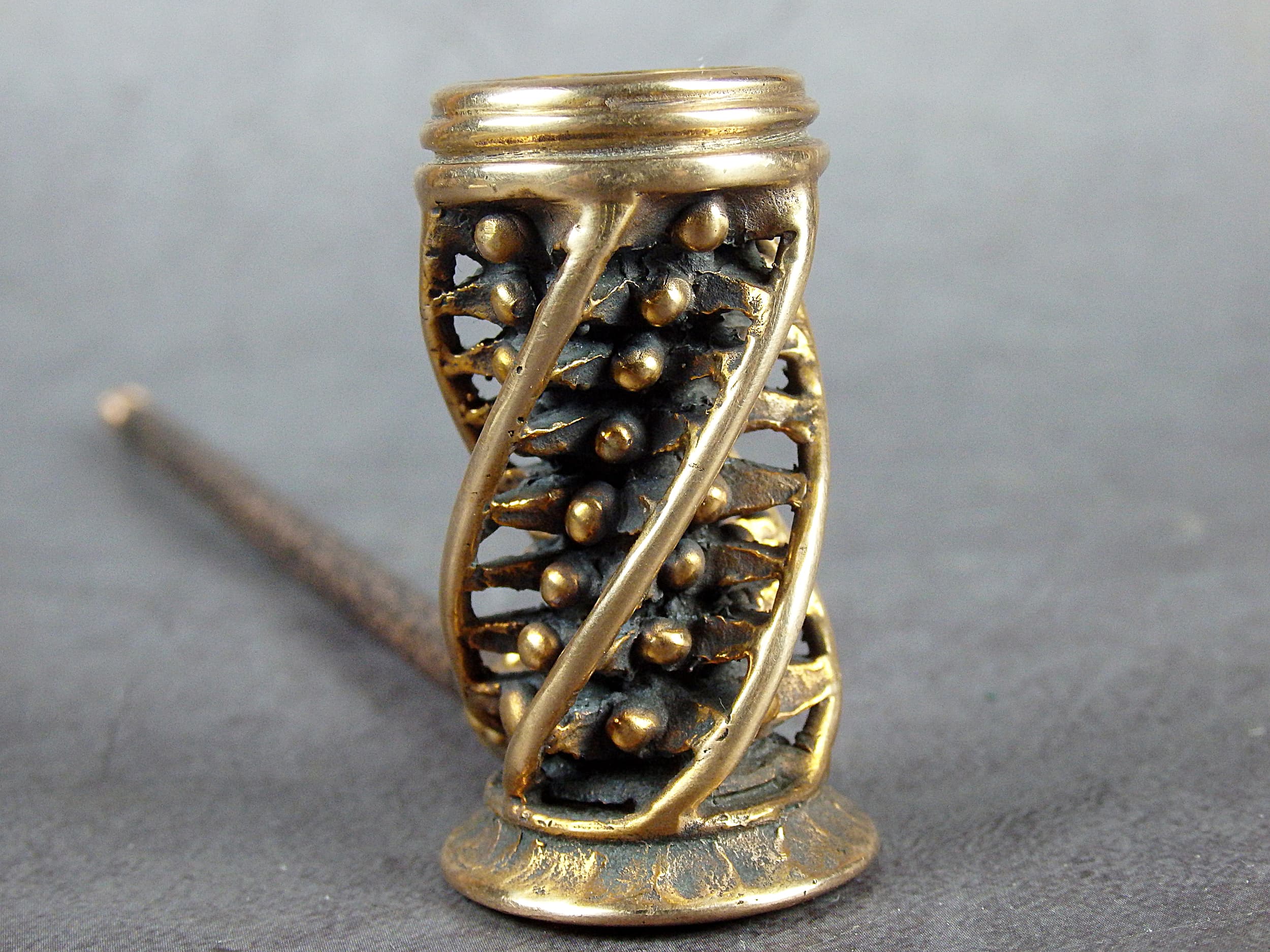 To make this item, a wax model was cut out by hand. Then, using the lost wax method, bronze parts were cast.