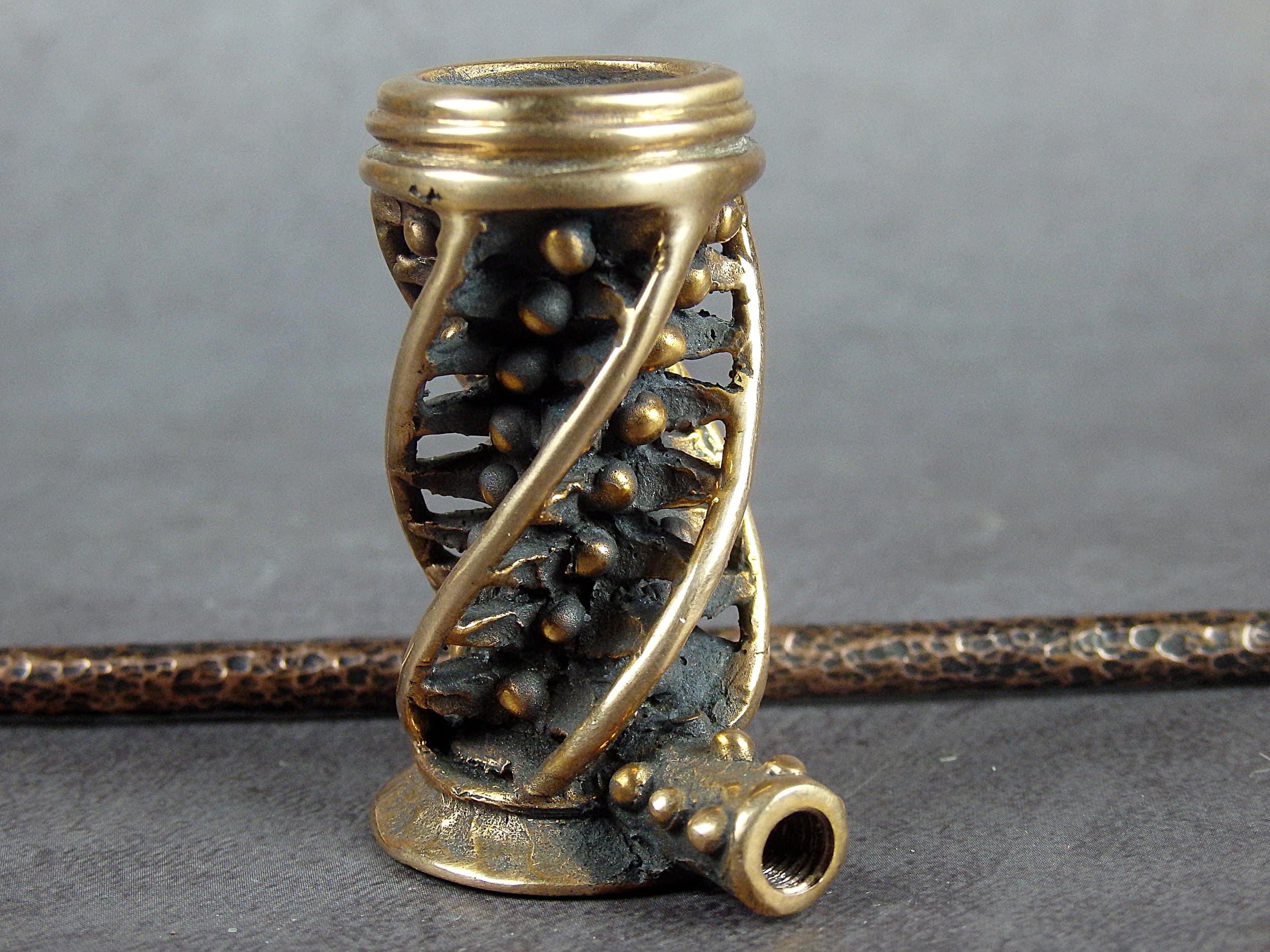 High bronze smoking pipe with an unusual spiral design. The mouthpiece is made of copper, it is screwed on, can have a length (from 3 to 30 cm) and a shape at the request of the buyer. The pipe is working, not decorative, the model is tested by the master.