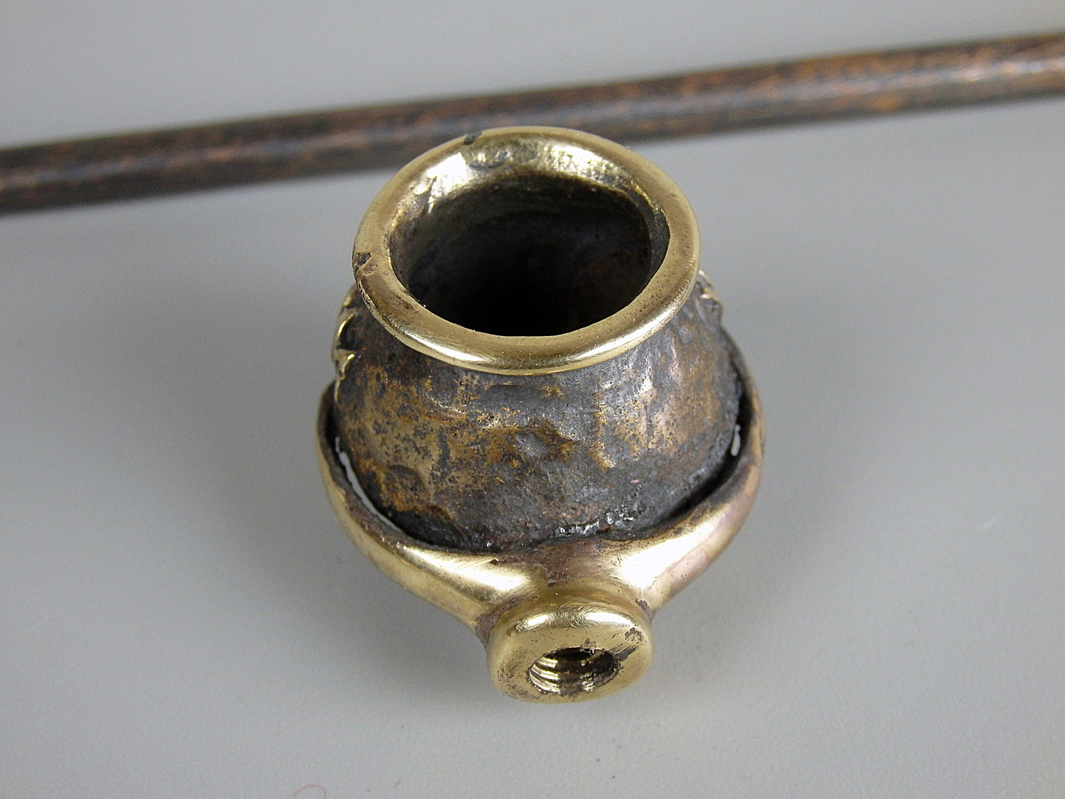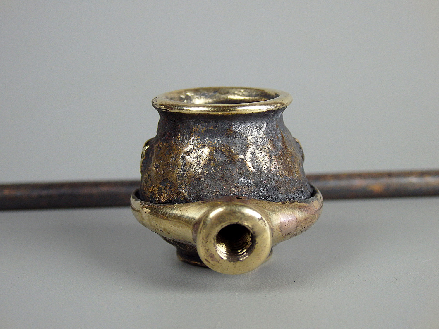 To make this item, a wax model was cut out by hand. Then, using the lost wax method, bronze parts were cast.