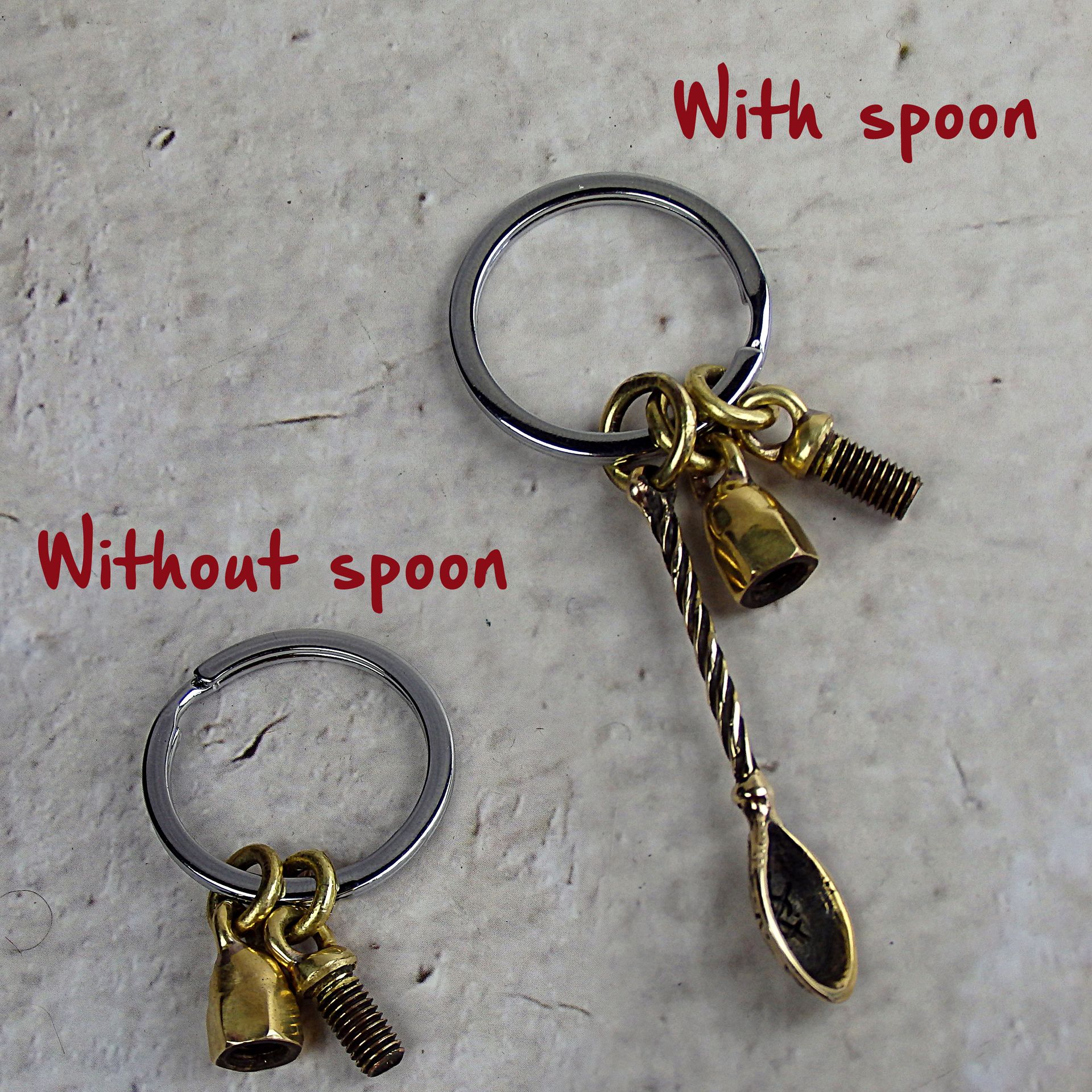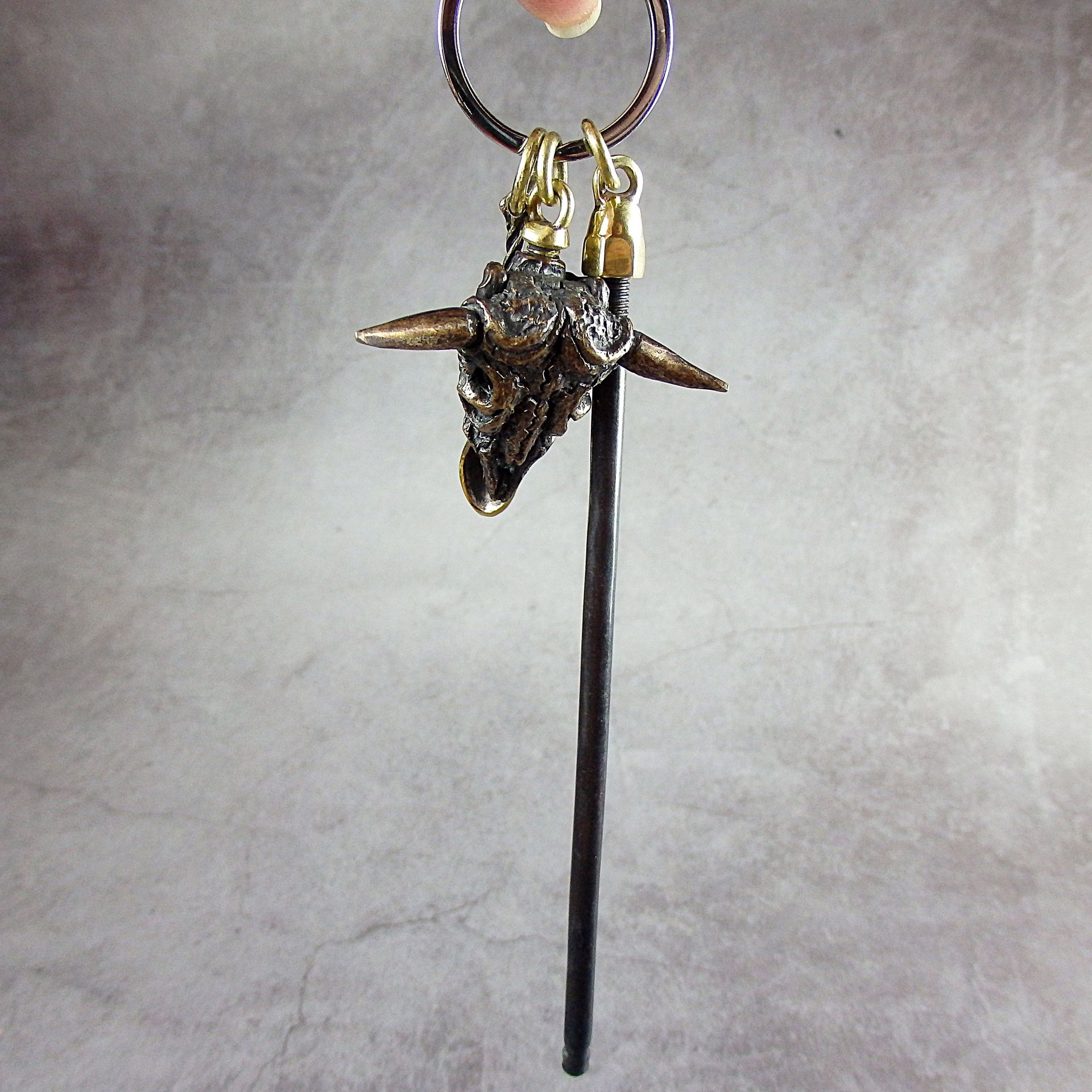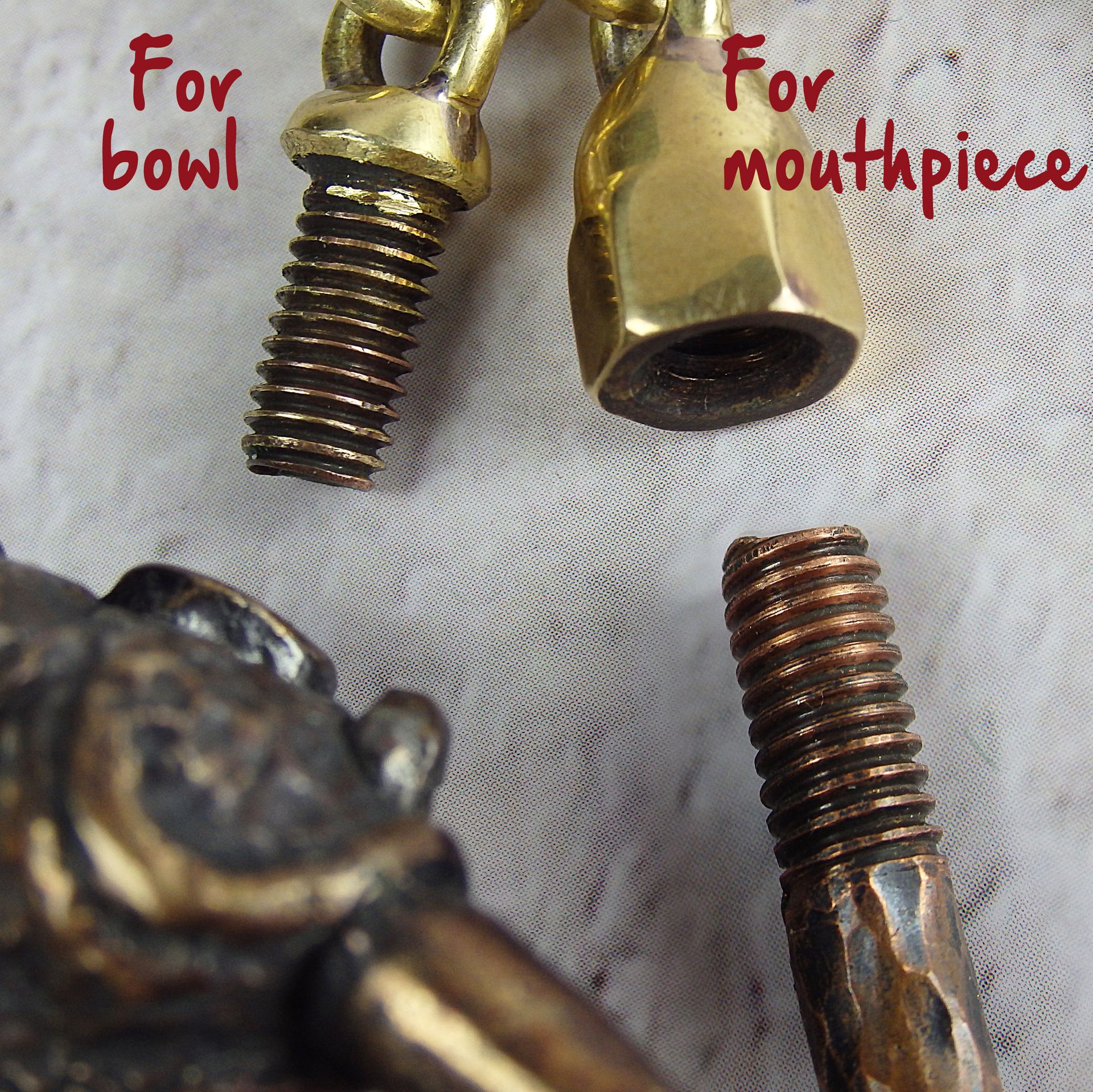 Smoking pipe keychain with ring and nozzles for the bowl of the pipe and mouthpiece. With it the pipe and the mouthpiece can be suspended on a chain or carabiner. The set has two options - with and without a spoon. If desired, can add additional attachments or loops for a spare bowl, mouthpiece, pouch or other accessory. If you require this, please contact me.