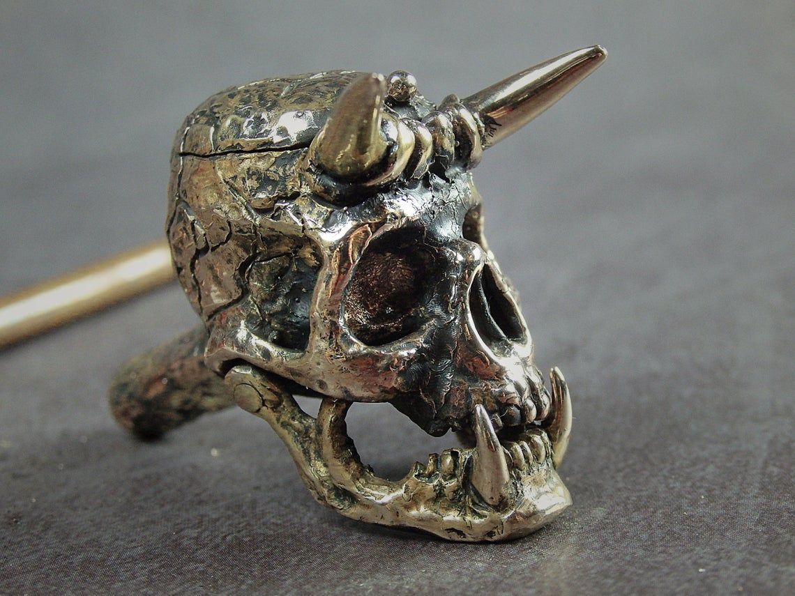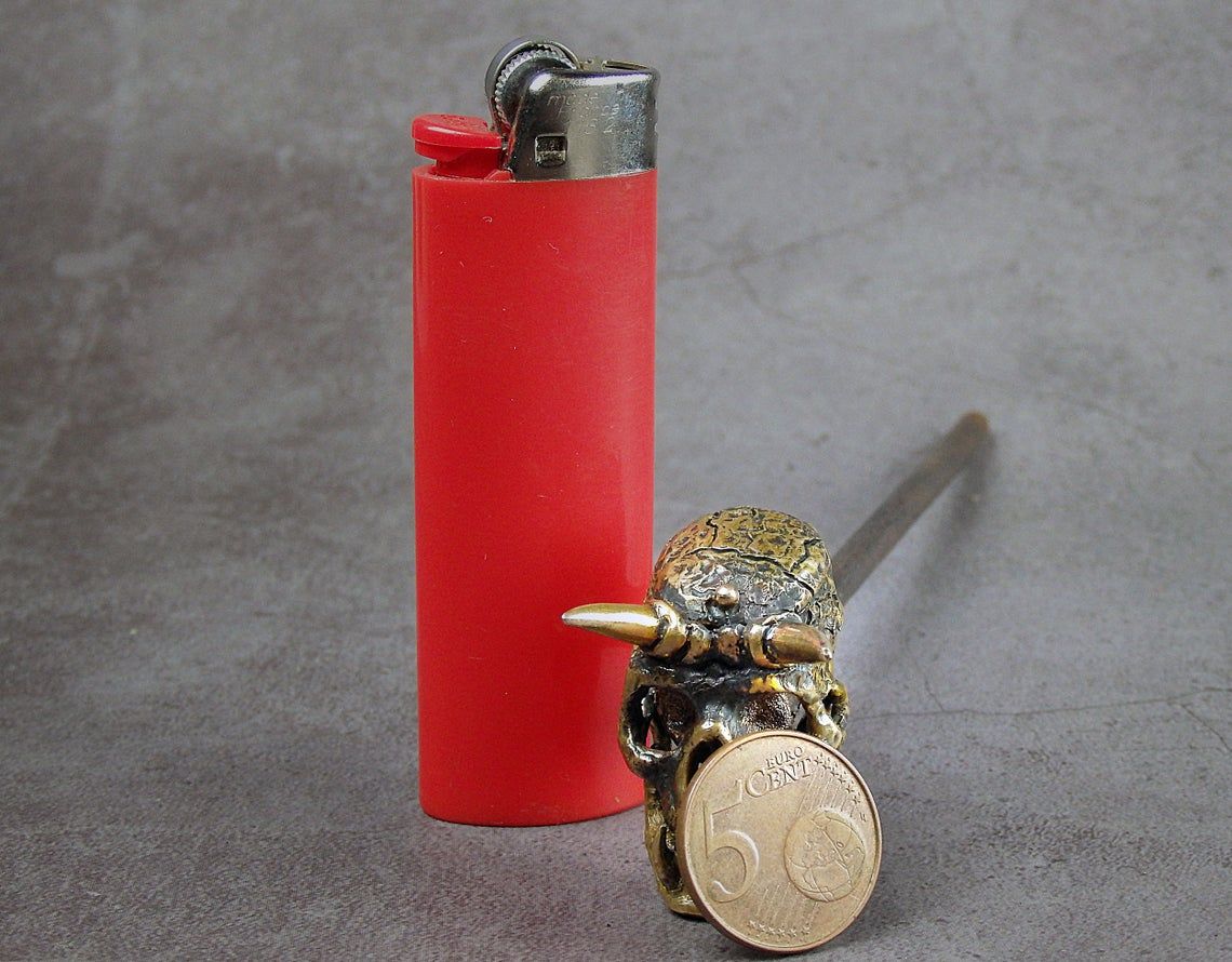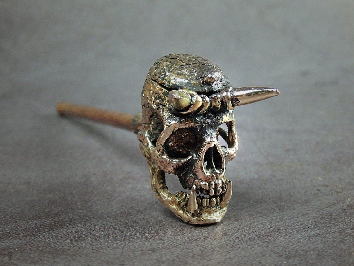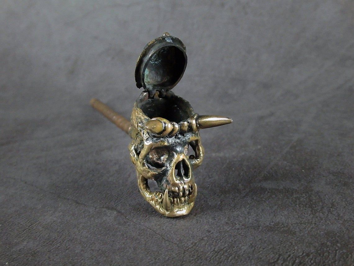 Bronze smoking pipe with a bowl in the shape of a infernal horned skull. The skull has an opening lid and a movable lower jaw, so this is not only a smoking accessory, but also a wonderful souvenir. The mouthpiece is made of copper, it is screwed on, can have a length (from 3 to 30 cm) and a shape at the request of the buyer. The pipe is working, not decorative, the model is tested by the master.