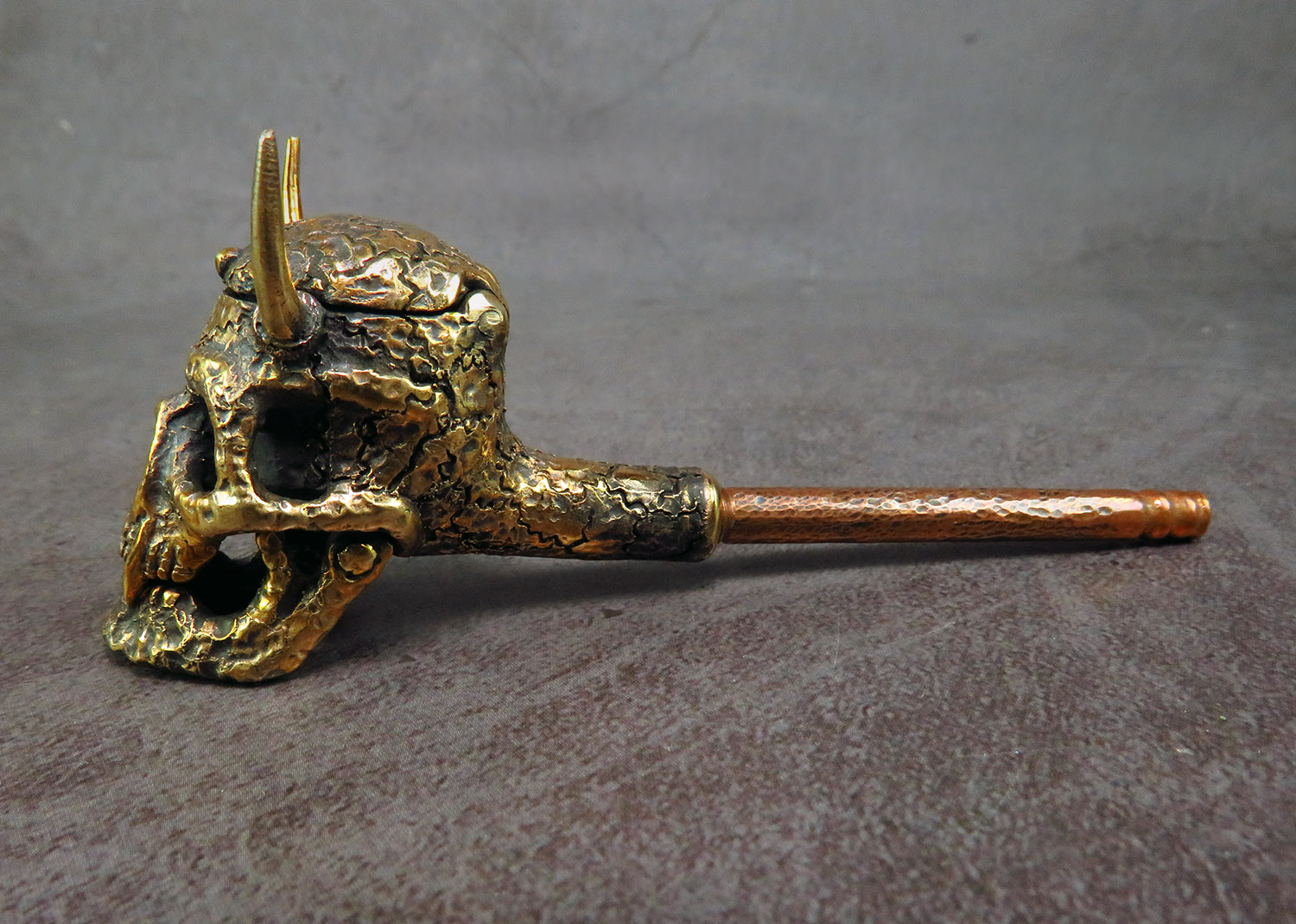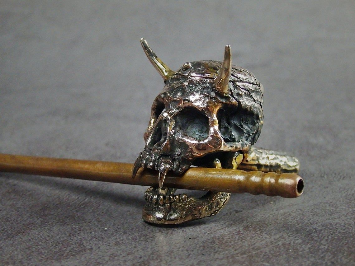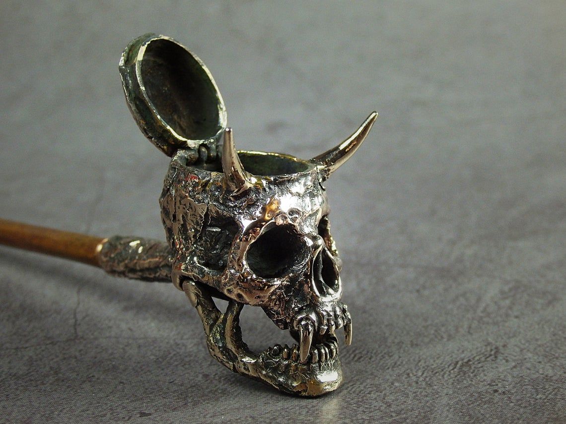 Bronze smoking pipe with a bowl in the shape of a infernal horned skull. The skull has an opening lid and a movable lower jaw, so this is not only a smoking accessory, but also a wonderful souvenir. The mouthpiece is made of copper, it is screwed on, can have a length (from 3 to 30 cm) and a shape at the request of the buyer. The pipe is working, not decorative, the model is tested by the master.