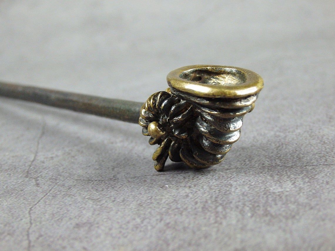 Bronze smoking pipe with a bowl in the shape of ram horns. The mouthpiece is made of copper, it is screwed on, can have a length (from 3 to 30 cm) and a shape at the request of the buyer. The pipe is working, not decorative, the model is tested by the master.