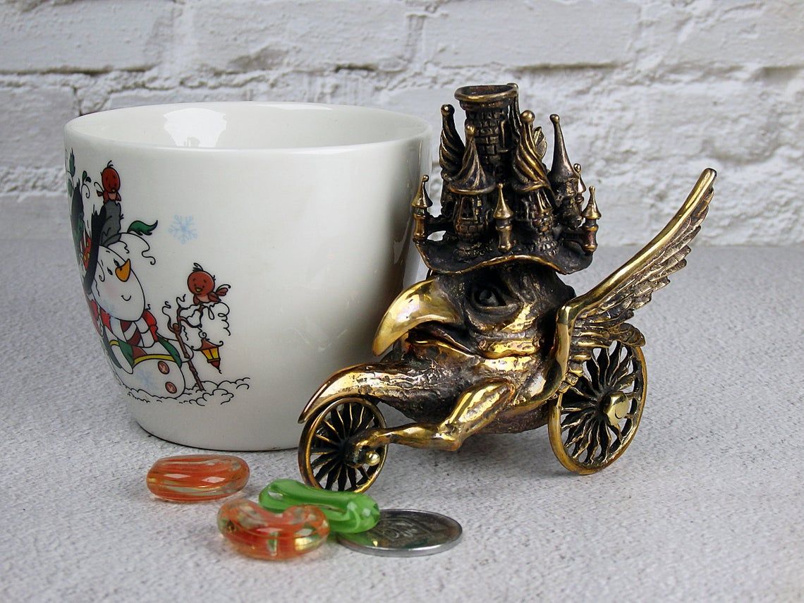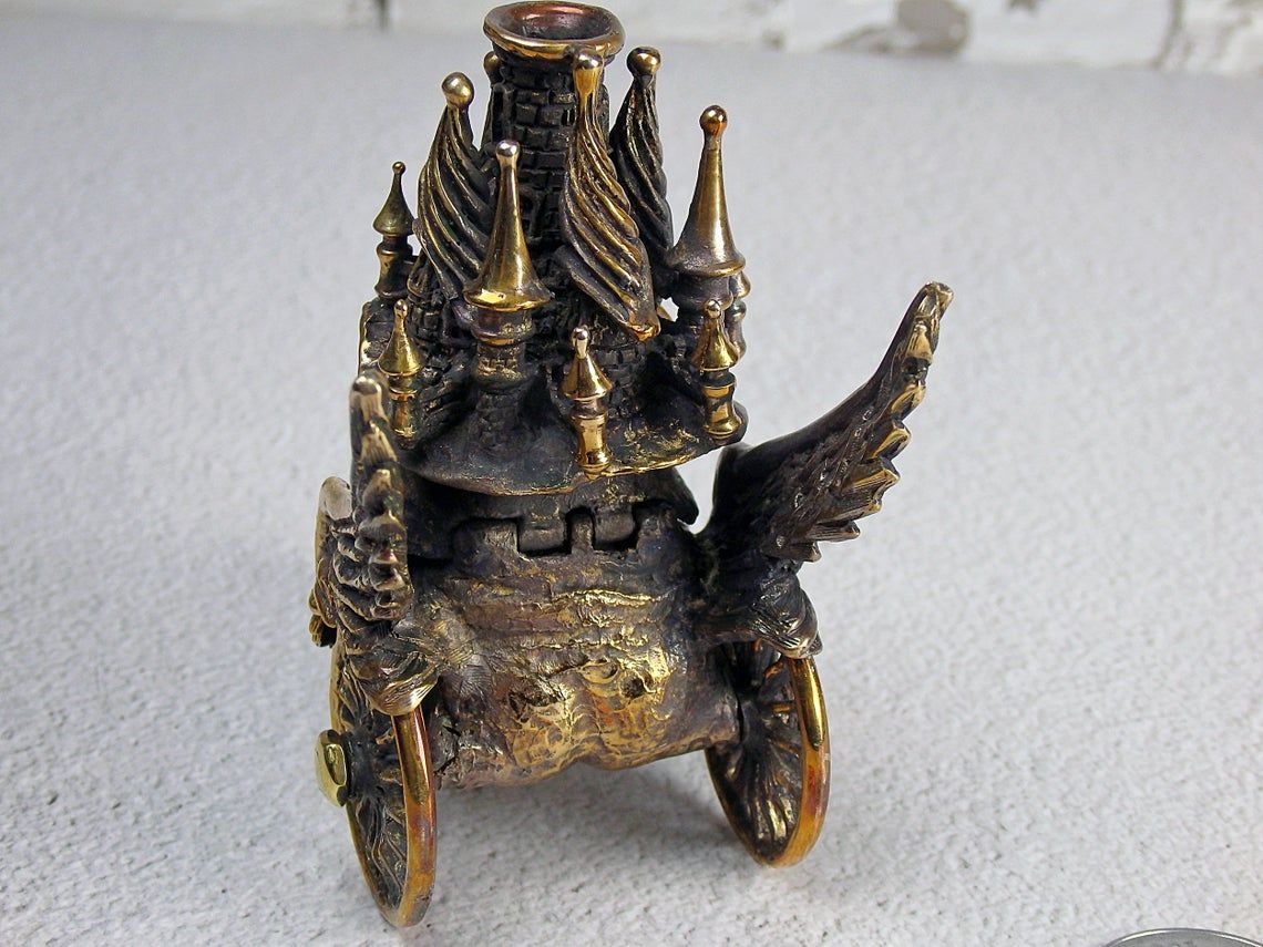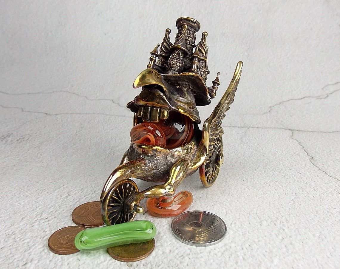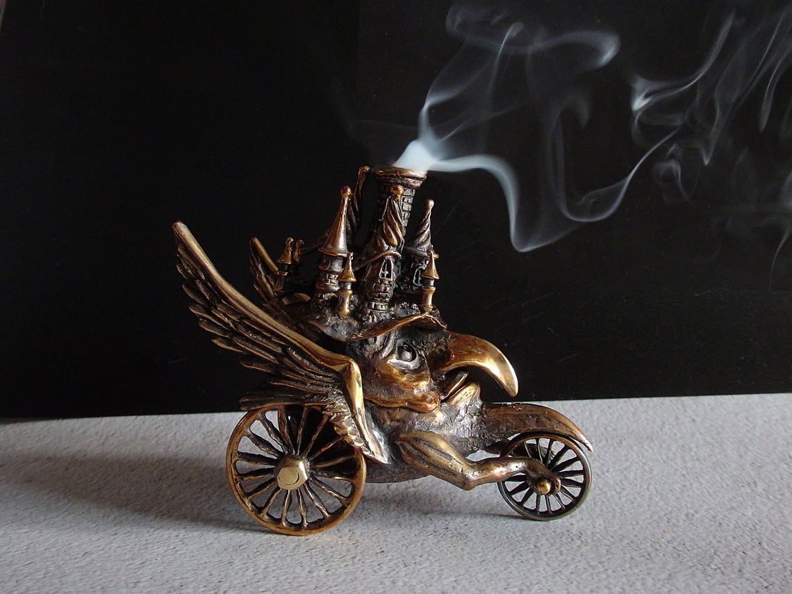This surreal bronze thing on wheels can perform different functions. It can be used as a holder for incense sticks or pyramids, as a fun piggy bank or a small desktop waste basket. Tobacco lovers can use it instead of an ashtray, and jewelry owners - as a storehouse for jewelry or small items.