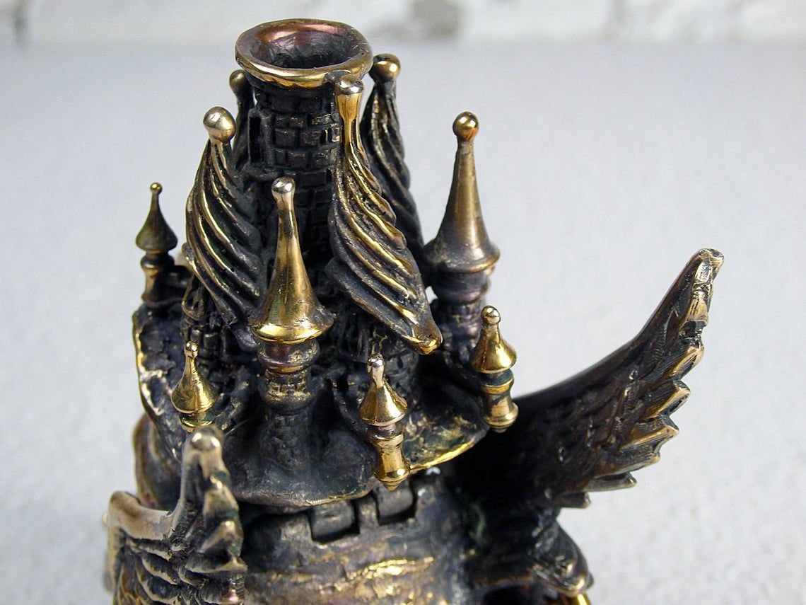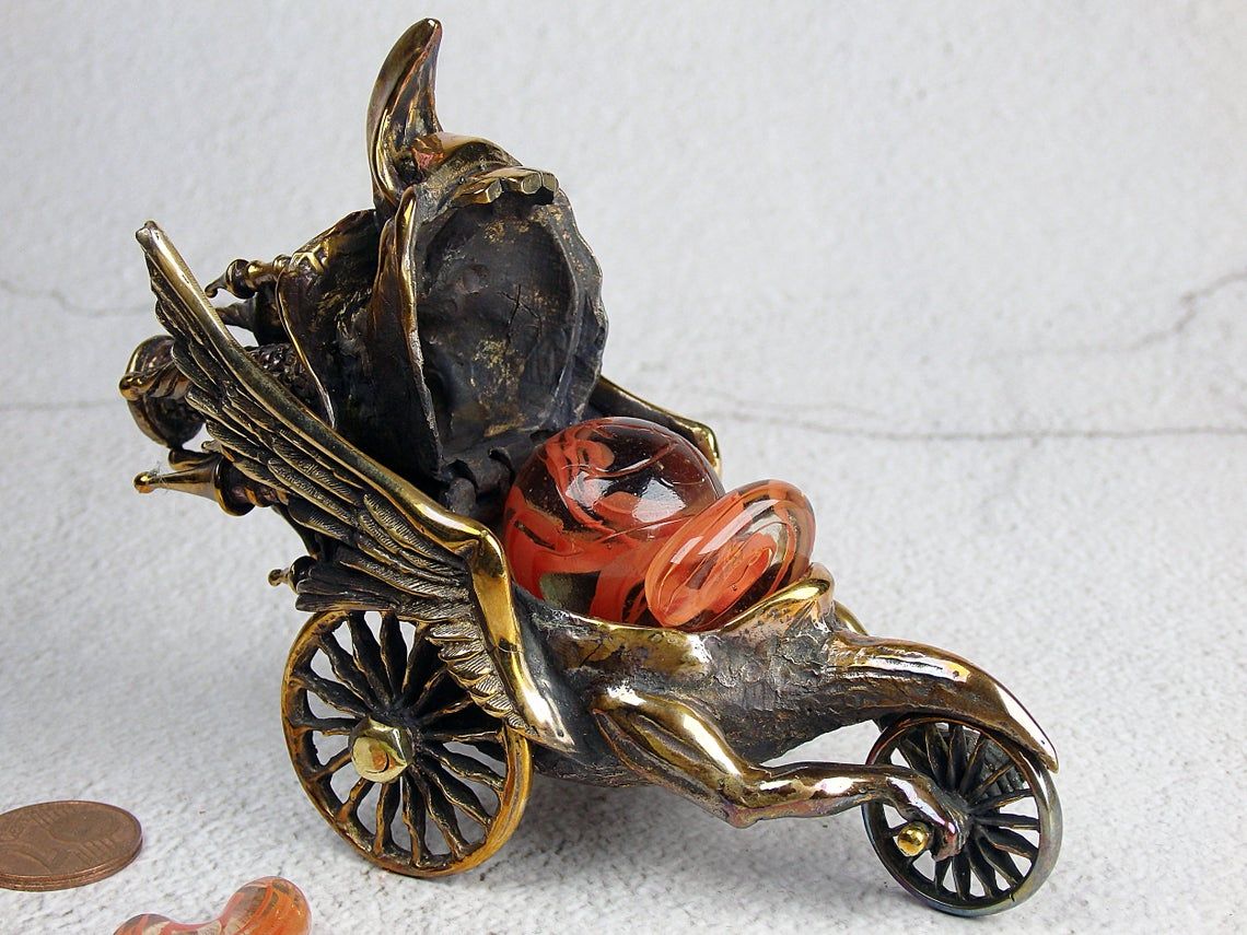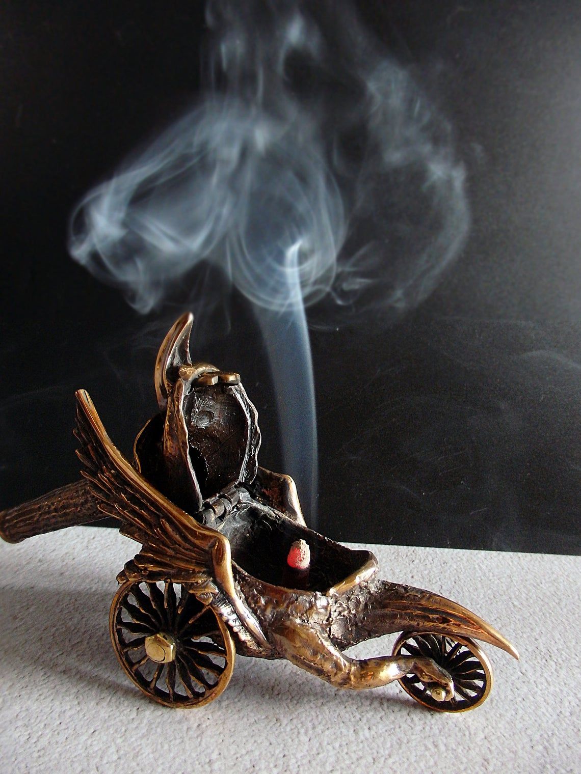 This surreal bronze thing on wheels can perform different functions. It can be used as a holder for incense sticks or pyramids, as a fun piggy bank or a small desktop waste basket. Tobacco lovers can use it instead of an ashtray, and jewelry owners - as a storehouse for jewelry or small items.