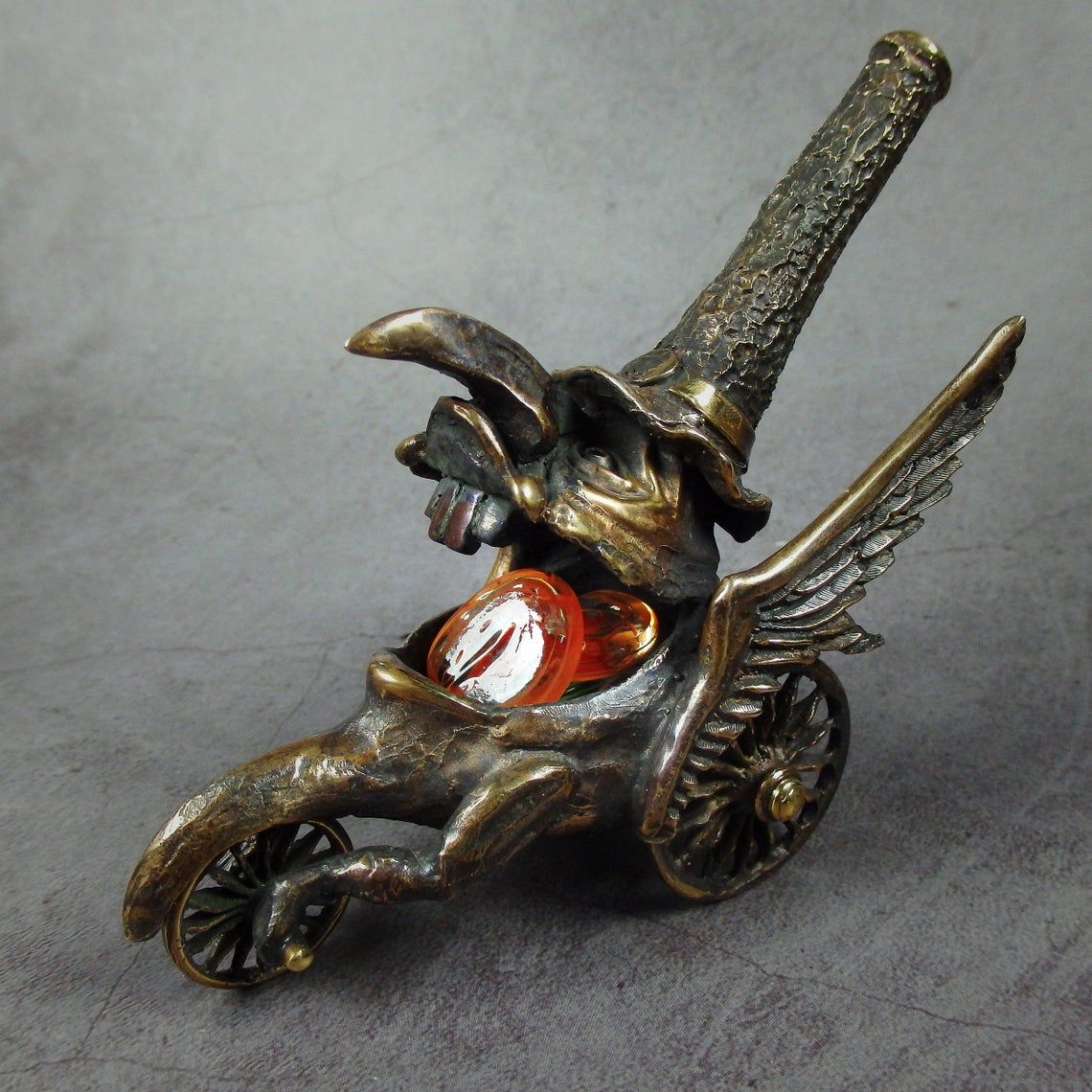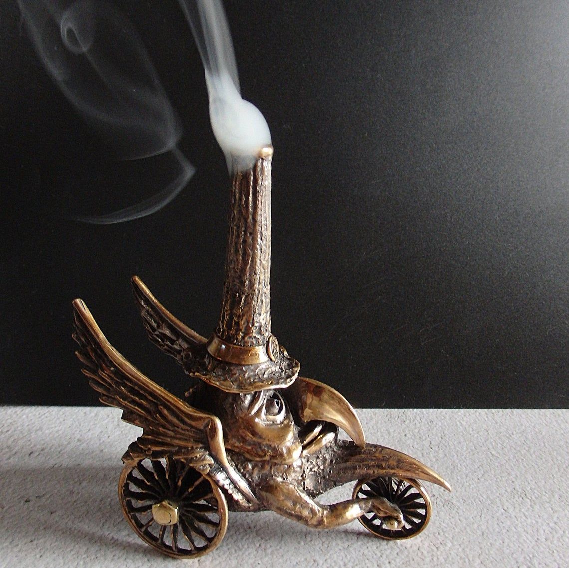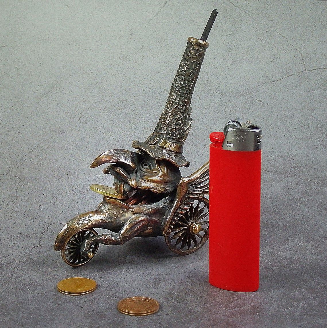 This surreal bronze thing on wheels can perform different functions. It can be used as a holder for incense sticks or pyramids, as a fun piggy bank or a small desktop waste basket. Tobacco lovers can use it instead of an ashtray, and jewelry owners - as a storehouse for jewelry or small items.