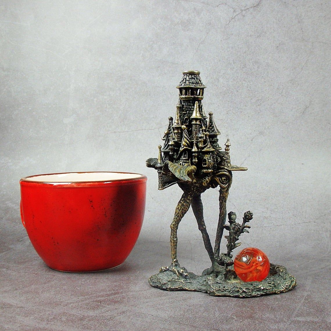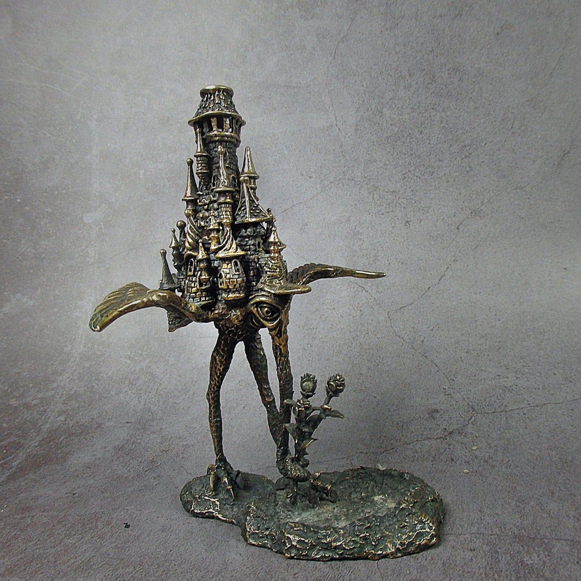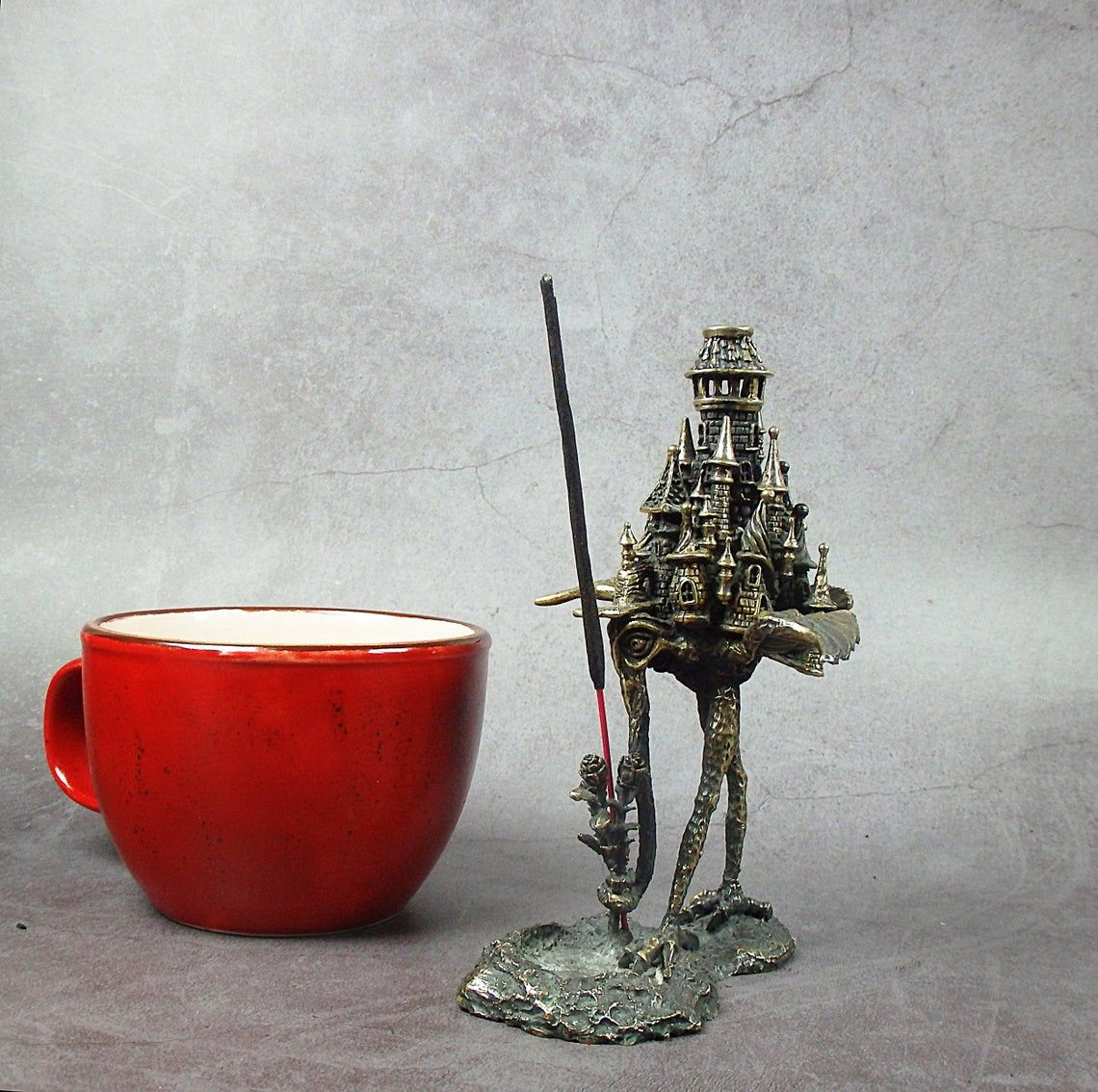 Unusual bronze incense stick holder. Surprising mixture romance, mystique and frightening tale - a strange bird-chimera with an elephant's trunk, sad eyes of a human, and with towers on the back. This is a very strange thing, a thing of the mood, and it will not leave you indifferent.