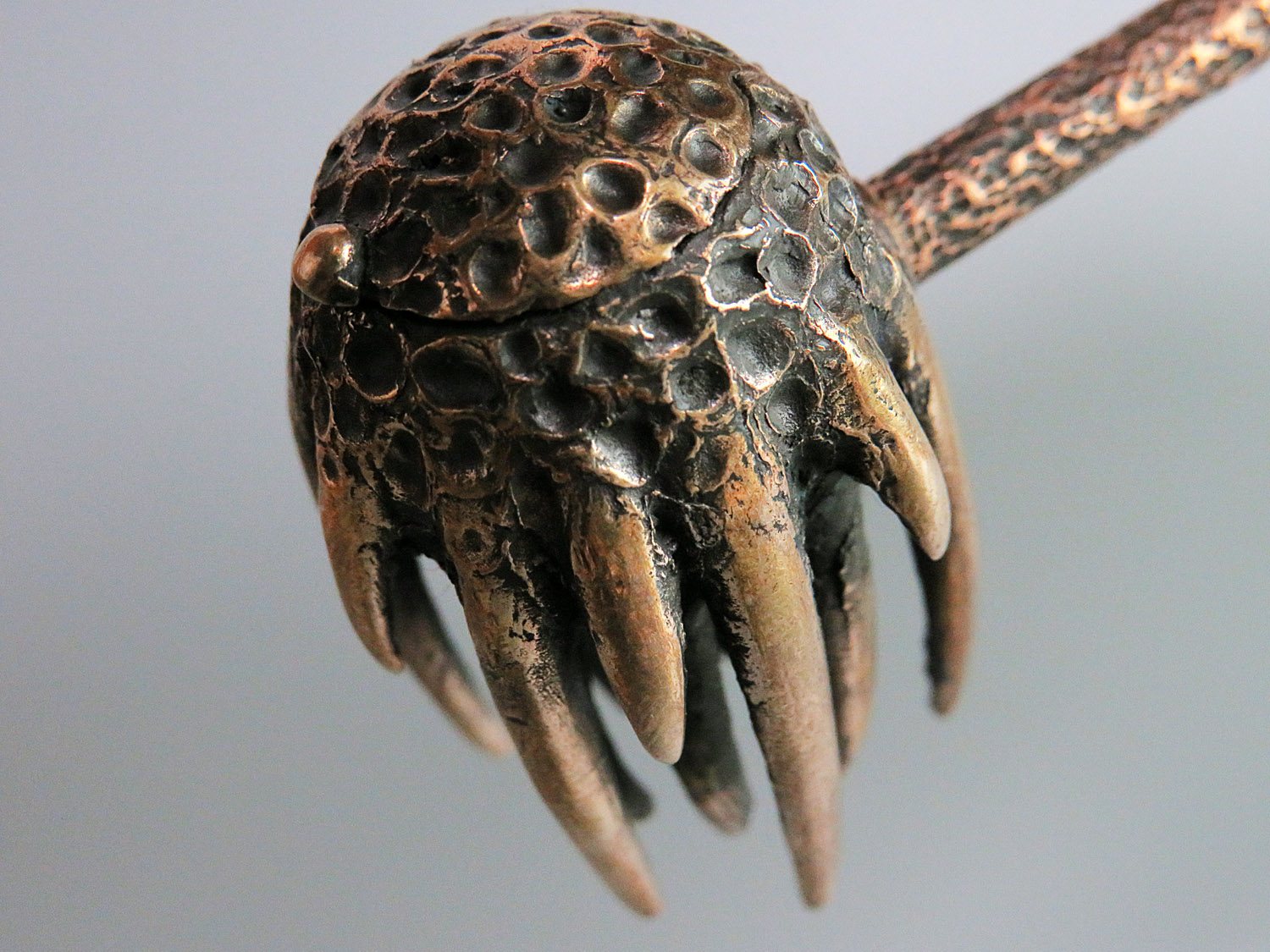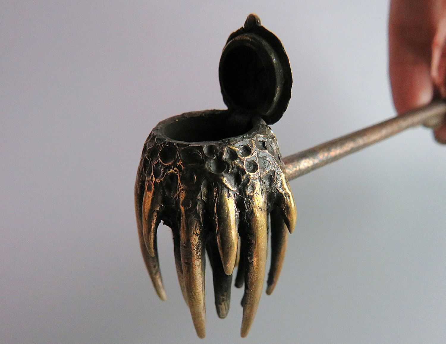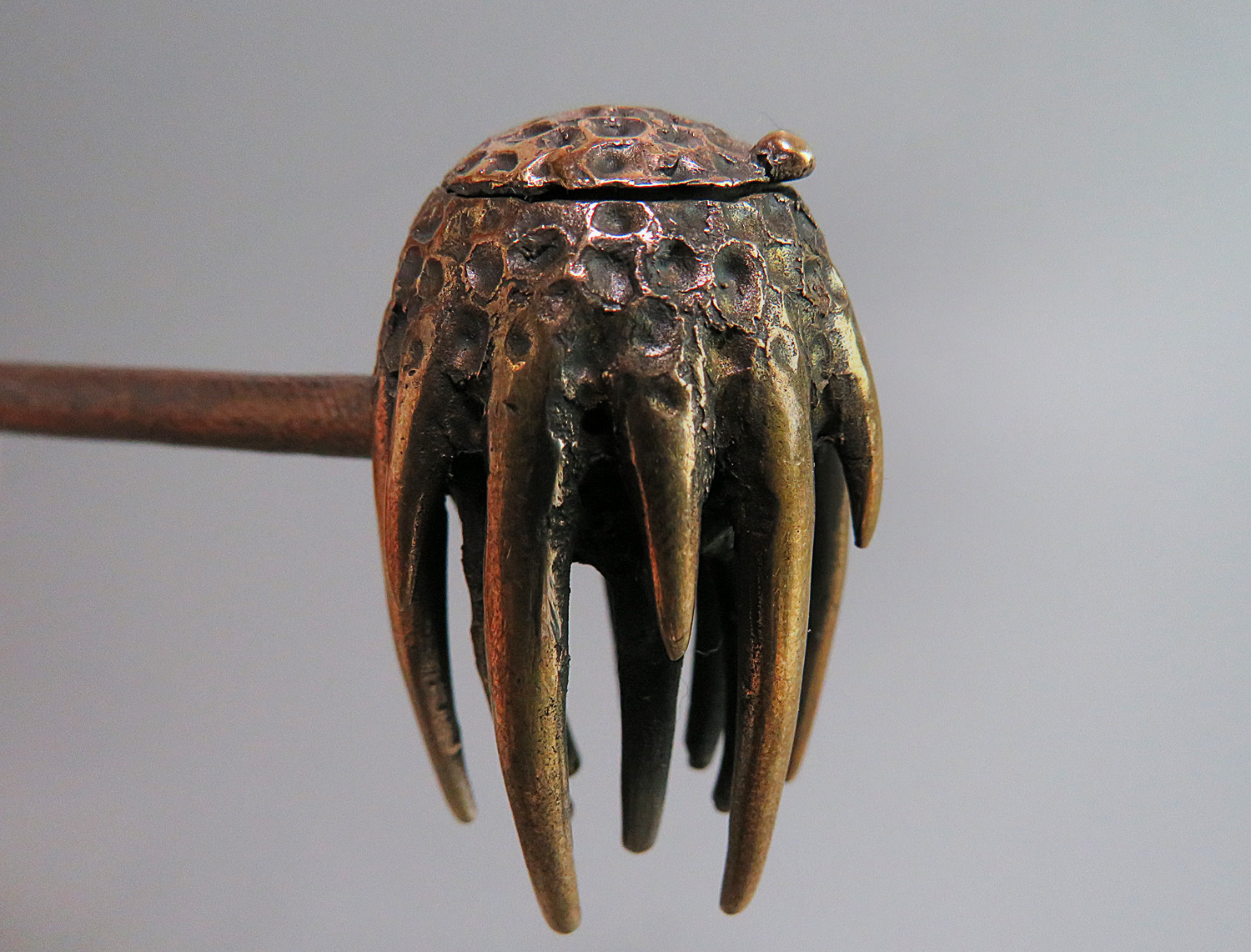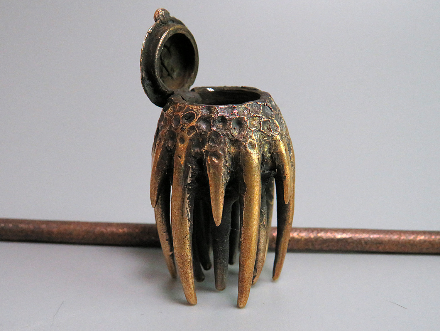 To make this item, a wax model was cut out by hand. Then, using the lost wax method, bronze parts were cast.