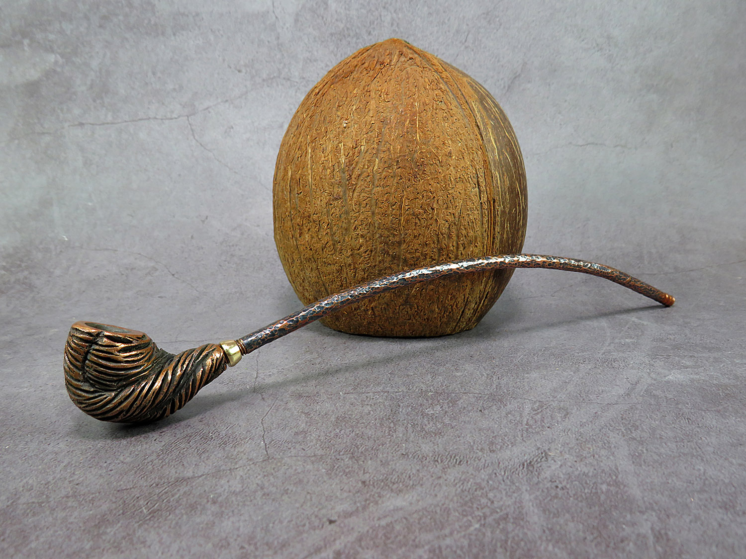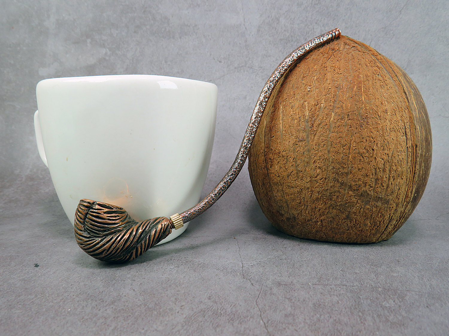 Freehand churchwarden bronze pipe with imitation of rope fibers. The mouthpiece is made of copper, it is screwed on, can have a length (from 3 to 30 cm) and a shape at the request of the buyer. The pipe is working, not decorative, the model is tested by the master.