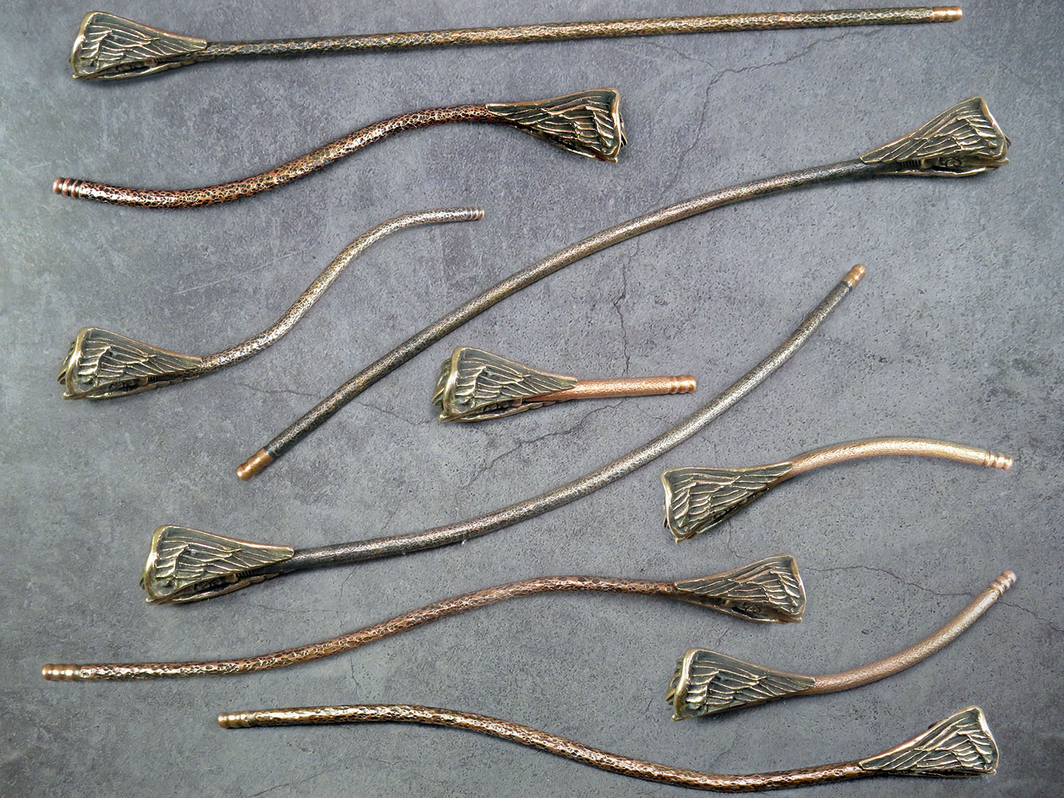 To make this item, a wax model was cut out by hand. Then, using the lost wax method, bronze parts were cast.