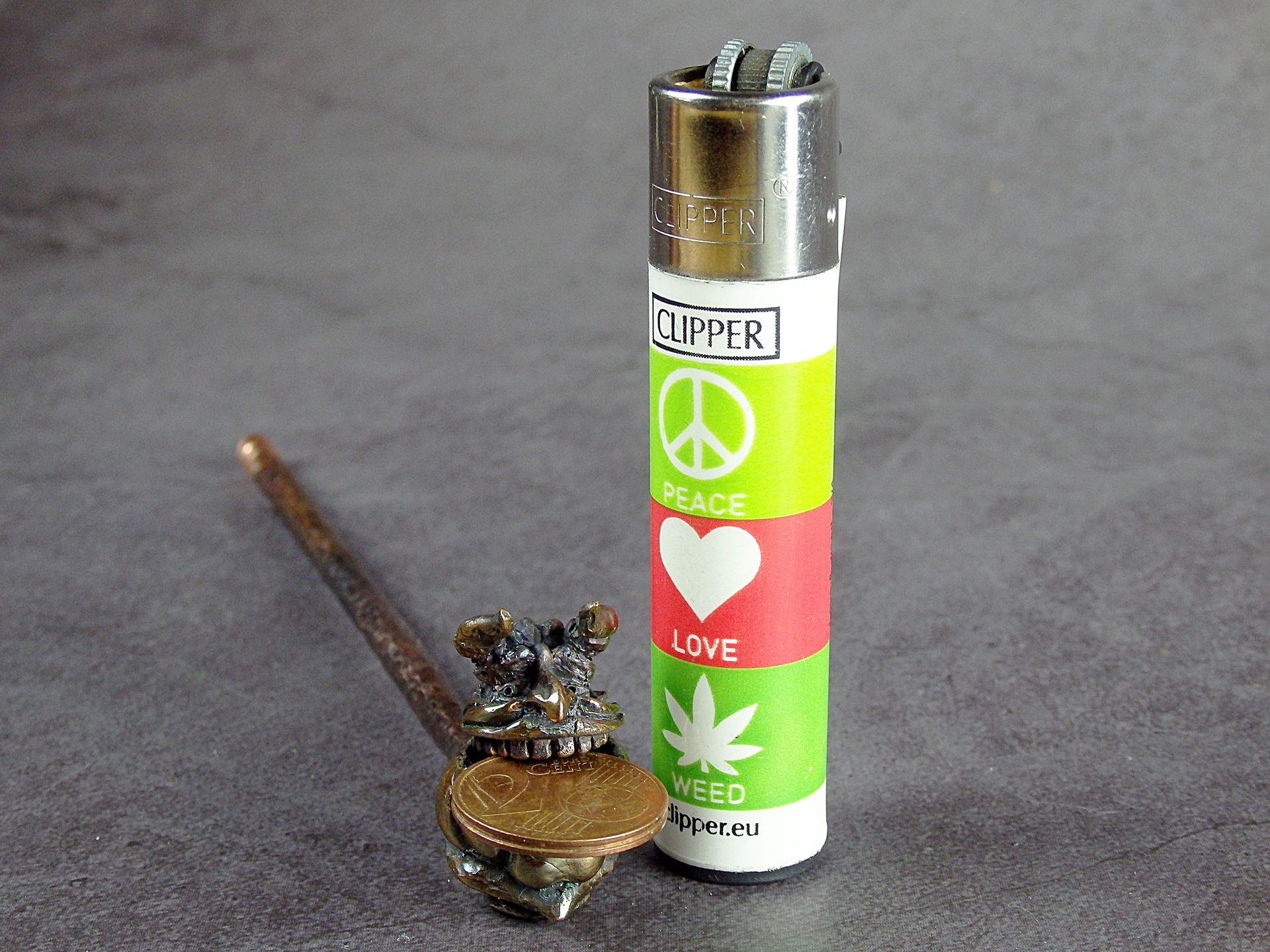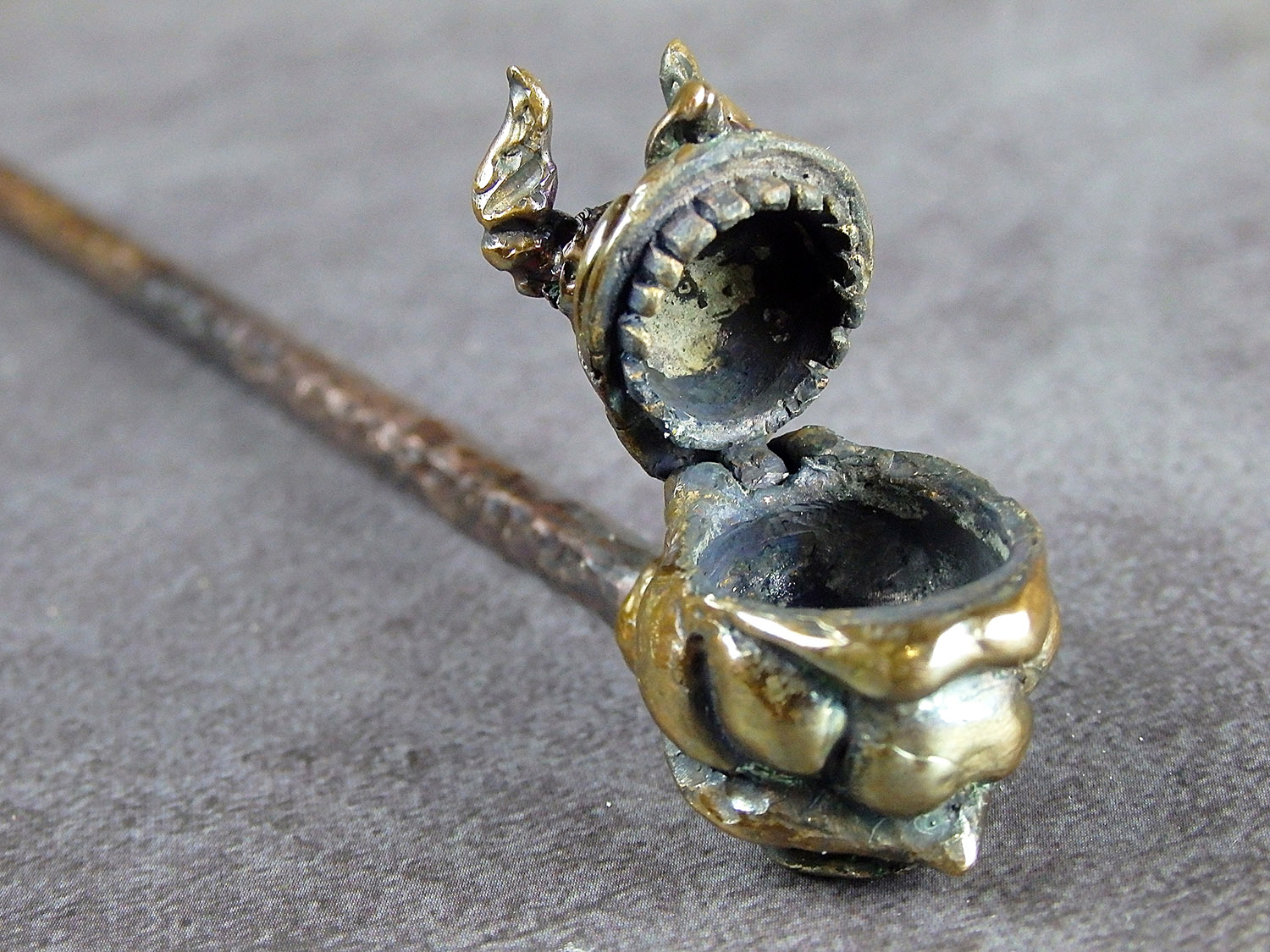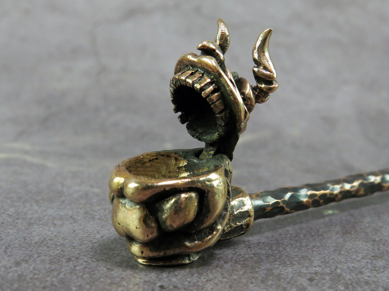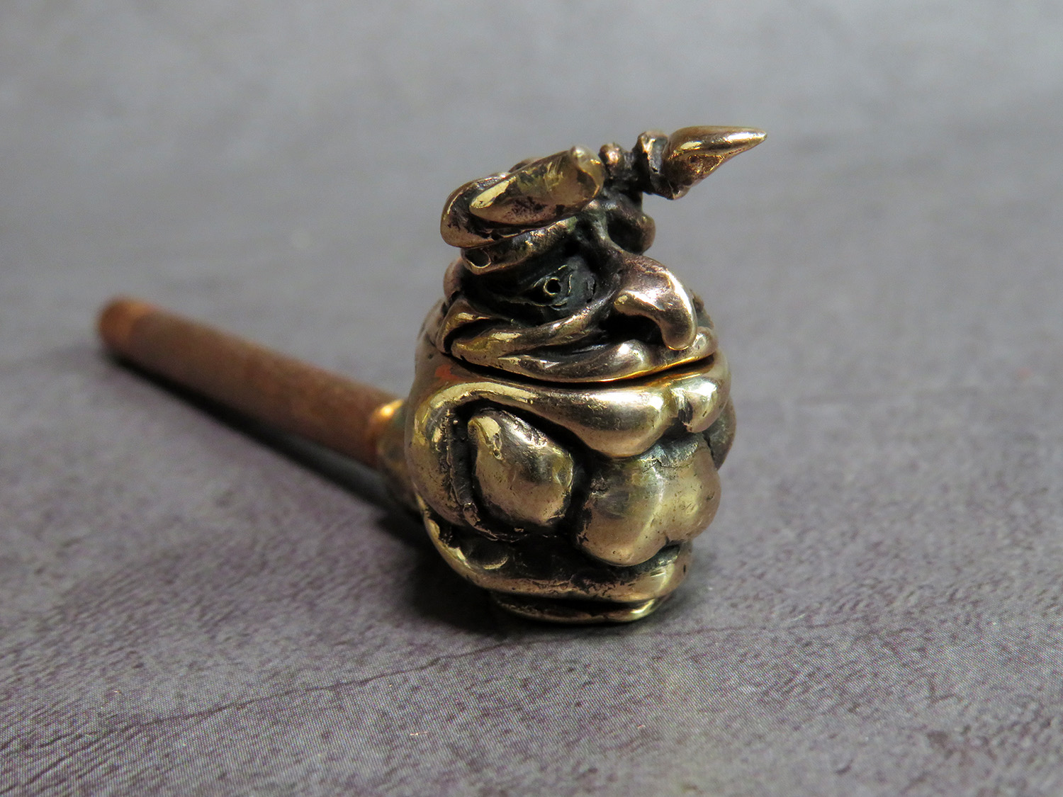 Smoking pipe with a bowl in the form of a head small horned demon. The head has an opening lid and this is not only a smoking accessory, but also a wonderful souvenir. The mouthpiece is made of copper, it is screwed on, can have a length (from 3 to 30 cm) and a shape at the request of the buyer. The pipe is working, not decorative, the model is tested by the master.