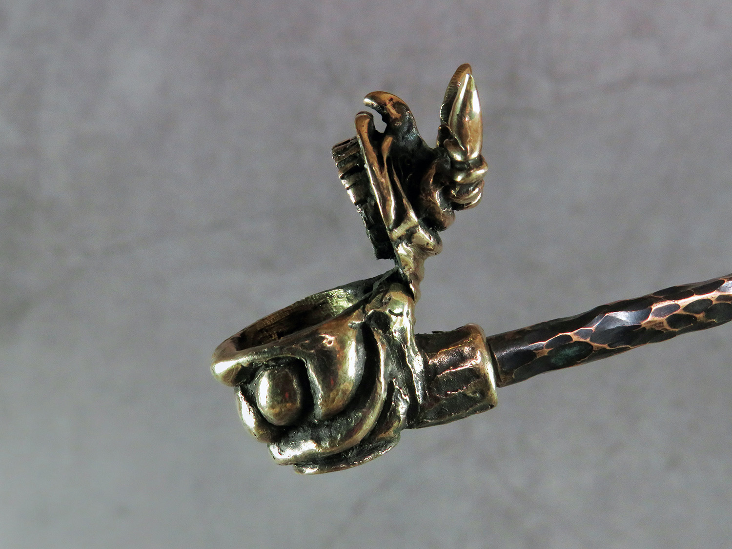 To make this item, a wax model was cut out by hand. Then, using the lost wax method, bronze parts were cast.