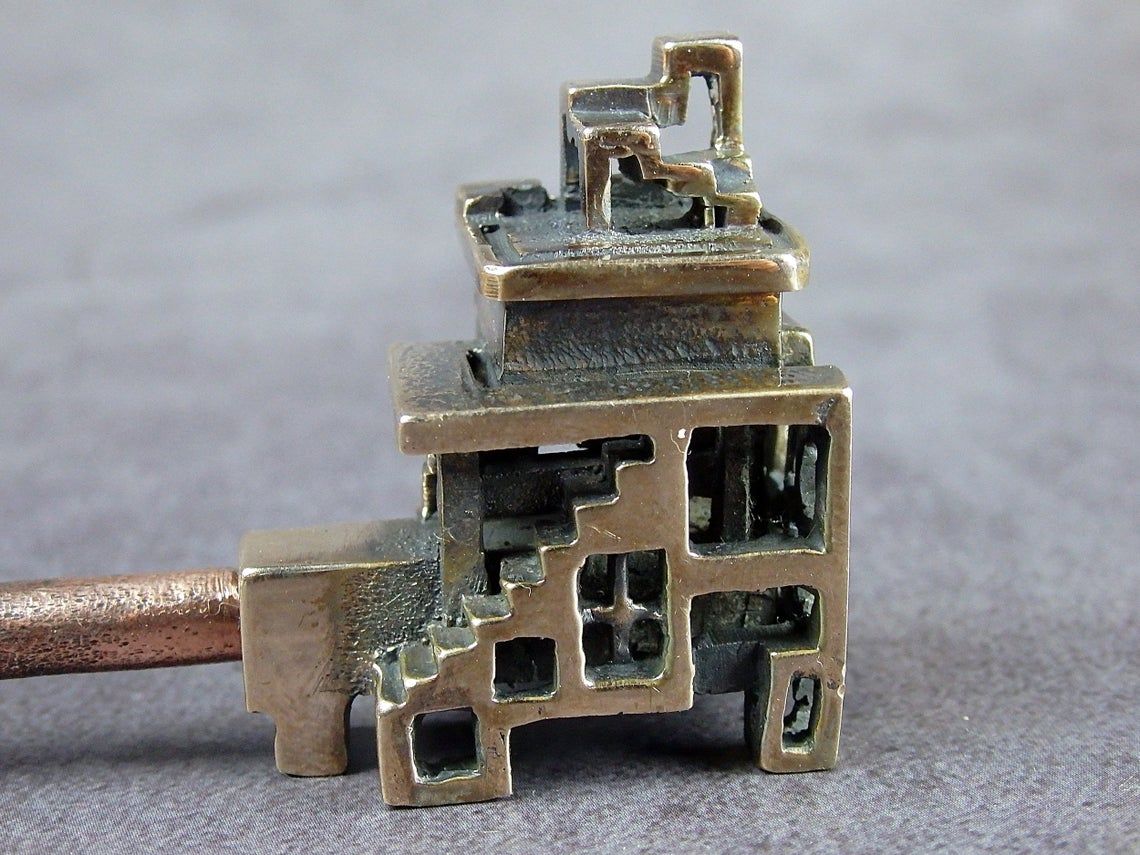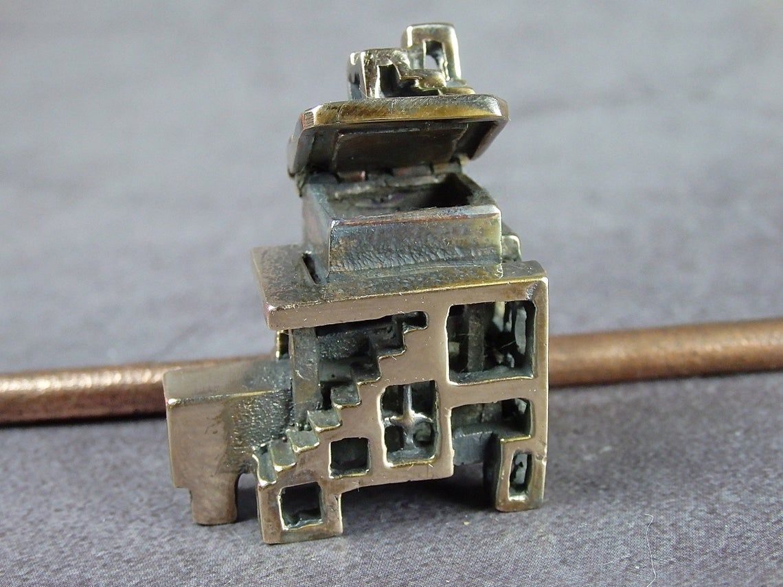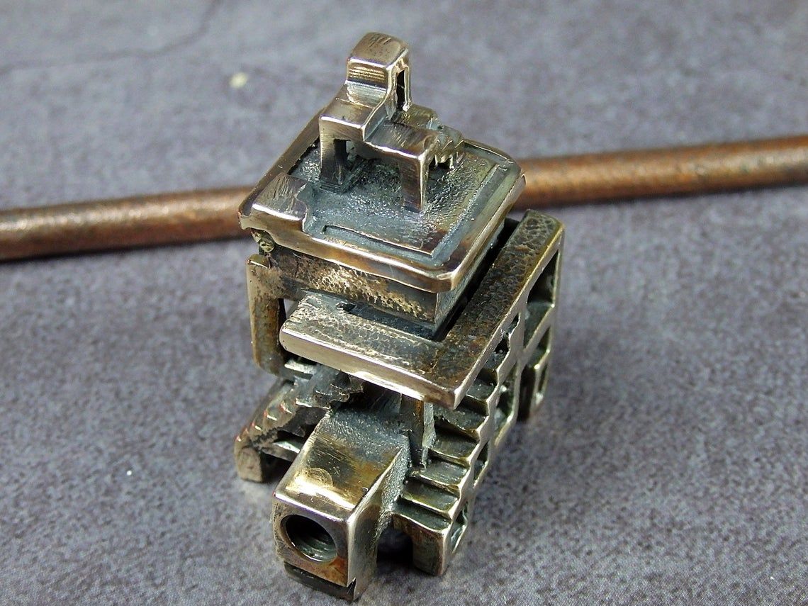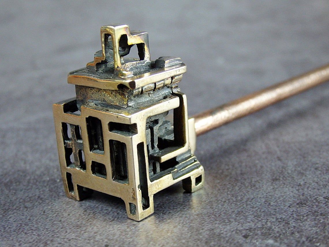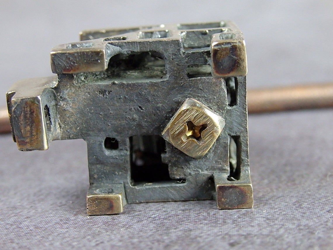 To make this item, a wax model was cut out by hand. Then, using the lost wax method, bronze parts were cast.