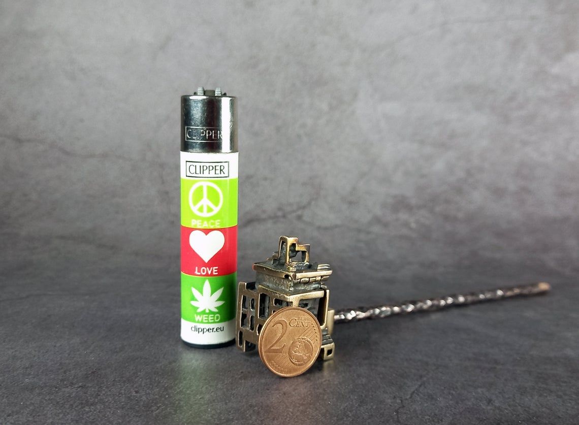 Bowl of pipe made of polished bronze, mouthpiece made of copper, it is screwed on, can have a length (from 3 to 30 cm) and a shape at the request of the buyer. The pipe is working, not decorative, the model is tested by the master.