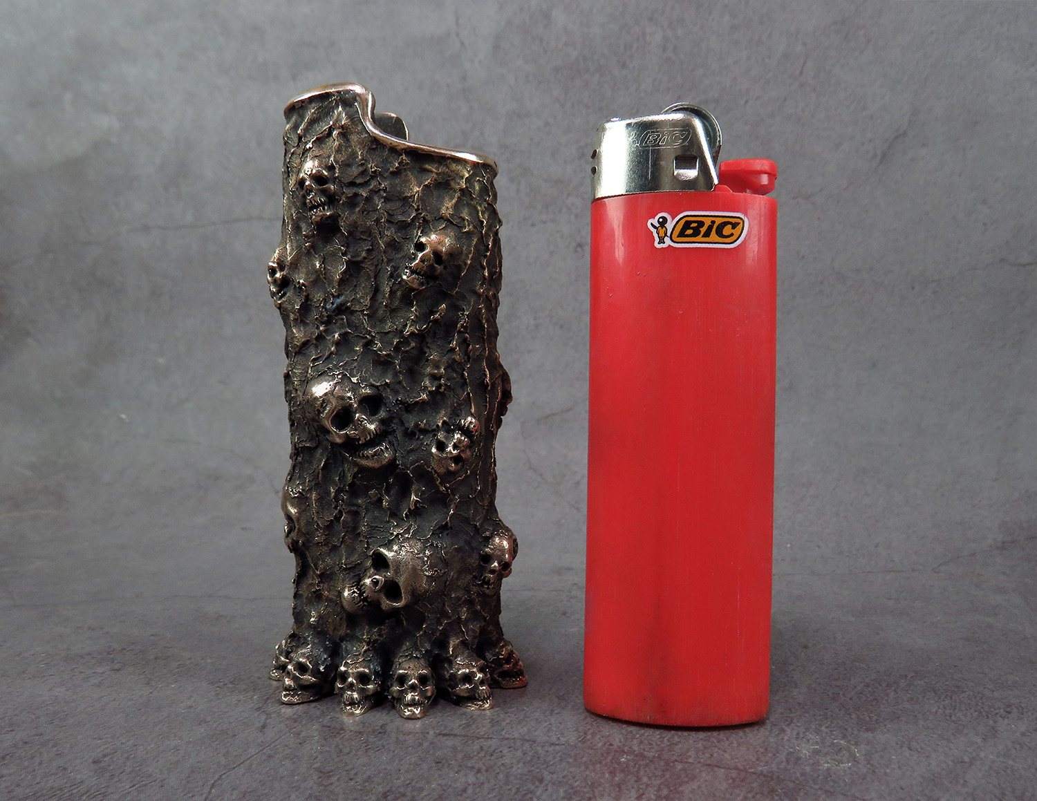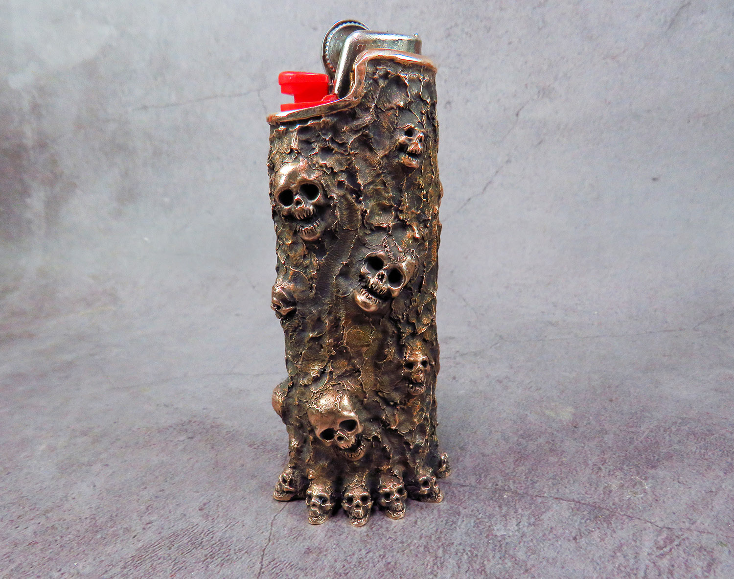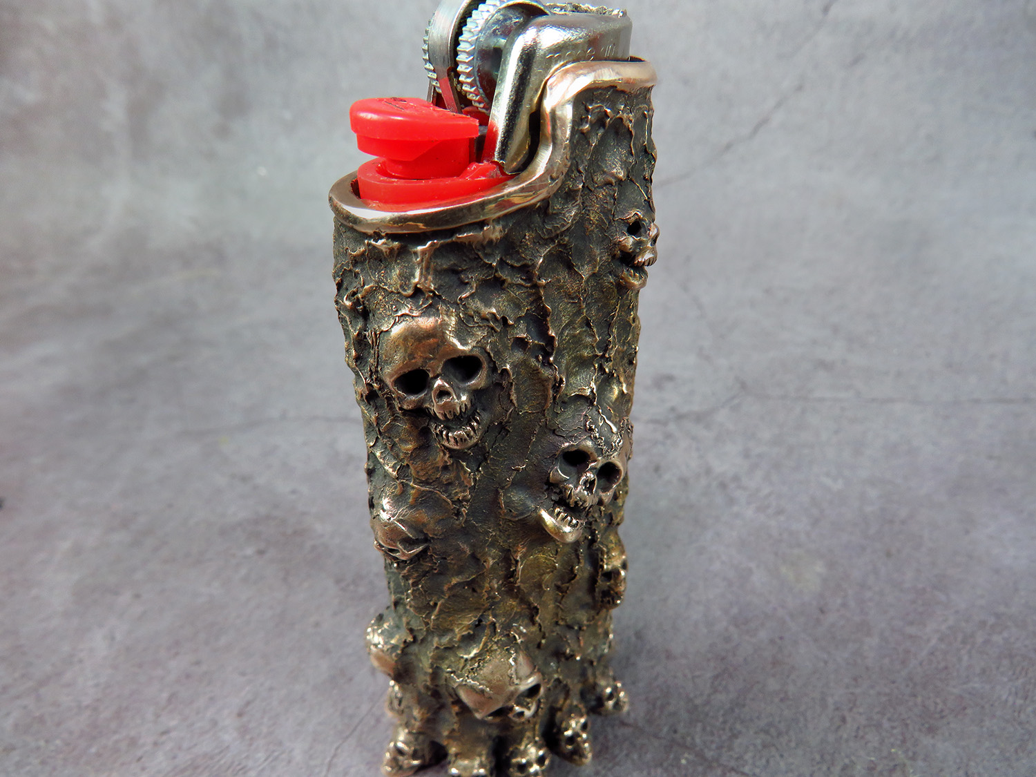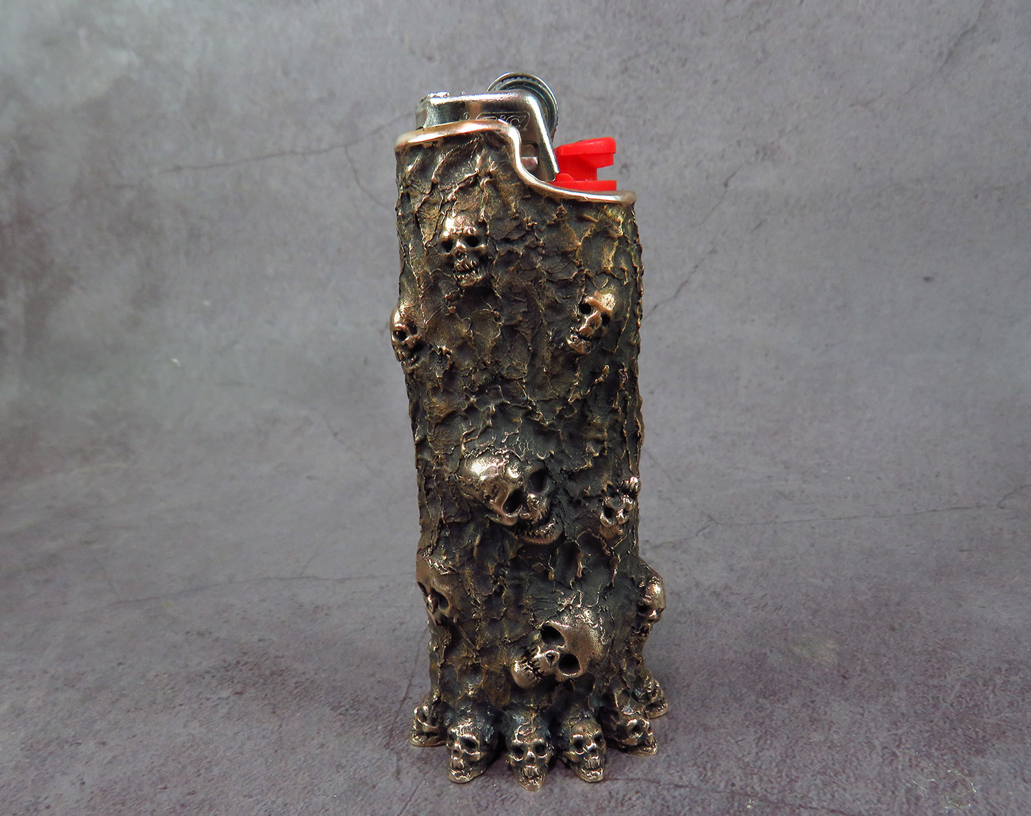 Bronze case with skulls for a disposable lighter.