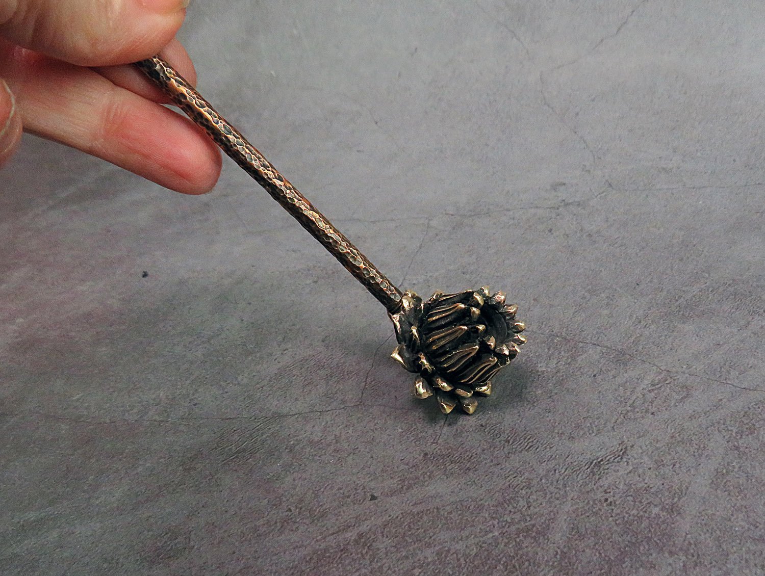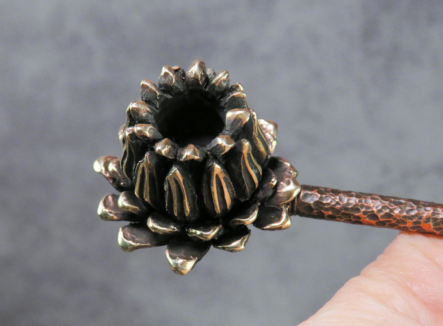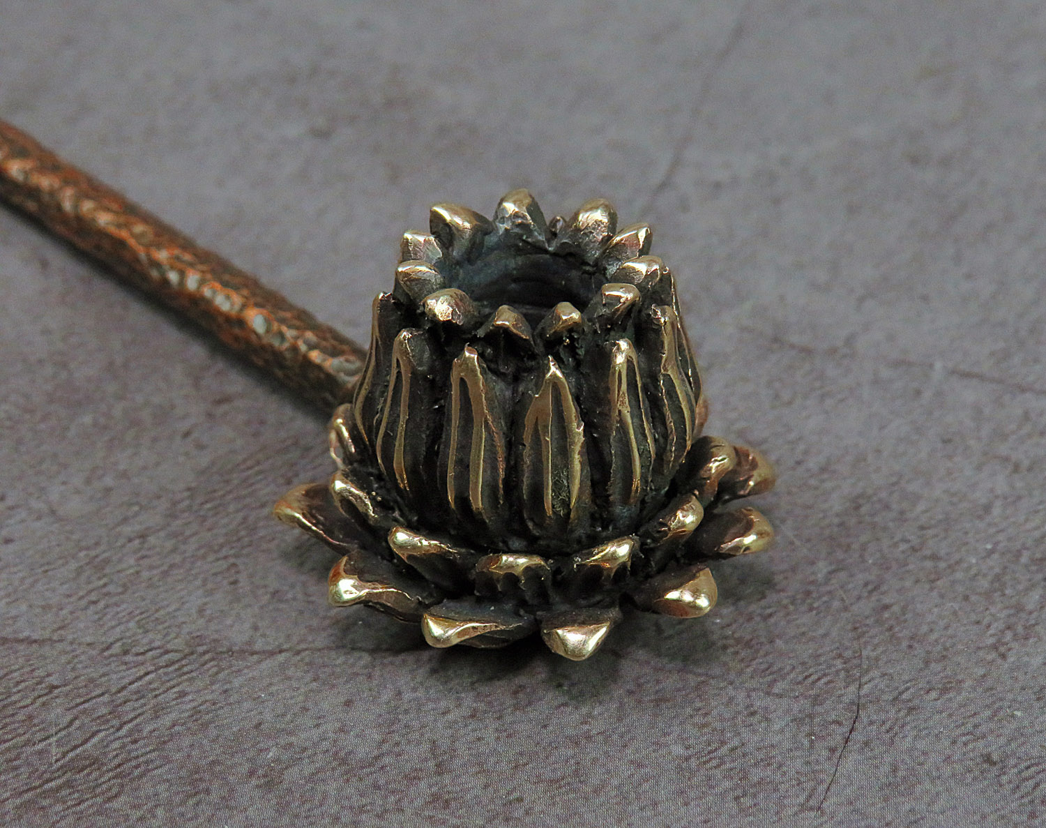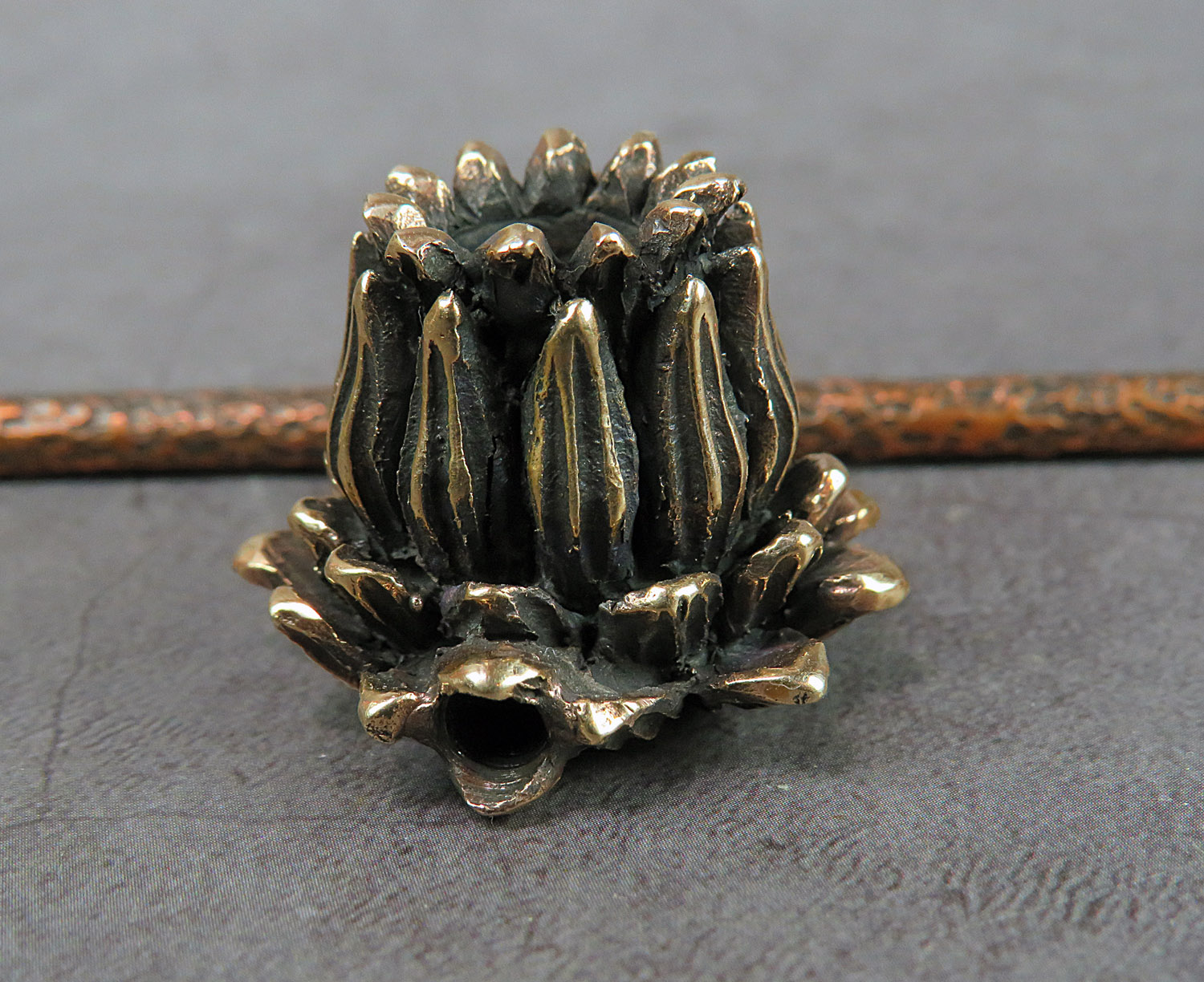 Bronze smoking pipe with a bowl in the shape of a lotus. The perfect way to enjoy smoking in a "zen" style - a lotus-shaped pipe. For lovers of yoga, meditation, and Eastern spiritual philosophy, as well as for collectors of smoking accessories looking for unique and beautiful items for their collection.