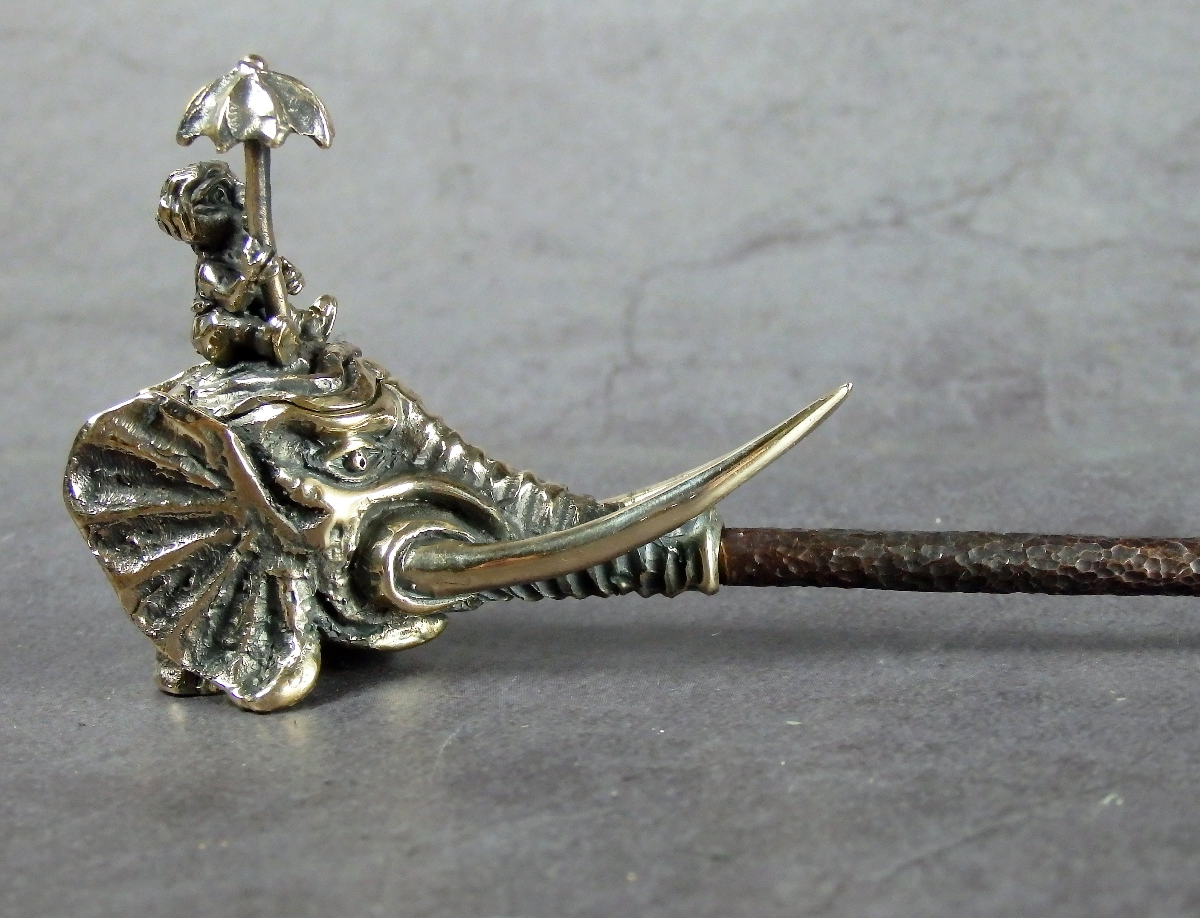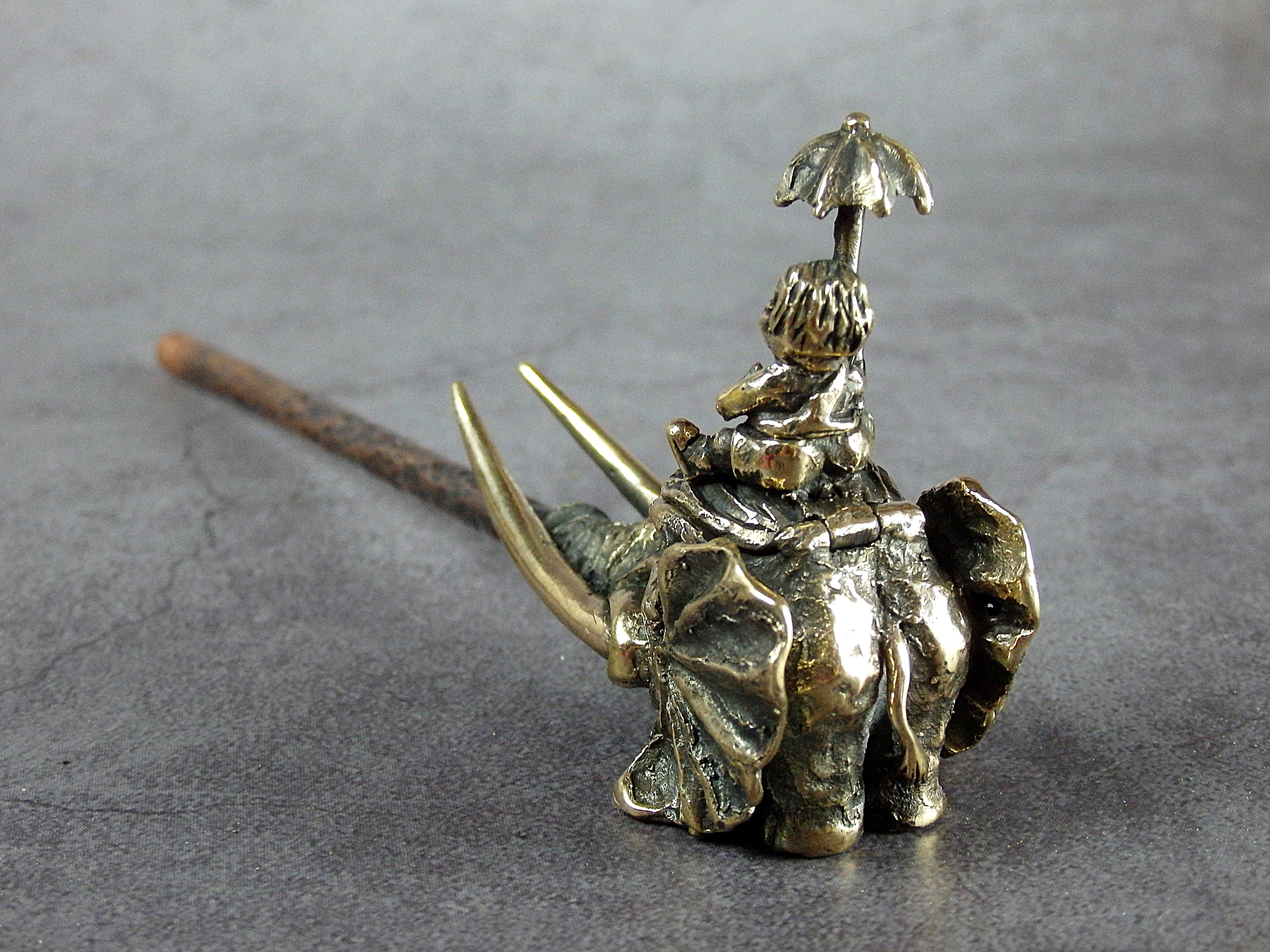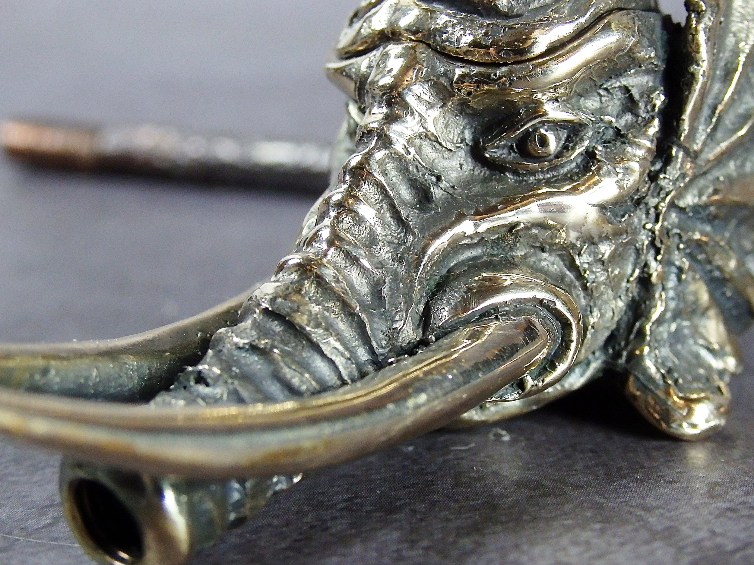 Large heavy bronze smoking pipe with a bowl in the shape of an elephant with a rider. The head has an opening lid and this is not only a smoking accessory, but also a wonderful souvenir. The mouthpiece is made of copper, it is screwed on, can have a length (from 3 to 30 cm) and a shape at the request of the buyer. The pipe is working, not decorative, the model is tested by the master.