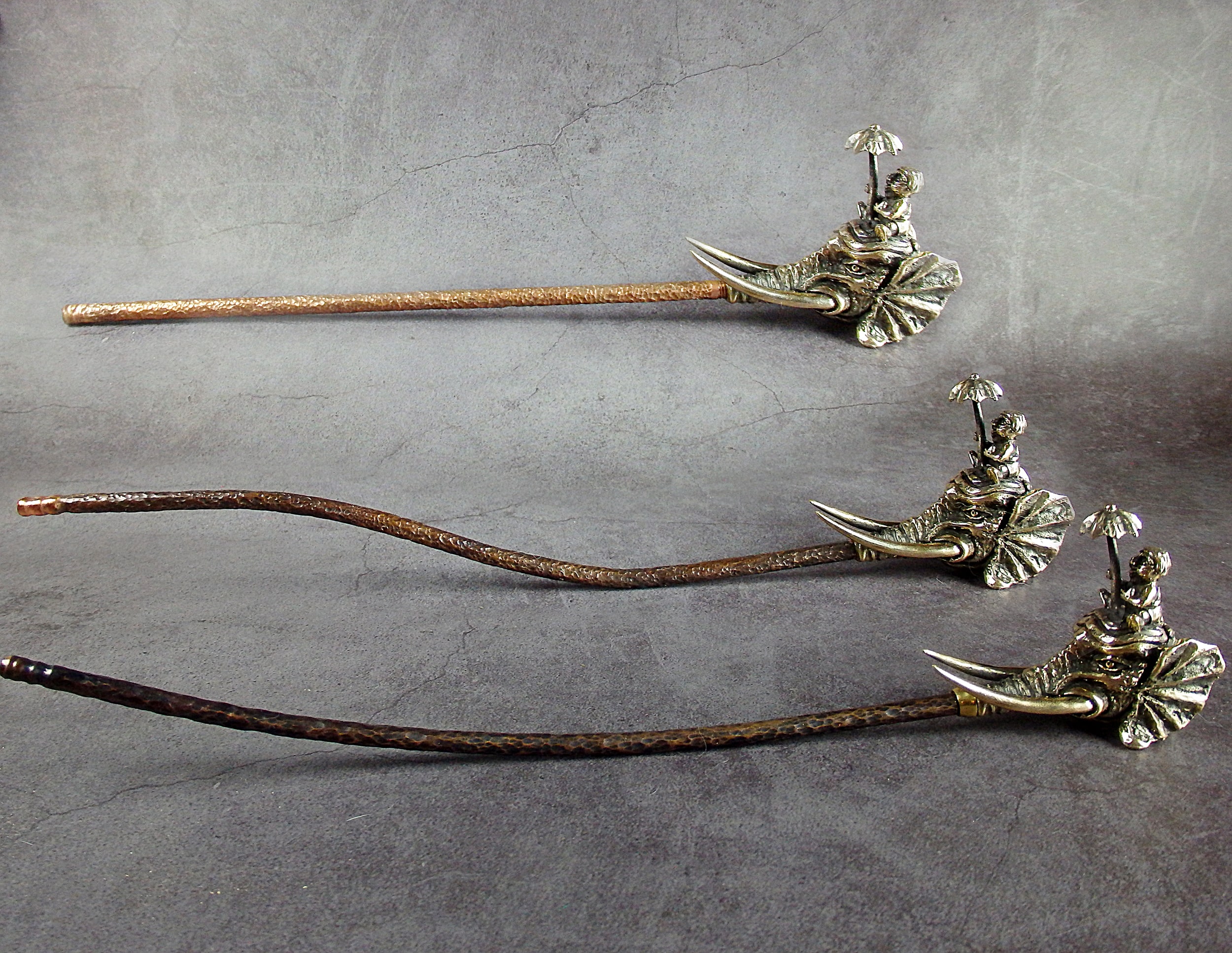 To make this item, a wax model was cut out by hand. Then, using the lost wax method, bronze parts were cast.