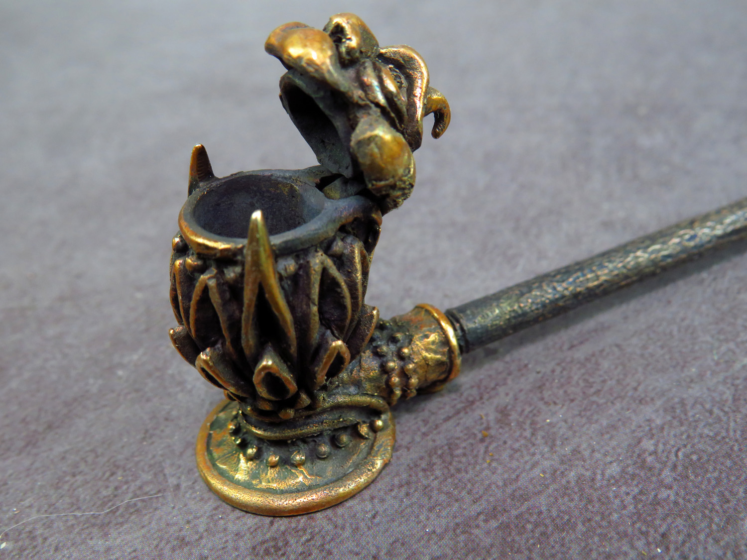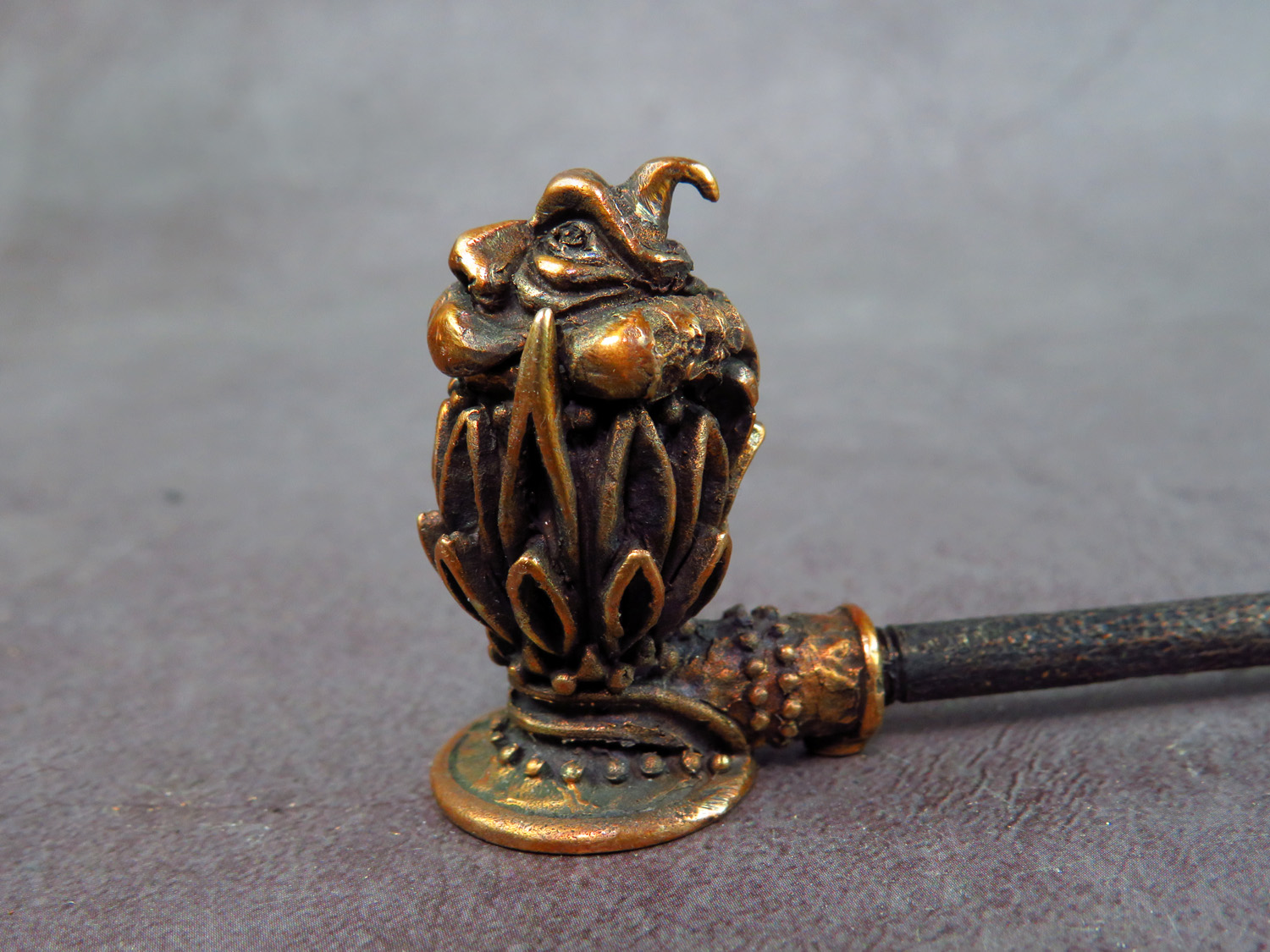 Smoking pipe with a bowl in the form of a mythical creature, a strange marsh spirit, sitting in a water lily. The mouthpiece is made of copper, it is screwed on, can have a length (from 3 to 30 cm) and a shape at the request of the buyer. The pipe is working, not decorative, the model is tested by the master.