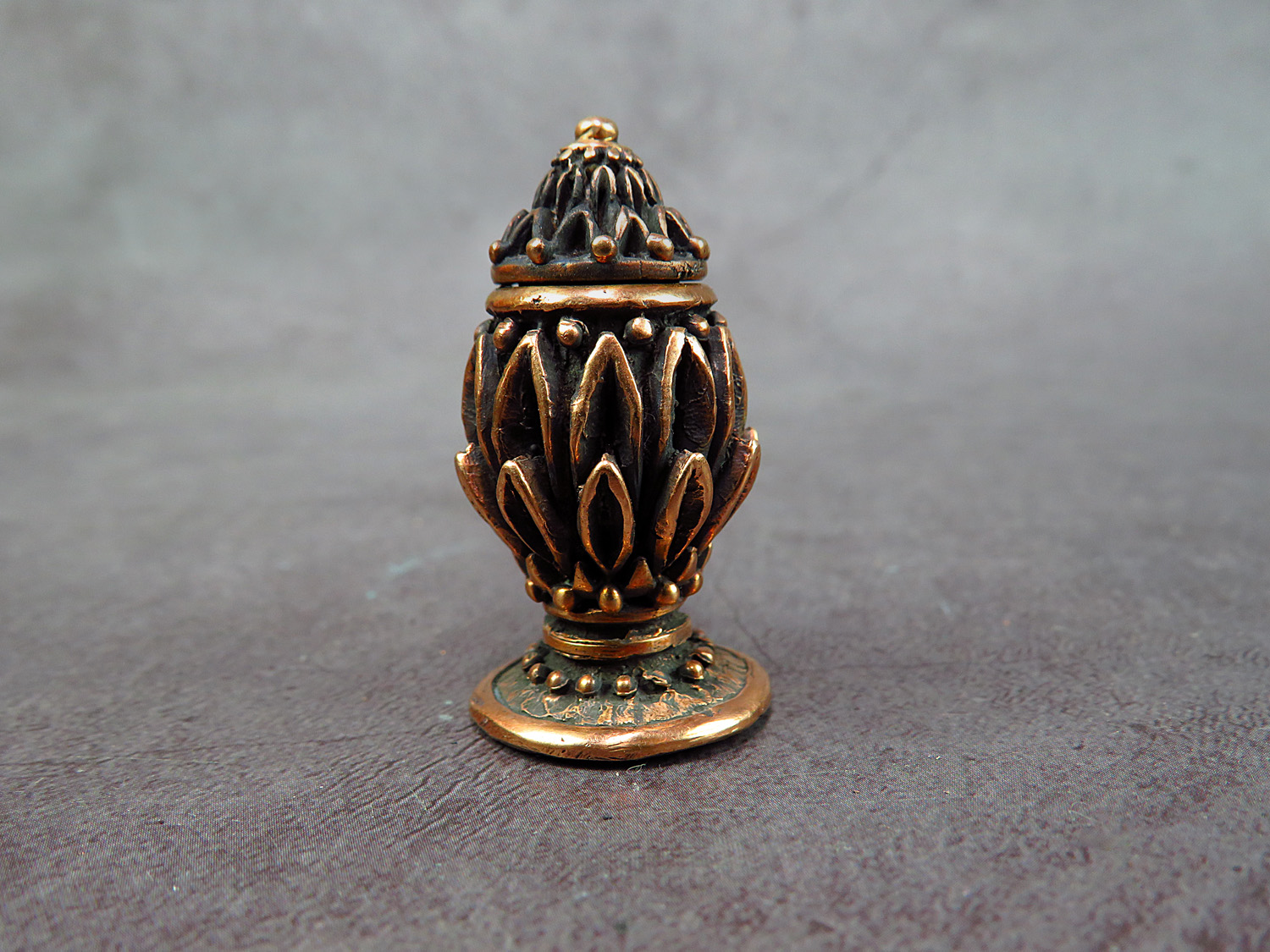 To make this item, a wax model was cut out by hand. Then, using the lost wax method, bronze parts were cast.