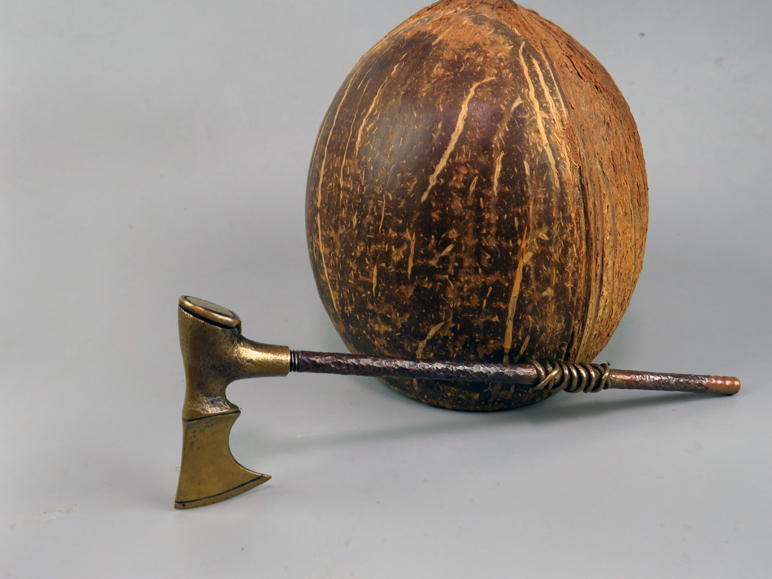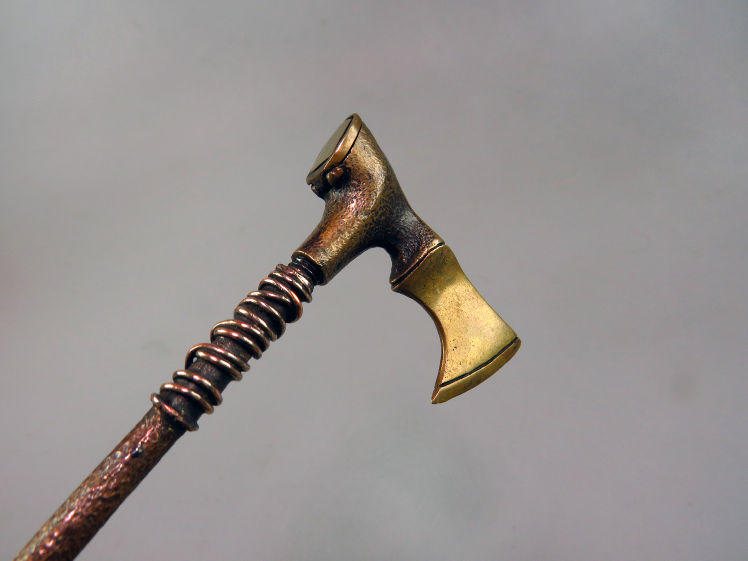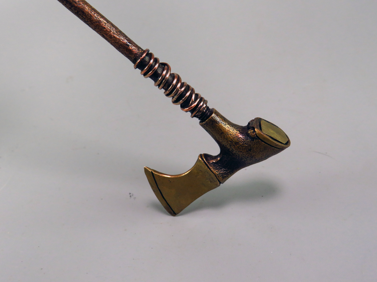 Small bronze pipe in the form of a medieval ax. The stand is made of wood (birch burl). The mouthpiece is made of copper (with copper wire), it is screwed on, can have a length (from 7 to 20 cm) at the request of the buyer. A straight mouthpiece is best suited to this pipe. If you need a different mouthpiece, please indicate this when ordering.
