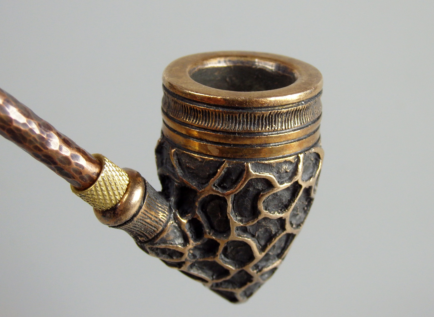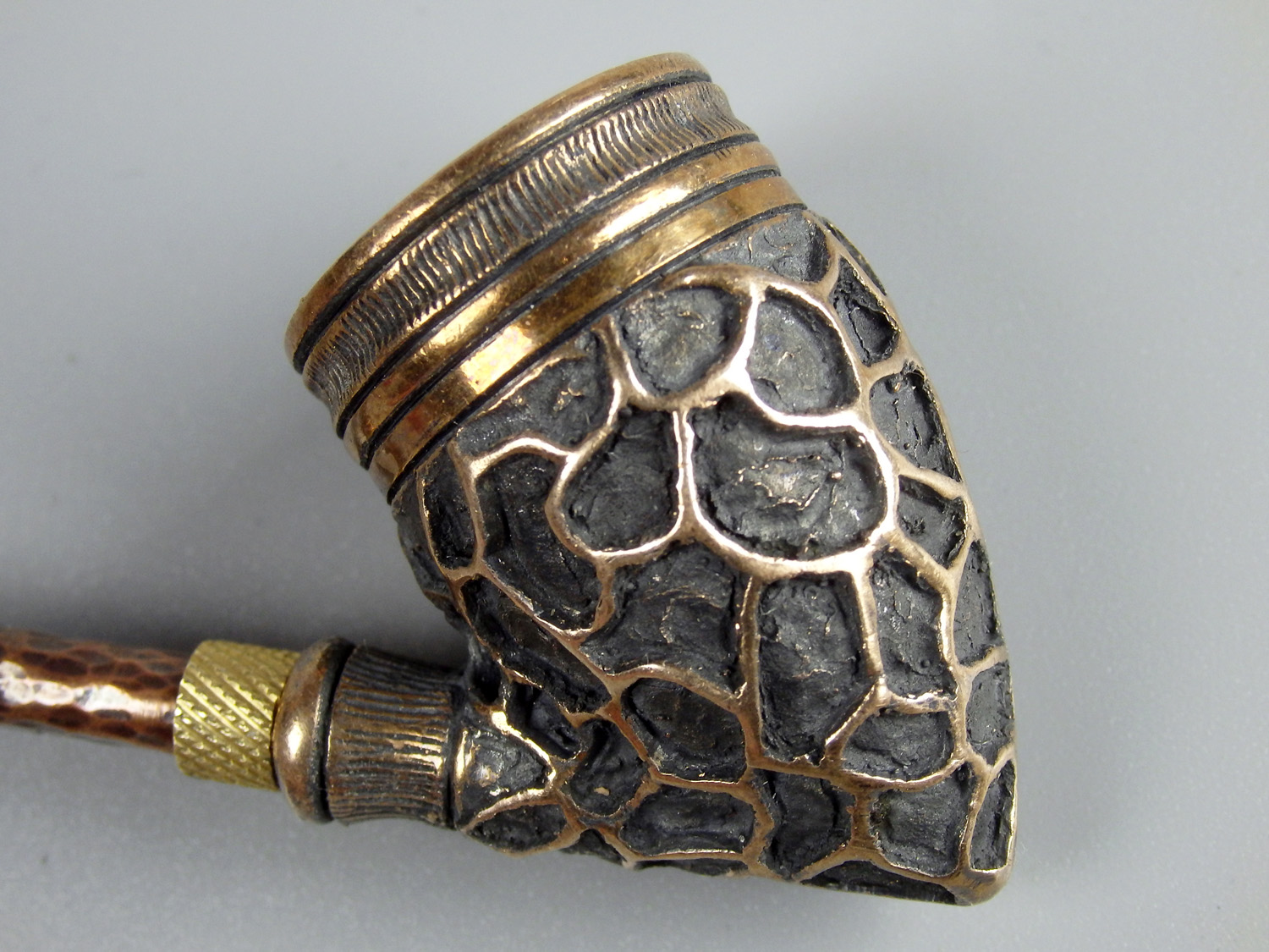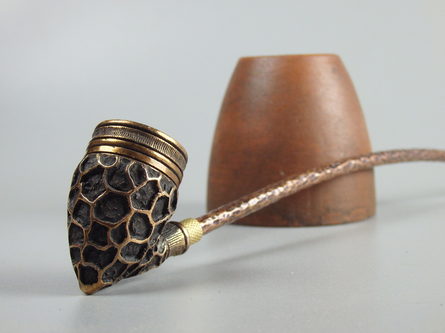 Freehand churchwarden bronze pipe with original grid pattern. The mouthpiece is made of copper, it is screwed on, can have a length (from 5 to 30 cm) and a shape at the request of the buyer. The pipe is working, not decorative, the model is tested by the master.
