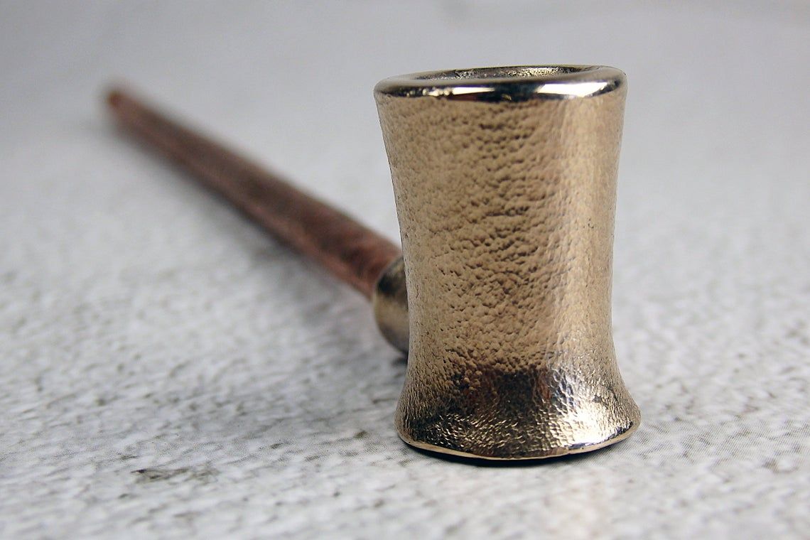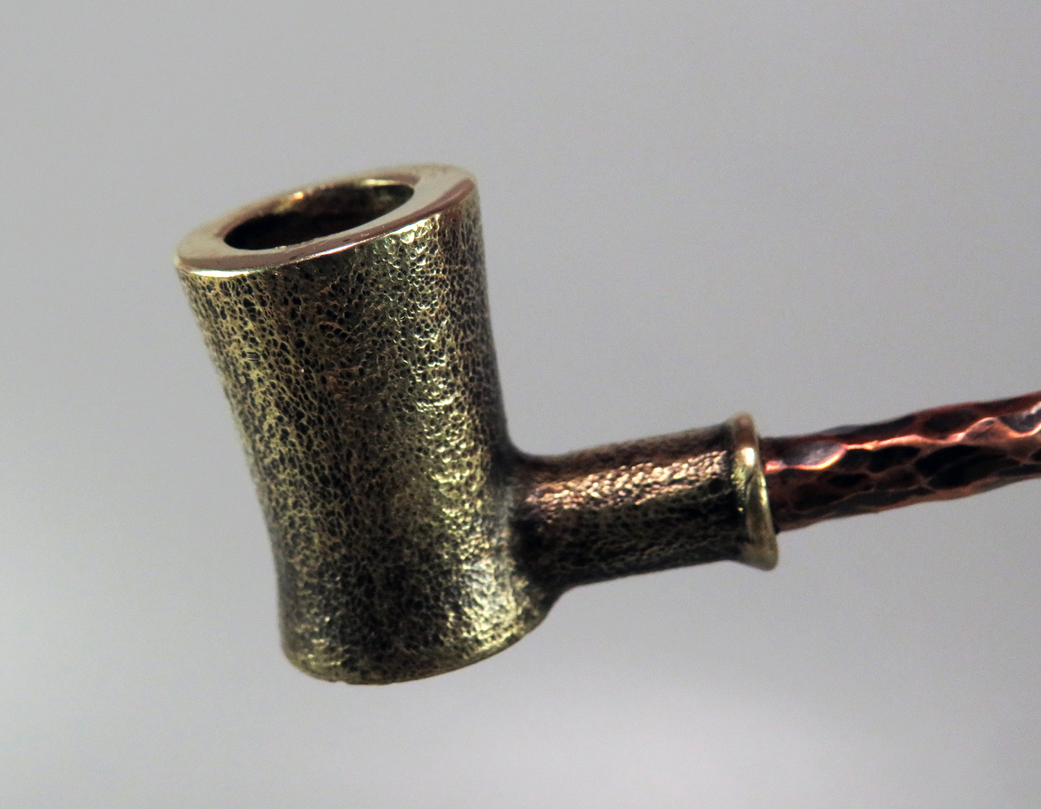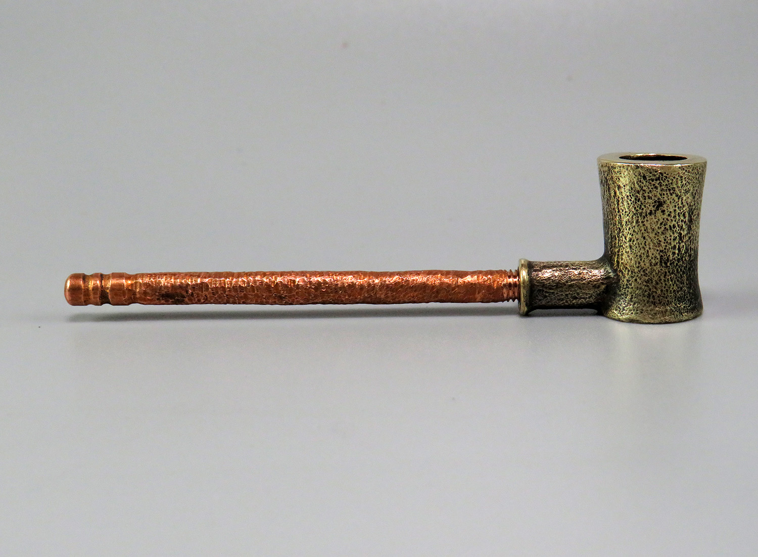 Little bronze smoking pipe with a flat bottom. The mouthpiece is made of copper, it is screwed on, can have a length (from 3 to 30 cm) and a shape at the request of the buyer. The pipe is working, not decorative, the model is tested by the master.