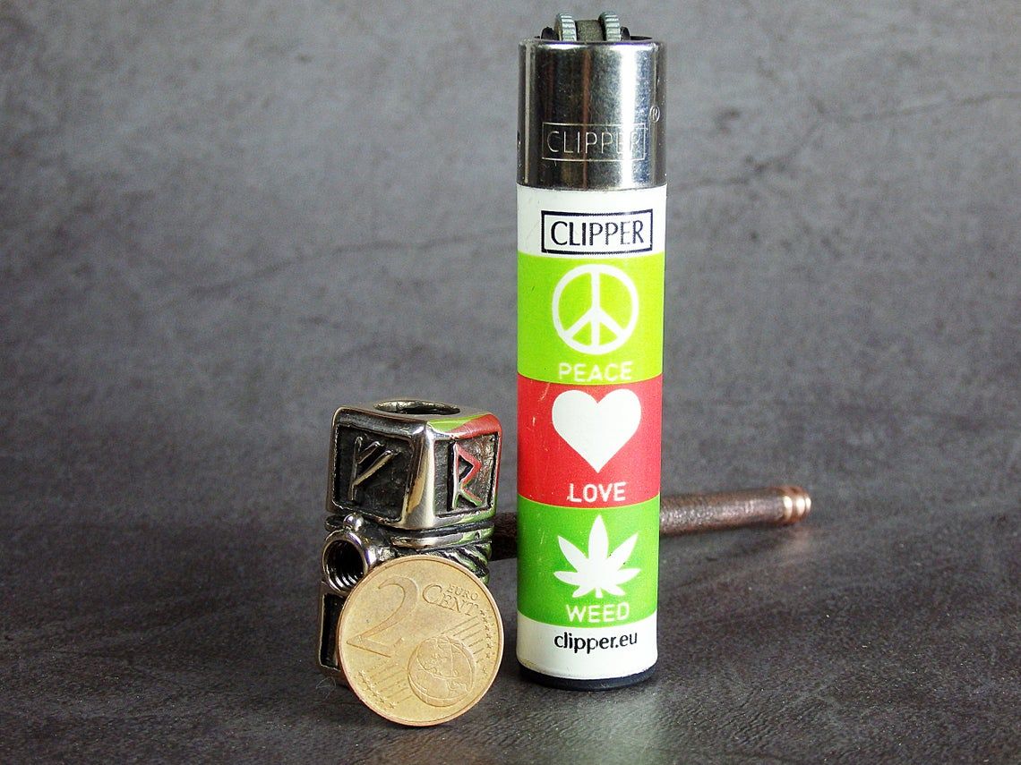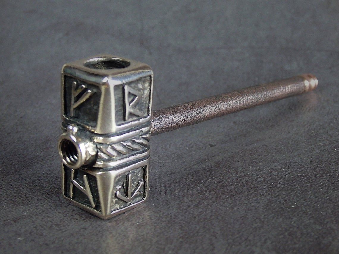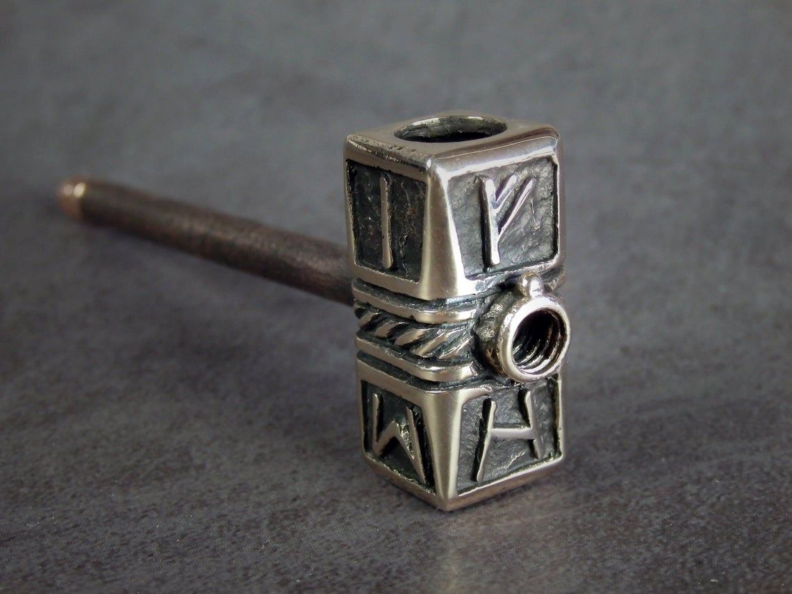 Double-sided smoking pipe, stylized as Thor's hammer. At the ends of the pipe there are bowls of larger and smaller sizes, for different tastes and volumes. A Hammer is decorated with runes - the inscription "Freedom" in German (FREIHEIT).