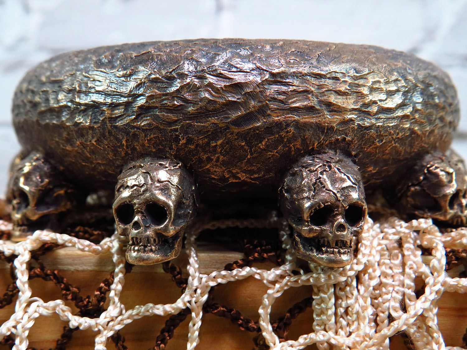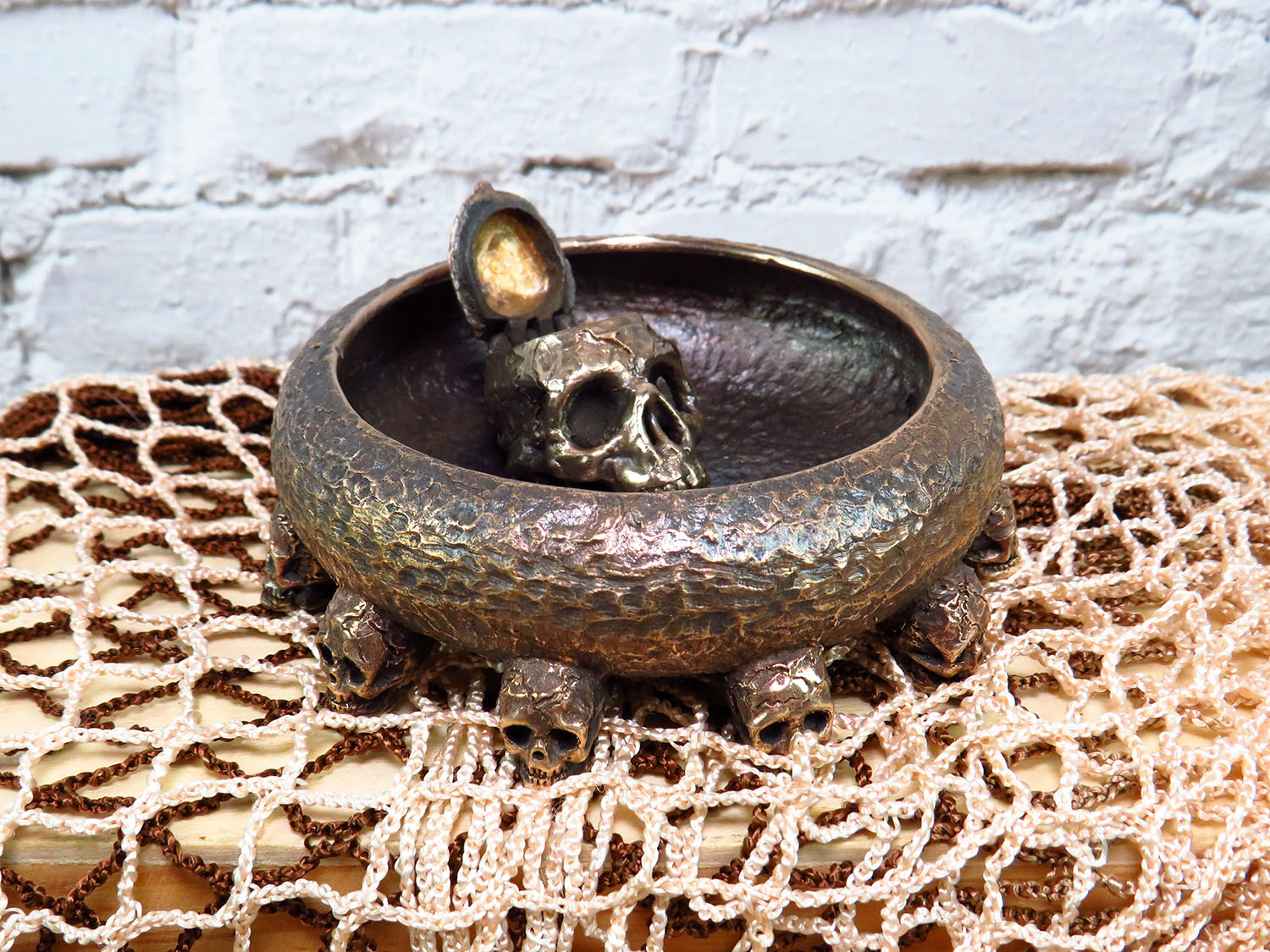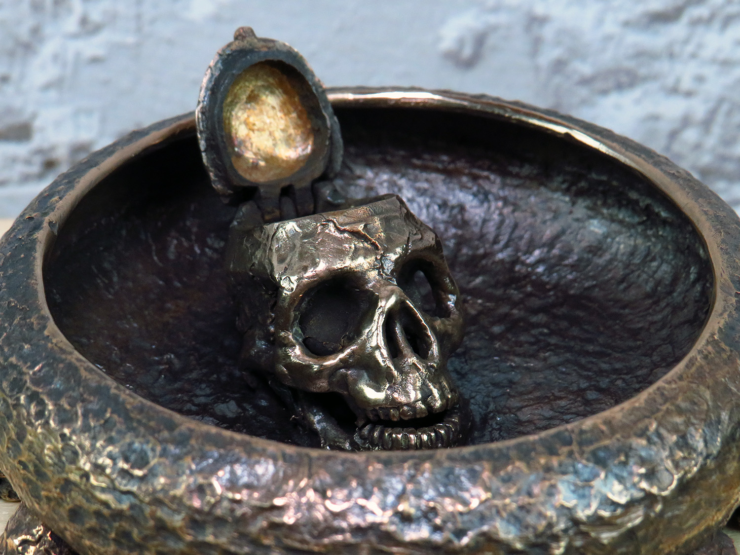 An original bronze ashtray in the Halloween spirit with an opening skull in the middle. It will be a great decoration for the office and a good gift for connoisseurs of creepy and strange things.