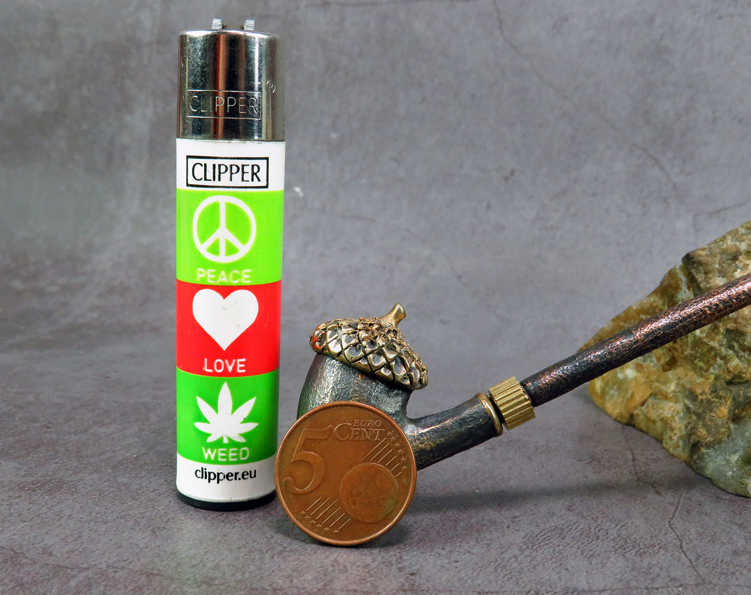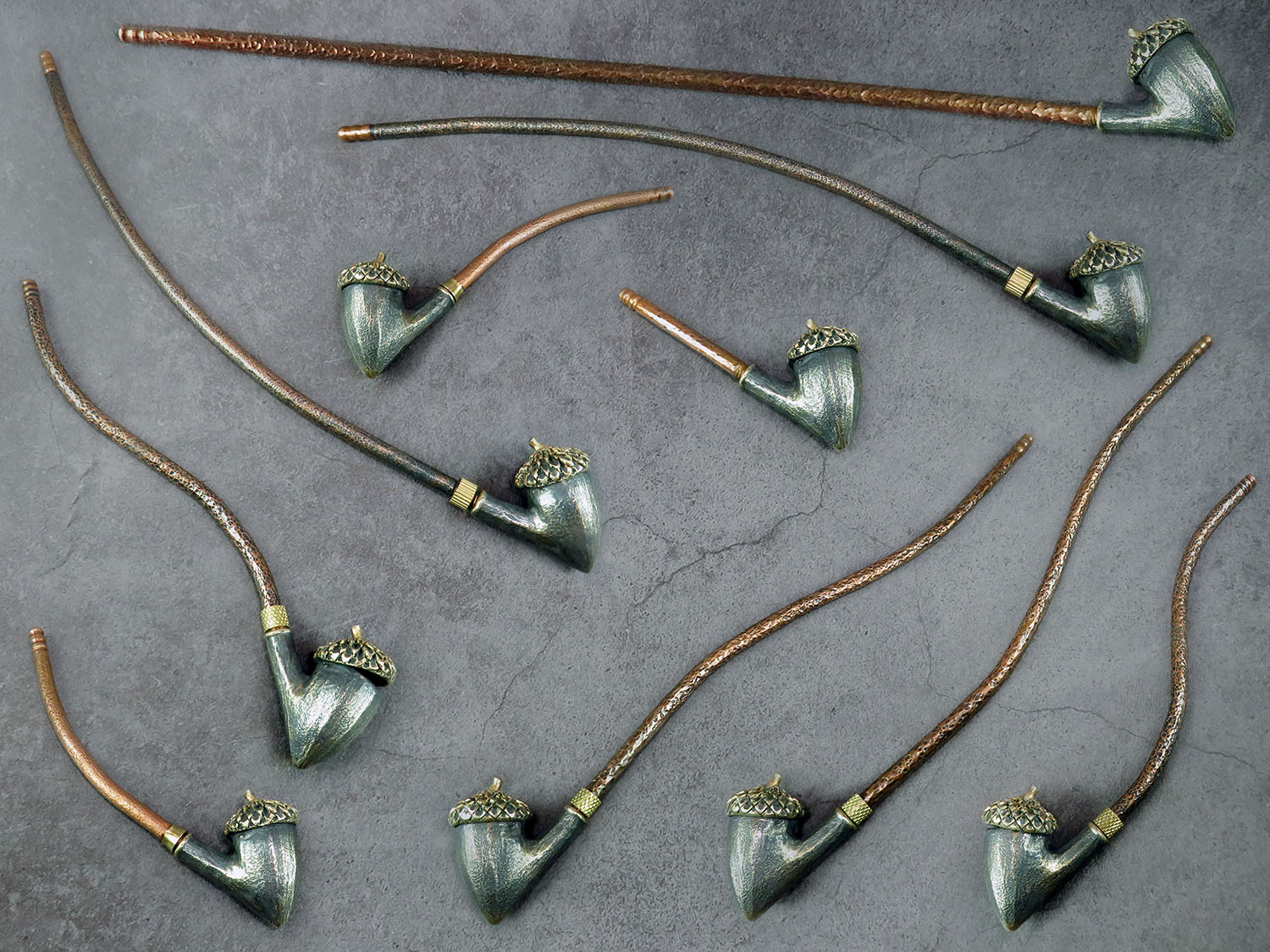 Freehand churchwarden bronze pipe with a bowl in the form of an oak acorn. The mouthpiece is made of copper, it is screwed on, can have a length (from 5 to 30 cm) and a shape at the request of the buyer. The pipe is working, not decorative, the model is tested by the master.