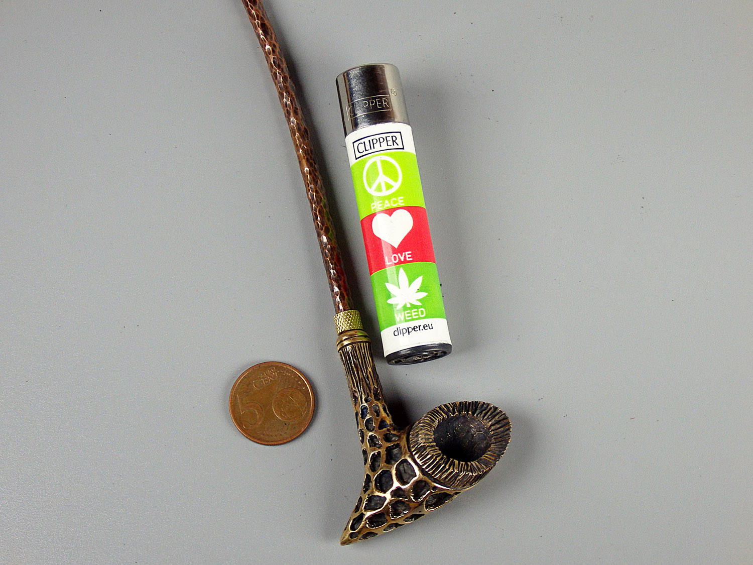 The mouthpiece is made of copper, it is screwed on, can have a length (from 5 to 30 cm) and a shape at the request of the buyer. The pipe is working, not decorative, the model is tested by the master.