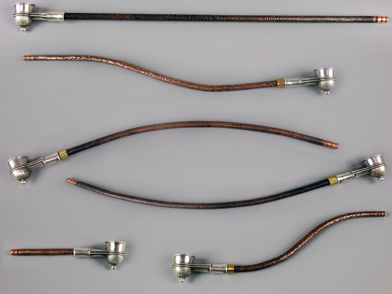 The mouthpiece is made of copper and silver, screwed on, can have a length (from 3 to 30 cm) and a shape at the request of the buyer. The pipe is working, not decorative, the model is tested by the master.