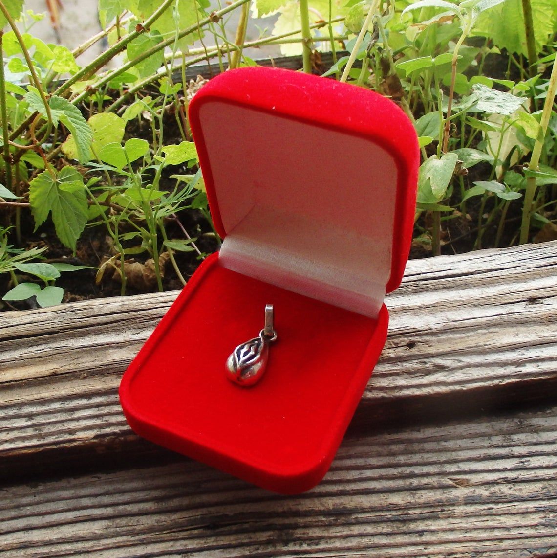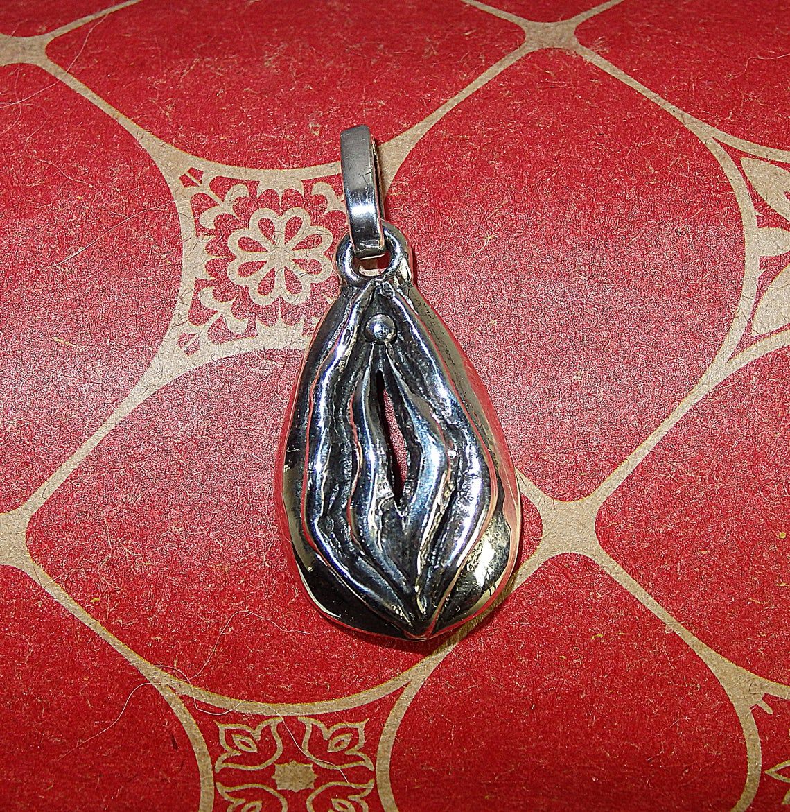 Small silver pendant in the shape of a vagina. Silver jewelry with the initials of a loved one on the inside of the pendant.