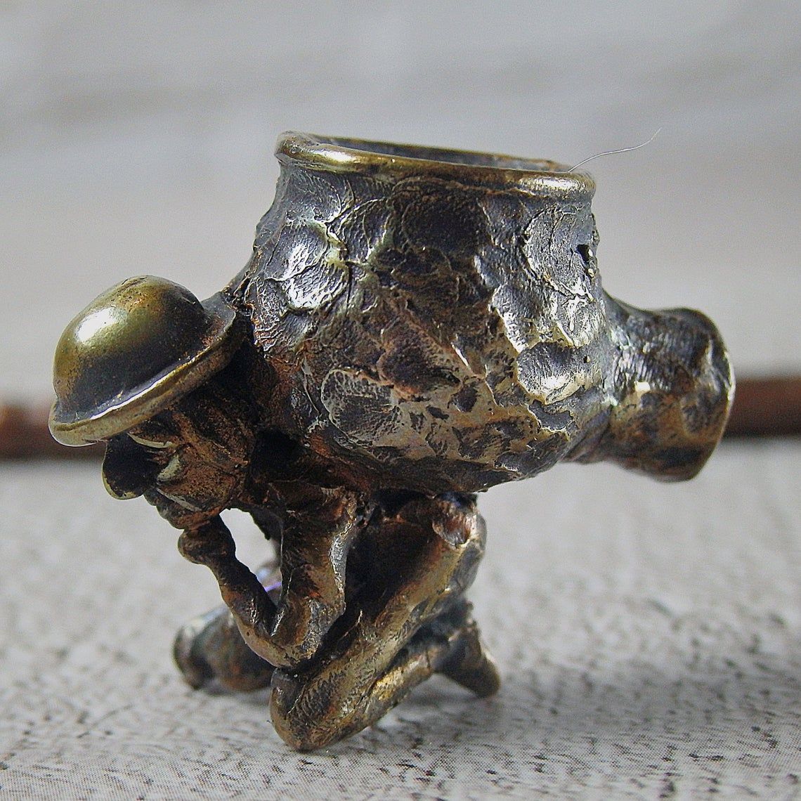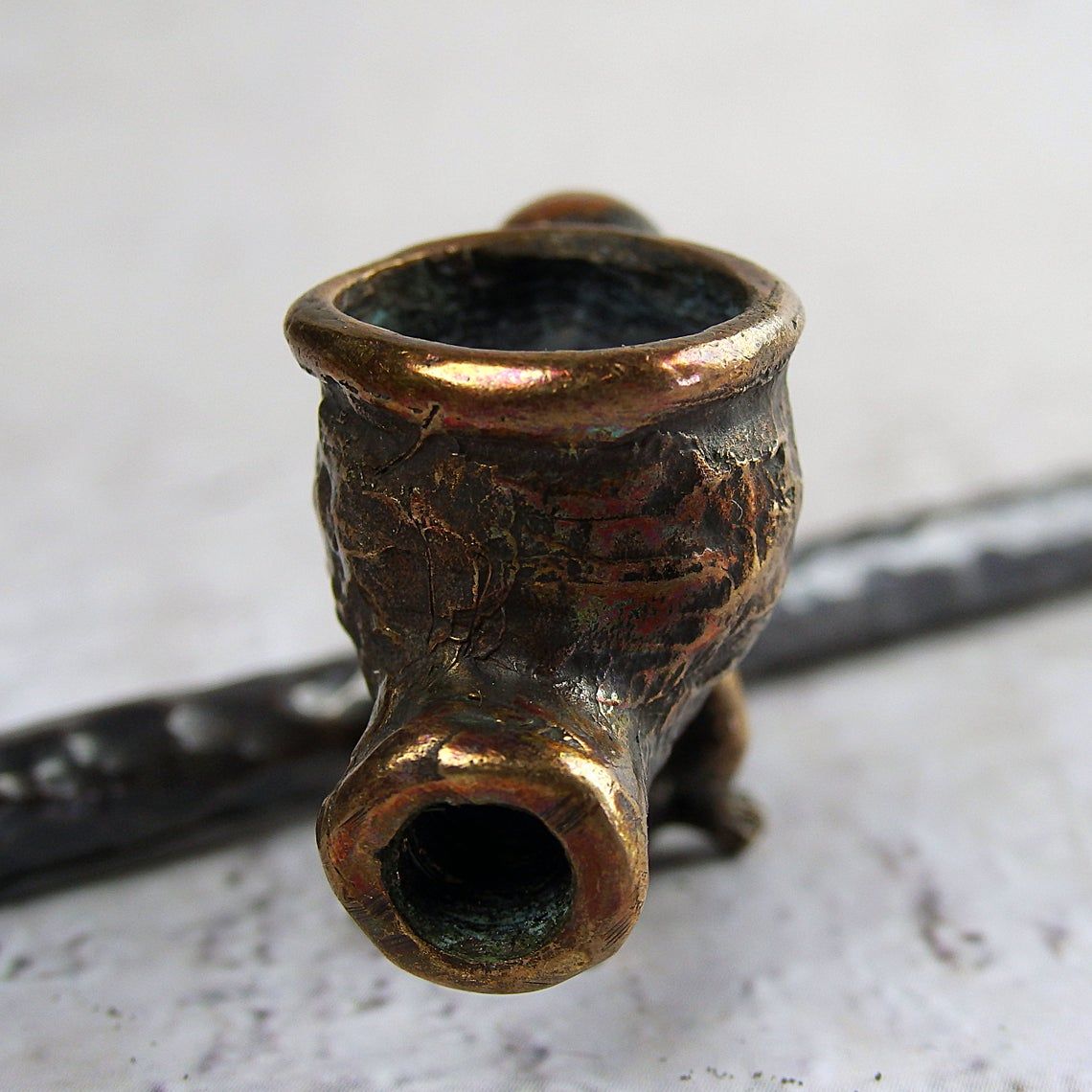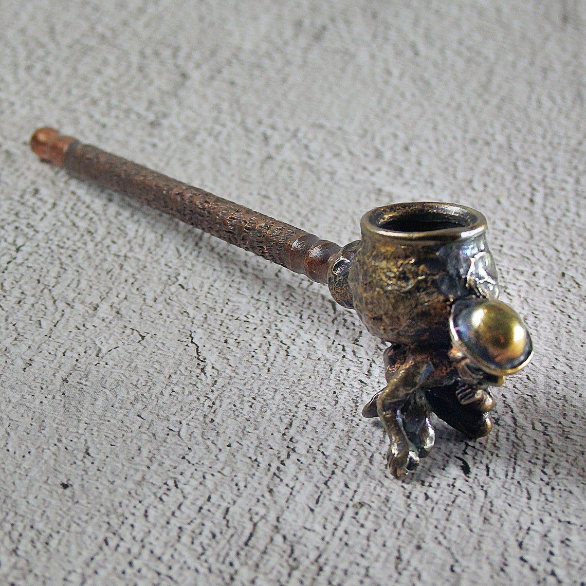 Small bronze smoking pipe with bowl in the shape of a porter carrying a pot-bowl. The mouthpiece is made of copper, it is screwed on, can have a length (from 3 to 30 cm) and a shape at the request of the buyer. The pipe is working, not decorative, the model is tested by the master.