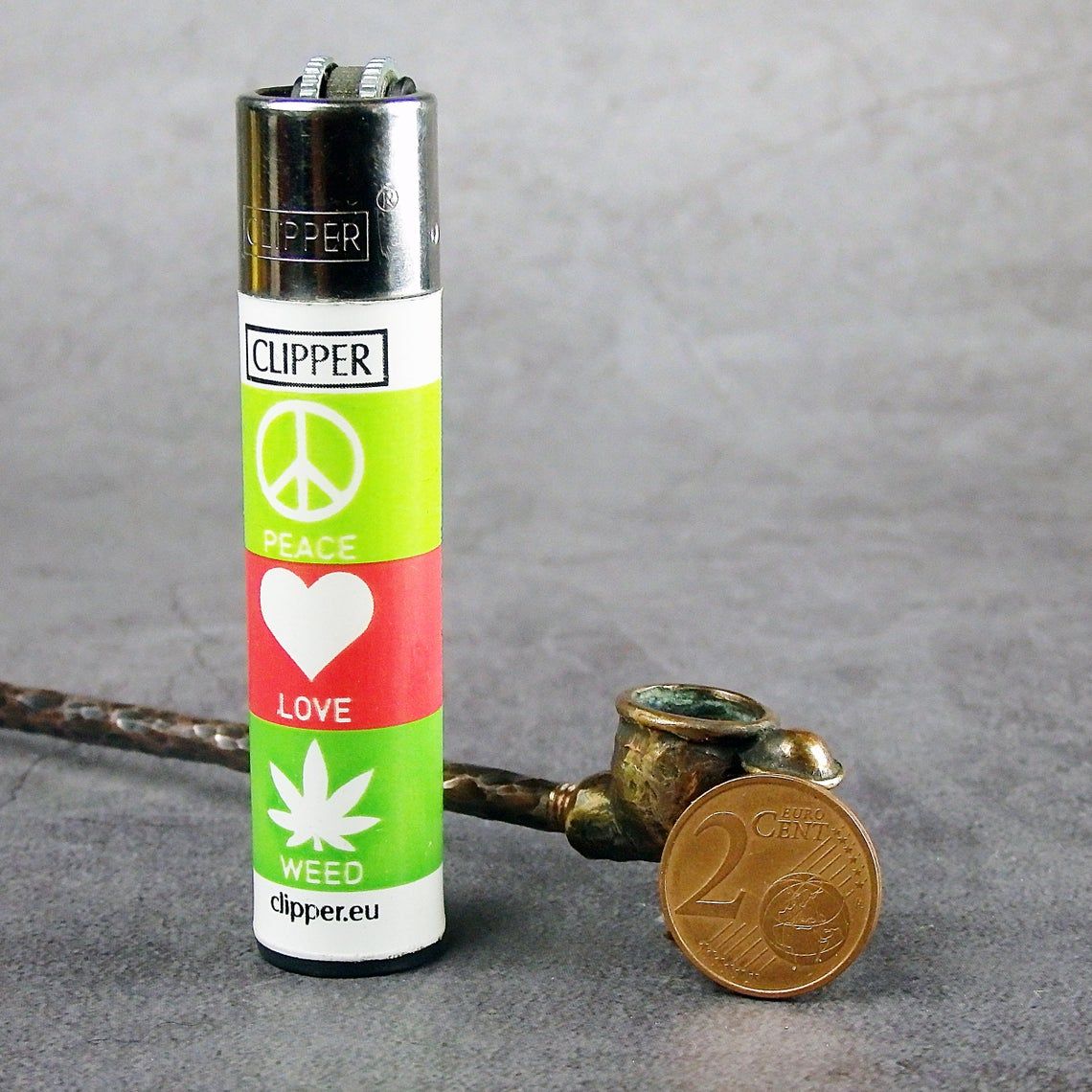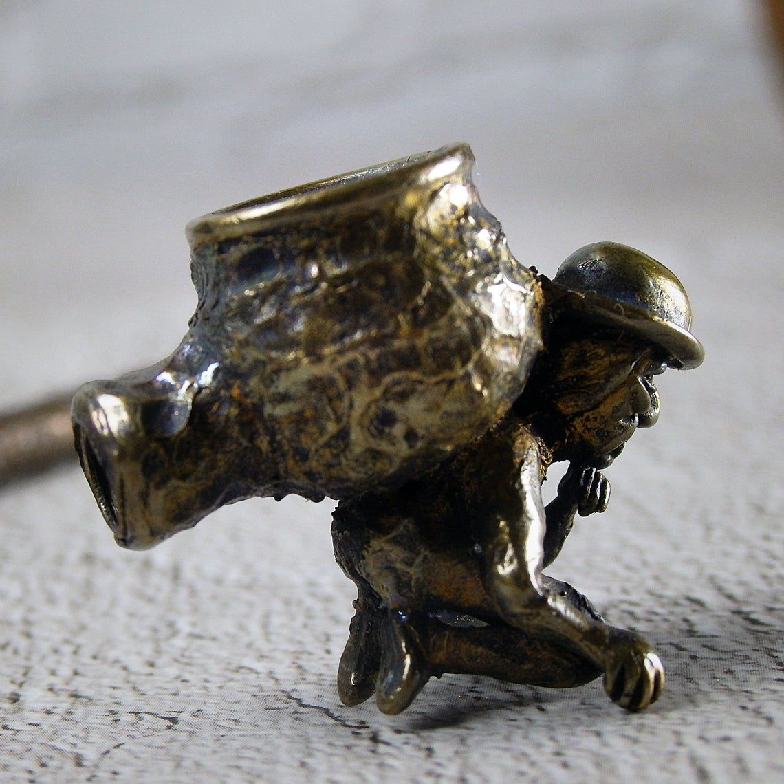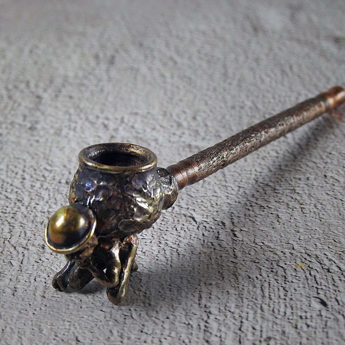 Small bronze smoking pipe with bowl in the shape of a porter carrying a pot-bowl. The mouthpiece is made of copper, it is screwed on, can have a length (from 3 to 30 cm) and a shape at the request of the buyer. The pipe is working, not decorative, the model is tested by the master.