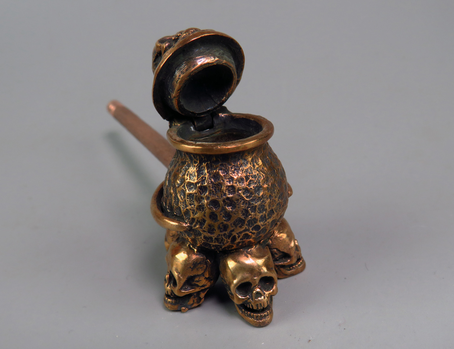 A capacious heavy pipe in the shape of a pot with skulls, on the theme of piracy or brutal gothic. This pipe will be a great thematic gift for the Day of the Dead (Día de Muertos), Halloween, carnival, Comic Con and the like.