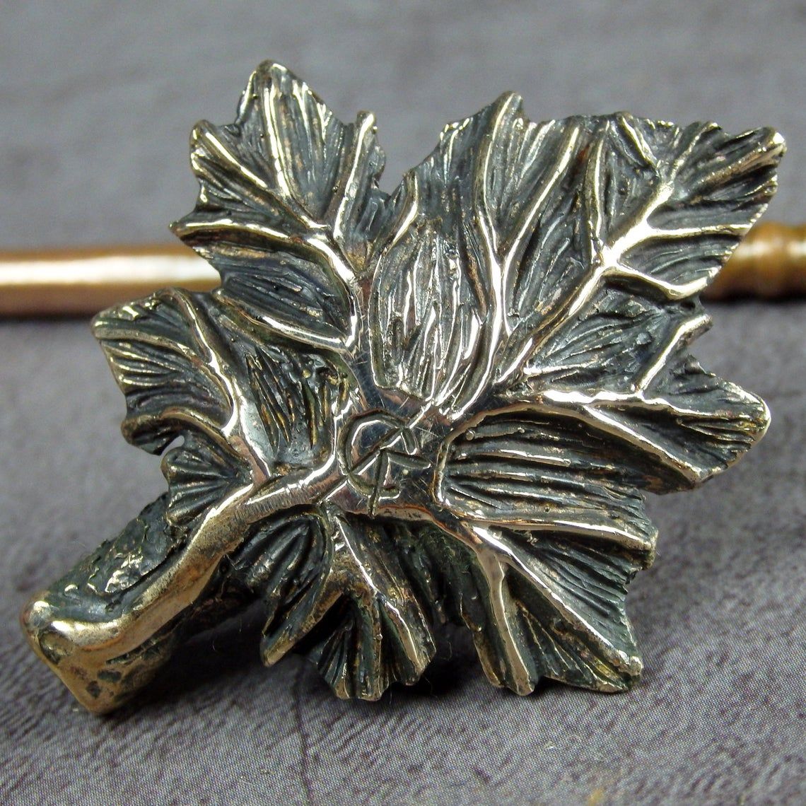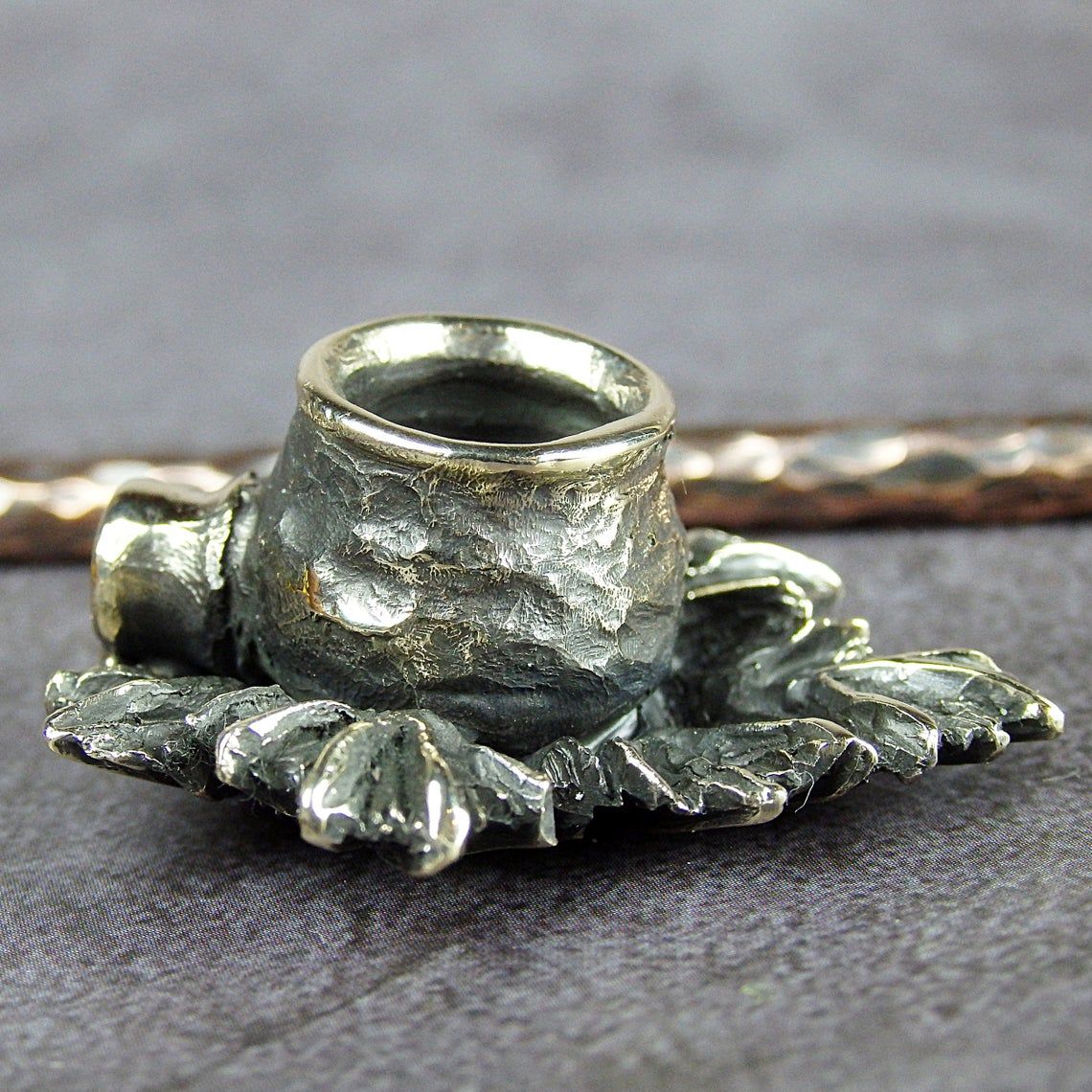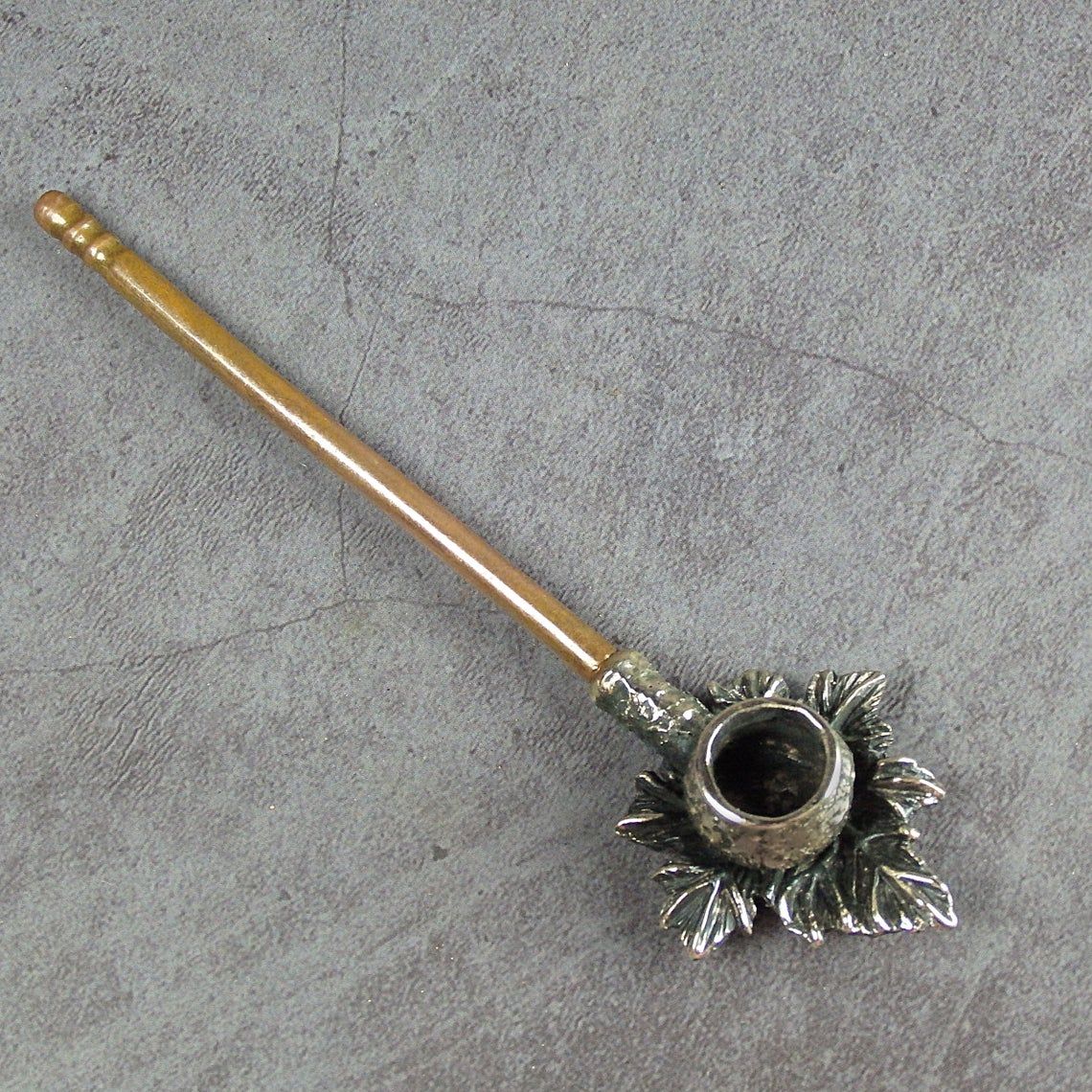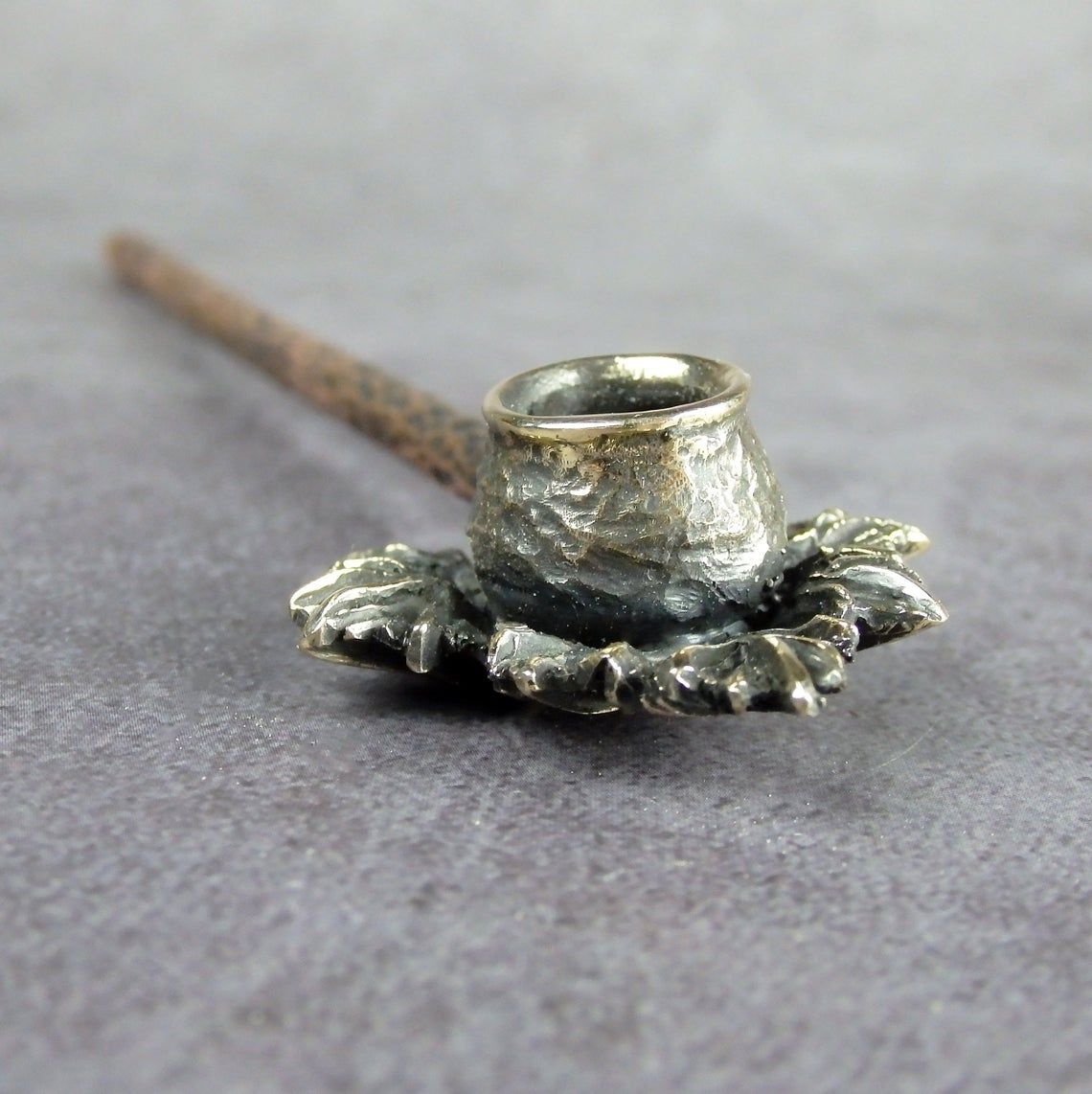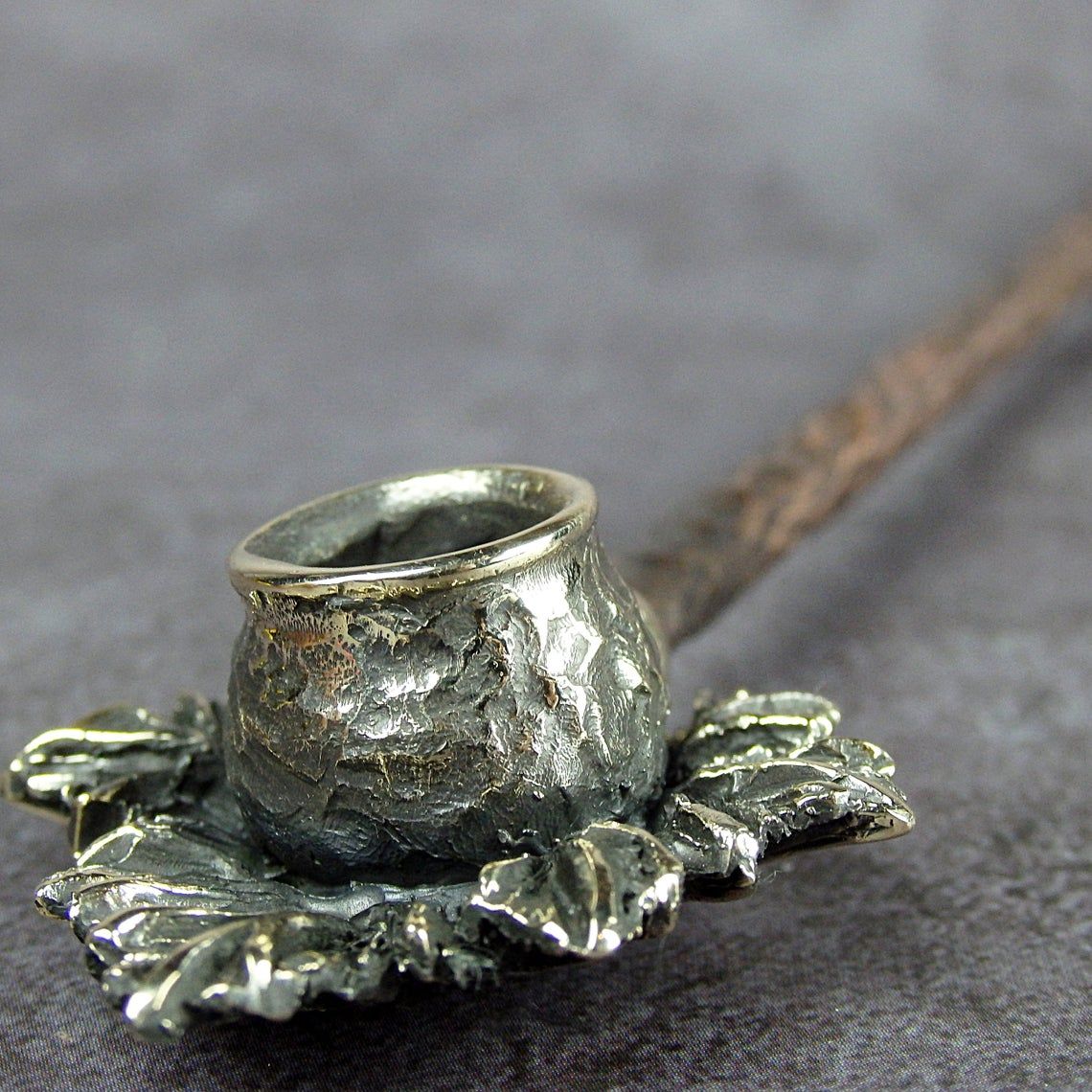 Bronze smoking pipe with a bowl in the shape of pot on the leaf. The mouthpiece is made of copper, it is screwed on, can have a length (from 3 to 30 cm) and a shape at the request of the buyer. The pipe is working, not decorative, the model is tested by the master.