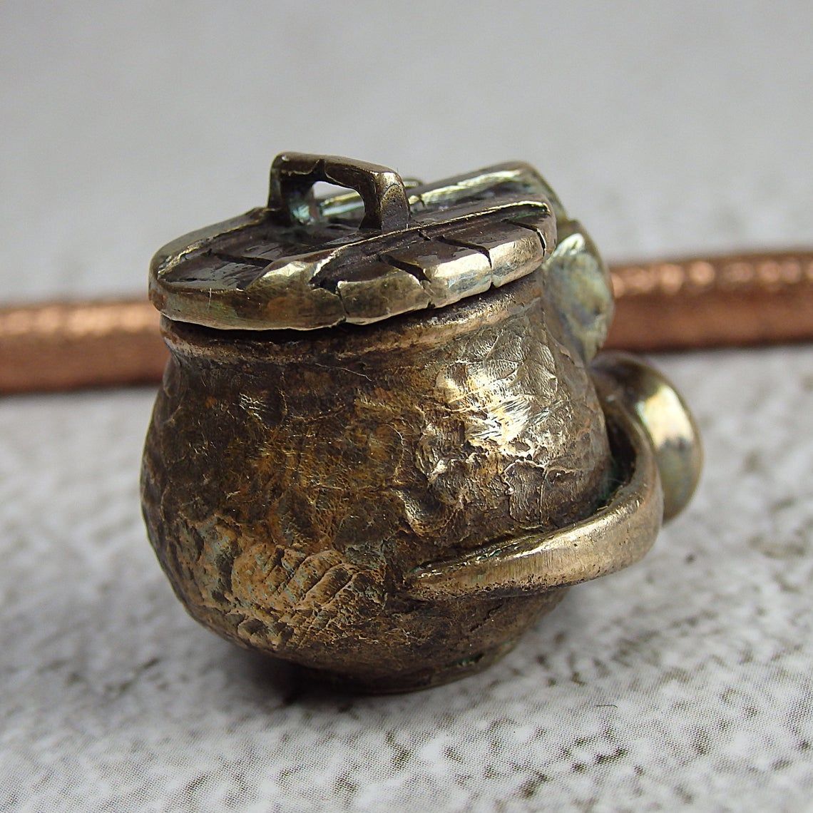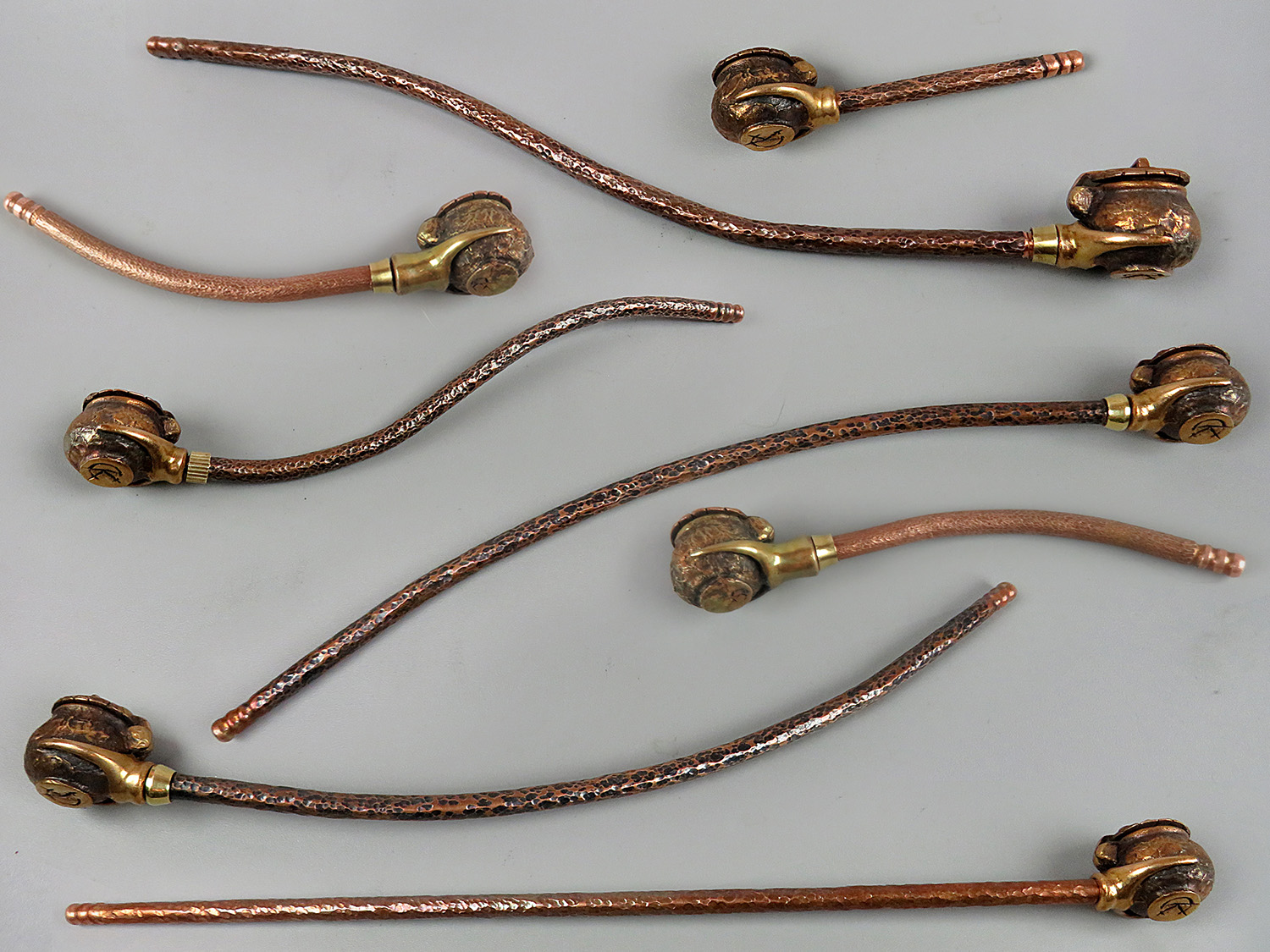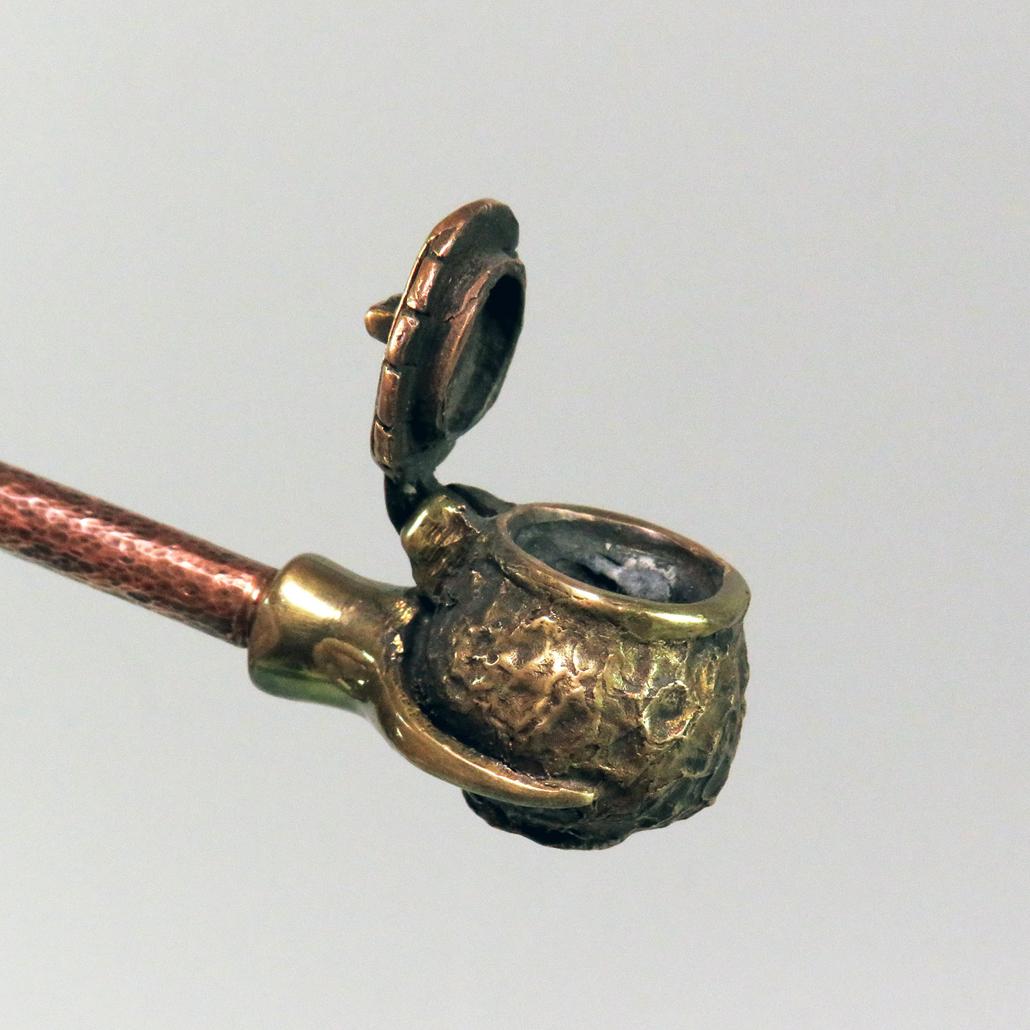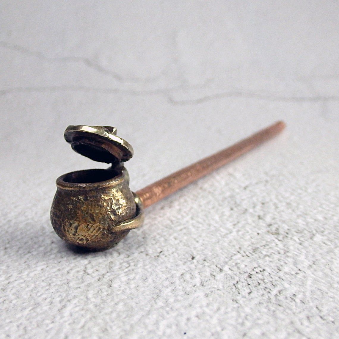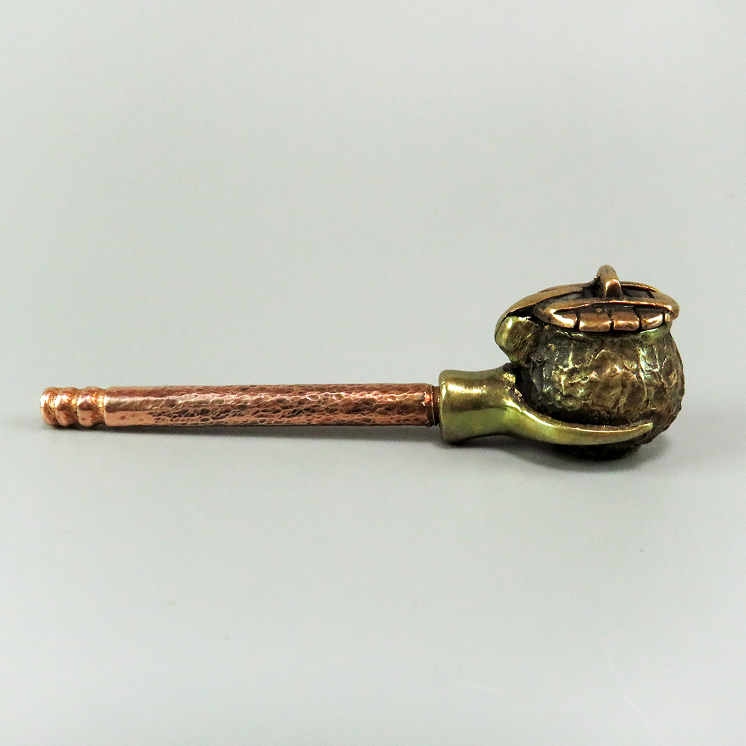 Bronze smoking pipe with a bowl in the shape of a pot with a lid.T his is the simplest and most convenient model, suitable for everyone, just remember that this pipe can stand on a plane only with a straight mouthpiece. The mouthpiece is made of copper, it is screwed on, can have a length (from 3 to 30 cm) and a shape at the request of the buyer.
